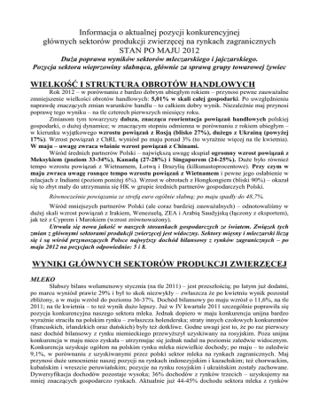Informacja o aktualnej pozycji konkurencyjnej głównych sektorów produkcji zwierzęcej na rynkach zagranicznych STAN PO MAJU 2012 Duża poprawa wyników sektorów mleczarskiego i jajczarskiego. Pozycja sektora wieprzowiny słabnąca, głównie za sprawą grupy towarowej żywiec WIELKOŚĆ I STRUKTURA OBROTÓW HANDLOWYCH Rok 2012 – w porównaniu z bardzo dobrym ubiegłym rokiem – przynosi pewne zauważalne zmniejszenie wielkości obrotów handlowych: 5,01% w skali całej gospodarki. Po uwzględnieniu naprawdę znaczących zmian warunków handlu – to całkiem dobry wynik. Niezależnie maj przynosi poprawę tego wyniku – na tle czterech pierwszych miesięcy roku. Zmianom tym towarzyszy dalsza, znacząca reorientacja powiązań handlowych polskiej gospodarki, o dużej dynamice; w znaczącym stopniu odmienna w porównaniu z rokiem ubiegłym – w kierunku wyjątkowego wzrostu powiązań z Rosją (blisko 27%), dużego z Ukrainą (powyżej 17%). Wzrost powiązań z ChRL wyniósł po maju ponad 3% (to wyraźnie więcej na tle kwietnia). W maju – uwagę zwraca właśnie wzrost powiązań z Chinami. Wśród średnich partnerów Polski – największą uwagę skupiał ogromny wzrost powiązań z Meksykiem (poziom 33-34%), Kanadą (27-28%) i Singapurem (24-25%). Duże było również tempo wzrostu powiązań z Wietnamem, Łotwą i Brazylią (kilkunastoprocentowe). Przy czym w maju zwraca uwagę rosnące tempo wzrostu powiązań z Wietnamem i pewne jego osłabienie w relacjach z Indiami (poziom poniżej 6%). Wzrost w obrotach z Hongkongiem (bliski 90%) – okazał się to zbyt mały do utrzymania się HK w grupie średnich partnerów gospodarczych Polski. Równocześnie powiązania ze strefą euro ogólnie słabną; po maju spadły do 48,7%. Wśród mniejszych partnerów Polski (ale coraz bardziej zauważalnych) – odnotowaliśmy w dużej skali wzrost powiązań z Irakiem, Wenezuelą, ZEA i Arabią Saudyjską (łączony z eksportem), jak też z Cyprem i Marokiem (wzrost zrównoważony). Utrwala się nowa jakość w naszych stosunkach gospodarczych ze światem. Związek tych zmian z głównymi sektorami produkcji zwierzęcej jest widoczny. Sektory mięsny i mleczarski liczą się i są wśród przynoszących Polsce najwyższy dochód bilansowy z rynków zagranicznych – po maju 2012 na pozycjach odpowiednio: 5 i 8. WYNIKI GŁÓWNYCH SEKTORÓW PRODUKCJI ZWIERZĘCEJ MLEKO Słabszy bilans wolumenowy stycznia (na tle 2011) – jest przeszłością; po lutym już dodatni, po marcu wyniósł prawie 29% i był to skok niezwykły – zwłaszcza że po kwietniu wynik pozostał zbliżony, a w maju wzrósł do poziomu 36-37%. Dochód bilansowy po maju wzrósł o 11,6%, na tle 2011; na tle kwietnia – to też wynik dużo lepszy. Już w IV kwartale 2011 szczególnie poprawiła się pozycja konkurencyjna naszego sektora mleka. Jednak dopiero w maju konkurencja unijna bardzo wyraźnie straciła na polskim rynku – zwłaszcza holenderska; straty innych czołowych konkurentów (francuskich, irlandzkich oraz duńskich) były też dotkliwe. Godne uwagi jest to, że po raz pierwszy nasz dochód bilansowy z rynku niemieckiego przewyższył uzyskiwany na rosyjskim. Poza unijna konkurencja w maju nieco zyskała – utrzymując się jednak nadal na poziomie zaledwie widocznym. Konkurencja uzyskuje ogółem na polskim rynku mleka niewielkie dochody; po maju – to zaledwie 9,1%, w porównaniu z uzyskiwanymi przez polski sektor mleka na rynkach zagranicznych. Maj przynosi duże umocnienie naszej pozycji na rynkach indonezyjskim i kazachskim; też chorwackim, kubańskim i wreszcie peruwiańskim; pozycje na rynku rosyjskim i ukraińskim zostały zachowane. Dywersyfikacja dochodów pozostaje wysoka; 36% dochodów z rynków trzecich – uzyskujemy na mniej znaczących gospodarczo rynkach. Aktualnie już 44-45% dochodu sektora mleka z rynków zagranicznych uzyskujemy na rynkach trzecich; tendencję wzrostu tej cyfry widać w tym roku stale. MIĘSO DROBIOWE Dochody bilansowe po kwietniu (na tle 2011) wzrosły blisko 20%, a więc w stopniu na tyle dużym, że zwraca to uwagę. Z drugiej strony sektor mleka w kwietniu zanotował wzrost dochodów ponownie na tyle wysoki, że zachował pierwsze miejsce w dochodach z rynków zagranicznych – wyprzedzając (poziom 6-7%) sektor mięsa drobiu. Dużo lepszy był również bilans wolumenowy – o 24,86%. Wyniki (na tle 2011) cechuje dalsza poprawa; przekonują o utrzymywaniu się bardzo dobrych tendencji wielu ostatnich miesięcy. Walka o lepszą pozycję konkurencyjną trwa – przynosi coraz lepsze rezultaty. Mimo względnej równowagi we wzroście dochodów bilansowych z rynku UE i trzecich – w marcu i kwietniu (po krótkiej przerwie) – wróciła tendencja do obniżania się dochodów z rynków trzecich, z II półrocza 2011; udział ten wyniósł po kwietniu poniżej 9%. Dość stabilna była nasza pozycja na trzech rynkach trzecich, dla sektora mięsa drobiowego znaczących: Hongkongu, Ukrainie i Beninie; kwiecień ją nieco osłabił – za sprawą Hongkongu. Przyniósł także poprawę sytuacji na rynku rosyjskim, a zwłaszcza białoruskim. Konkurencja jest słaba; po kwietniu utrzymywała się na poziomie poniżej 1% dochodu bilansowego – w porównaniu z uzyskiwanym przez polski sektor mięsa drobiu na zagranicznych rynkach. Nieco zyskali konkurenci włoscy, a z mniej liczących się – zwłaszcza fińscy i portugalscy. WOŁOWINA Odnotowano w roku 2012 spadek na trzecią pozycję w tworzeniu dochodu bilansowego z rynków zagranicznych – wśród głównych sektorów produkcji zwierzęcej (wynik 3-4% słabszy na tle sektora mięsa drobiu po kwietniu). Ważniejsze cyfry – wskazujące na duże pogorszenie sytuacji na tle (bardzo dobrego) roku 2011: 19,43% spadku dochodu bilansowego i 18,83% gorszy bilans wolumenowy; to po kwietniu. W marcu złamano tendencję niższego udziału rynków trzecich w dochodach (po kwietniu 24,25%). Podobnie jak w sektorze mięsa dr