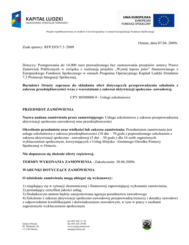 Projekt współfinansowany ze środków Unii Europejskiej w ramach Europejskiego Funduszu Społecznego Orneta, dnia 07.04..2009r. Znak sprawy: RFP.EFS/7.3 /2009 Dotyczy: Postępowania do 14.000 euro prowadzonego bez zastosowania przepisów ustawy Prawo Zamówień Publicznych w związku z realizacją projektu „Wyśnij lepsze jutro” finansowanego z Europejskiego Funduszu Społecznego w ramach Programu Operacyjnego Kapitał Ludzki Działanie 7.3 Promocja Integracji Społecznej. Burmistrz Ornety zaprasza do składania ofert dotyczących przeprowadzenia szkolenia z zakresu przedsiębiorczości wraz z warsztatami z zakresu aktywizacji społeczno- zawodowej. CPV 80500000-9 - Usługi szkoleniowe PRZEDMIOT ZAMÓWIENIA Nazwa nadana zamówieniu przez zamawiającego: Usługa szkoleniowa z zakresu przeprowadzenia aktywizacji społeczno-zawodowej oraz przedsiębiorczości Określenie przedmiotu oraz wielkości lub zakresu zamówienia: Przedmiotem zamówienia jest usługa szkoleniowa z zakresu przedsiębiorczości (10 dni – 70 godz.) poprzedzonego szkoleniem z zakresu aktywizacji społeczno –zawodowej (5 dni – 30 godz.) dla 16 osób zagroŜonych wykluczeniem społecznym, korzystających z Usług Miejsko –Gminnego Ośrodka Pomocy Społecznej w Ornecie. Nie dopuszcza się złoŜenie oferty częściowej. TERMIN WYKONANIA ZAMÓWIENIA : Zakończenie: 30.06.2009r. WARUNKI DOTYCZĄCE ZAMÓWIENIA O udzielenie zamówienia mogą ubiegać się wykonawcy: 1) znajdujący się w sytuacji ekonomicznej i finansowej zapewniającej wykonanie zamówienia, 2) posiadający certyfikat jakości usług, 3) Dodatkowym atutem będzie zarejestrowana agencja poradnictwa zawodowego 4) Szkolenie z zakresu aktywizacji społeczno-zawodowej przeprowadzą trenerzy i doradcy zawodowi z odpowiednimi kwalifikacjami i doświadczeniem zawodowym, w tym w pracy z osobami zagroŜonymi wykluczeniem społecznym. Gmina Orneta Pl. Wolności 26 11-130 Orneta tel. 055 242 11 16 fax 055 242 29 00 www.umig.orneta.net [email protected] Projekt współfinansowany ze środków Unii Europejskiej w ramach Europejskiego Funduszu Społecznego 5) Szkolenie z zakresu przedsiębiorczości będzie przeprowadzone w sposób dostępny dla osób o niskim wykształceniu. Będzie zawierało elementy jak załoŜyć własną działalność gospodarczą i skąd pozyskiwać na ten cel fundusze. Powinno być wzbogacone o innowacyjne techniki. Firma szkoląca zapewni materiały i wszelkie atrybuty niezbędne do przeprowadzenia szkolenia. Za wynajęcie Sali szkoleniowej odpowiedzialna będzie firma szkoleniowa w ramach oferty cenowej. Za wypłatę kosztów dojazdów beneficjentom projektu będzie odpowiedzialna firma szkoleniowa. Gmina Orneta zrefunduje w/w koszty po przedstawieniu f-ry wraz z listą obecności beneficjentów na szkoleniu i rozliczeniem w/w kosztów dojazdu. Firma szkoleniowa zapewni monitoring procesu szkolenia: kaŜdy uczestnik będzie 3 razy monitorowany. Na zakończenie szkolenia firma przekaŜe sprawozdanie z monitoringu Pomieszczenie, w którym będą odbywały się szkolenia powinno być oznakowane zgodnie z wytycznymi dotyczącymi oznaczania projektów w ramach Programu Operacyjnego Kapitał Ludzki. Firma szkoleniowa będzie zobowiązana do umieszczenia informacji o szkoleniu współfinansowanym przez EFS na stronie www.inwestycjawkadry.pl, oraz przez okres trwania szkolenia co najmniej raz w m-cu do aktualizacji tej oferty. Informacja o oświadczeniach i dokumentach, jakie mają dostarczyć wykonawcy w celu potwierdzenia spełniania warunków udziału w postępowaniu: Oferta winna zawierać następujące dokumenty sporządzone w języku polskim: a) oświadczenie, Ŝe oferent przyjął do wiadomości i akceptacji warunki podane przez Zamawiającego b) informacje o cenie ogólnej szkolenia oraz przeszkolenia jednej osoby ( podana słownie i cyfrowo) c) aktualne zaświadczenie o wpisie do rejestru instytucji szkoleniowych. d) aktualnego odpisu z właściwego rejestru albo aktualnego zaświadczenia o wpisie do ewidencji działalności gospodarczej, jeŜeli odrębne przepisy wymagają wpisu e) dokument wskazujący osoby uprawnione do składania oświadczenia woli w imieniu oferenta.. f) posiadane przez instytucję szkoleniowa certyfikaty jakości usług np. atesty, akredytacje itp. g) szczegółowy preliminarz kosztów h) wykaz osób, które będą uczestniczyć w wykonaniu zamówienia i) program szkolenia j) wykaz materiałów szkoleniowych udostępnianych uczestnikom szkolenia podczas szkolenia oraz przekazywanych uczestnikom na własność k) informację o miejscu przeprowadzenia zajęć (opis warunków lokalowych). l) wykazu wykonywanych w okresie ostatnich trzech lat szkoleń objętych przedmiotem zamówienia wraz z dokumentami potwierdzającymi, Ŝe usługa szkolenia wskazana w wykazie została prawidłowo wykonana ł) wzór zaświadczenia jaki zostanie wydany uczestnikom szkolenia po jego zakończeniu Gmina Orneta Pl. Wolności 26 11-130 Orneta tel. 055 242 11 16 fax 055 242 29 00 www.umig.orneta.net [email protected] Projekt współfinansowany ze środków Unii Europejskiej w ramach Europejskiego Funduszu Społecznego m) Oświadczenie Wykonawcy, o posiadaniu uprawnień oraz odpowiednich kwalifikacji i warunków do naleŜytego wykonania przedmiotu umowy zgodnie z Rozporządzeniem Ministra Edukacji i Nauki z dnia 3 lutego 2006r. w sprawie uzyskiwania i uzupełniania przez osoby dorosłe wiedzy ogólnej, umiejętności i kwalifikacji zawodowych w formach pozaszkolnych (DZ.U. nr 31, poz.216) n) Oświadczenie Wykonawcy o wyraŜeniu zgody na przetwarzanie danych osobowych dla potrzeb niezbędnych do realizacji, sprawozdawczości i kontroli projektu - zgodnie z ustawą O ochronie danych osobowych.. KRYTERIA OCENY OFERT Kryteria oceny ofert: cena oraz dodatkowe kryteria i ich znaczenie: • • • 1 - Cena - 35 2 - kwalifikacje i doświadczenie kadry dydaktycznej oraz doświadczenie instytucji szkoleniowej - 30 3 - program szkolenia i materi