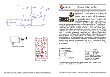 + Uzas C5 100uF GND C6 100nF C4 47uF JABEL ® J-013N G³oœnomówi¹cy telefon SP C3 6 C1 8 IN 1 US1 1uF 2 R1 10k 220pF 7 3 TBA820M R2 33 4 C7 5 470uF R3 1 L1 P1 47...100k C2 100uF C8 100nF IN Schemat ideowy Urz¹dzenie to s³u¿y do pods³uchiwania rozmowy telefonicznej i odtwarzania jej w g³oœniku. W uk³adzie wzmacniacza mocy pracuje uk³ad scalony TBA820M. Uk³ad ten cechuje szeroki zakres napiêæ zasilania, wysoka sprawnoœæ energetyczna, ma³a liczba wymaganych elementów zewnêtrznych oraz ma³y pobór pr¹du w stanie spoczynkowym. Opisany uk³ad dostarcza l,5W mocy wyjœciowej przy zastosowaniu g³oœnika o opornoœci 4Ù i zasilaniu 9V. Urz¹dzenie dzia³a poprawnie zaraz po zmontowaniu i praktycznie nie wymaga ¿adnych regulacji. Cewkê indukcyjn¹ nale¿y pod³¹czyæ do wejœcia wzmacniacza przewodem ekranowanym. Przed przylutowaniem przewodów koñcówki drutu nawojowego nale¿y oczyœciæ z emalii i dok³adnie ocynowaæ. Wskazane jest równie¿ sprawdzenie omomierzem czy cewka posiada "przejœcie". Cewkê najlepiej jest wkleiæ do wnêtrza kubka ferrytowego klejem wodoodpornym pamiêtaj¹c o zabezpieczeniu jej koñcówek przed wyrwaniem. Cewkê nale¿y umieœciæ na obudowie aparatu telefonicznego. Najlepsze jej po³o¿enie nale¿y wybraæ doœwiadczalnie kieruj¹c siê najwiêksz¹ si³¹ g³osu. W niektórych typach aparatów telefonicznych najlepsze efekty uzyskuje siê umieszczaj¹c cewkê pod aparatem. Schemat po³¹czenia WYKAZ ELEMENTÓW: Schemat monta¿owy US1.......TBA820M P1......pot. z oœk¹ 10kÙ/A R1.........10kÙ R2.........33Ù R3..........1Ù C1.................1-2,2ìF/16V C2.................100ìF/16V C3..................220pF C4..................47ìF/16V C5, C7............470ìF/16V C6, C8............100nF L1.........CEWKA INDUKCYJNA KUBEK FERYTOWY 26/16 P£YTKA DRUKOWANA ZACISK BATERII 9V W urz¹dzeniu tym mo¿na u¿yæ g³oœnika dowolnego typu o mocy >1,5W i opornoœci 4-15Ù. Zasilanie z baterii 9V. PPHU JABEL s.c. 76-270 Ustka ul. S³upska 3, tel./fax (+48 59) 814 56 66, www.jabel.com.pl, e-mail:[email protected] PPHU JABEL s.c. 76-270 Ustka ul. S³upska 3, tel./fax (+48 59) 814 56 66, www.jabel.com.pl, e-mail:[email protected]