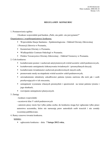 IT/PT/PZ/01/03 Data wydania: 2006-08-18 Strona 1 (5) REGULAMIN KONKURSU 1. Postanowienia ogólne: ▪ Konkurs wojewódzki pod hasłem „Palić, nie palić- oto jest pytanie?” Organizatorzy i współorganizatorzy konkursu: Wojewódzka Stacja Sanitarno - Epidemiologiczna - Oddział Oświaty Zdrowotnej i Promocji Zdrowia w Poznaniu, Kuratorium Oświaty w Poznaniu, Wielkopolskie Centrum Onkologii w Poznaniu. Polskie Towarzystwo Oświaty Zdrowotnej – Oddział Terenowy w Poznaniu. 2. Cele konkursu: kształtowanie postaw i zachowań antytytoniowych wśród uczniów szkół podstawowych, kształtowanie umiejętności dokonywania świadomych i przemyślanych decyzji, kształtowanie świadomości zachowań prozdrowotnych innych osób, promowanie mody na niepalenie wśród uczniów szkół podstawowych, uświadomienie młodzieży szkodliwości palenia tytoniu zarówno dla nich jak i osób przebywających w ich otoczeniu, umiejętność wyrażania własnych przemyśleń i spostrzeżeń na temat palenia tytoniu i jego skutkach, rozwijanie umiejętności plastycznych. 3. Zasięg: - konkurs wojewódzki - uczniowie klas V szkół podstawowych - autorem pracy może być tylko jedna osoba; do konkursu mogą być zgłaszane tylko prace autorstwa uczestnika, które nie naruszają praw autorskich osób trzecich i nie zostały wcześniej publikowane. 4. Ramy czasowe trwania konkursu. terminy: ogłoszenie konkursu – dnia 7 lutego 2012 roku, IT/PT/PZ/01/03 Data wydania: 2006-08-18 Strona 2 (5) etap do szkolny: podsumowanie odpowiedniej konkursu powiatowej i nadesłanie stacji pracy ze szkoły sanitarno-epidemiologicznej– do dnia 31 marca 2012 roku, etap powiatowy: impreza powiatowa z podsumowaniem konkursu, nadesłanie pracy z powiatowej stacji sanitarno-epidemiologicznej do Wojewódzkiej Stacji Sanitarno– Epidemiologicznej– do dnia 18 kwietnia 2012 roku, etap wojewódzki: posiedzenie Wojewódzkiej Komisji Konkursowej– dnia 27 kwietnia 2012 roku, uroczystość finałowa w Poznaniu – dnia 24 maja 2012 roku.. 5. Ustala się zakres tematyczny. zapobieganie paleniu tytoniu wśród młodzieży szkolnej kolaże powinny ukazywać skutki zdrowotne biernego palenia 6. Określa się zasady przeprowadzenia konkursu: Stworzenie kolażu pt.: Nie zadymiaj otoczenia! Nie zadymiaj mnie! Uczniowie mają możliwość wykonania pracy twórczej w której przedstawią zagrożenia zdrowotne dla osób będących biernymi palaczami. przesłanie kolażu powinno wskazywać na skutki zdrowotne bycia biernym palaczem praca powinna zostać wykonana techniką kolażu Kolaż (fr. collage) jest kompozycją artystyczną stworzoną z fragmentów różnych przedmiotów i kawałków tworzyw takich jak papier, piasek, słoma, tekstylia itp. przyklejonych na papierze lub płótnie, połączonych często z rysunkiem lub malarstwem. Praca powinna zostać wykonana przez ucznia samodzielnie, nauczyciel lub rodzice mogą jedynie służyć radą, Praca powinna zostać wykonana ręcznie w formacie jednostronnym, na arkuszu A3 (29,7cm x 42cm), liczba etapów - konkurs składa się z czterech etapów: klasowego, szkolnego, powiatowego, wojewódzkiego. osoby odpowiedzialne za przeprowadzenie poszczególnych etapów: etap klasowy: nauczyciel biologii, plastyki etap szkolny: szkolny koordynator wychowania zdrowotnego, nauczyciel, IT/PT/PZ/01/03 Data wydania: 2006-08-18 Strona 3 (5) etap powiatowy: pracownik pionu oświaty zdrowotnej i promocji zdrowia powiatowej stacji sanitarno-epidemiologicznej, etap wojewódzki: pracownicy Oddziału Oświaty Zdrowotnej i Promocji Zdrowia Wojewódzkiej Stacji Sanitarno-Epidemiologicznej w Poznaniu. liczba uczestników przechodzących do dalszych etapów: z etapu klasowego do szkolnego: I miejsce z poszczególnych klas biorących udział w konkursie, z etapu szkolnego do powiatowego: I miejsce w etapie szkolnym, z etapu powiatowego do wojewódzkiego: I miejsce w etapie powiatowym. sposób przekazywania prac konkursowych do kolejnych etapów - praca opatrzona powinna być godłem/hasłem umieszczonym na drugiej stronie pracy i na kopercie; w zamkniętej kopercie należy umieścić dokładne i czytelne dane autora: imię i nazwisko, adres szkoły, telefon, informację o zrzeczeniu się praw autorskich oraz zgodę przedstawiciela ustawowego dziecka, które nie ukończyło 18. roku życia na udział w konkursie (załącznik nr 1). adres, pod który należy przesłać prace konkursowe: etap powiatowy - Powiatowa Stacja Sanitarno - Epidemiologiczna właściwa dla siedziby szkoły. etap wojewódzki - Wojewódzka Stacja Sanitarno-Epidemiologiczna – Oddział Oświaty Zdrowotnej i Promocji Zdrowia, 61-680 Poznań, Os. Przyjaźni 118. 7. Zasady oceny oraz skład komisji konkursowej a) ocenie podlegać będzie: zgodność z regulaminem, pomysłowość, estetyka pracy, poprawność i trafność argumentów. b) skład komisji konkursowej: etap szkolny: nauczyciel biologii, plastyki, przedstawiciel samorządu uczniowskiego, przedstawiciel medycyny szkolnej, etap powiatowy: pracownik oświaty zdrowotnej i promocji zdrowia Powiatowej Stacji Sanitarno-Epidemiologicznej, plastyk, przedstawiciel samorządu lokalnego, etap wojewódzki: pracownicy Oddziału Oświaty Zdrowotnej i Promocji Zdrowia Wojewódzkiej Stacji Sanitarno-Epidemiologicznej w Poznaniu, przedstawiciel IT/PT/PZ/01/03 Data wydania: 2006-08-18 Strona 4 (5) Kuratorium Oświaty w Poznaniu, przedstawiciel Polskiego Towarzystwa Oświaty Zdrowotnej - Oddziału Terenowego w Poznaniu, plastyk. 8. Zasady nagradzania - liczba laureatów: etap szkolny – I, II, III miejsce, etap powiatowy – I, II, III miejsce etap wojewódzki – I, II, III miejsce oraz 3 wyróżnienia. 9. Rodzaj nagród – nagrody rzeczowe. Organizator konkursu zastrzega sobie prawo do zatrzymania nadesłanych prac oraz ich wykorzystania i publicznej ekspozycji. IT/PT/PZ/01/03 Data wydania: 2006-08-18 Strona Strona 1 (1) 5 (5) Zgoda przedstawiciela ustawowego dziecka, które nie ukończyło 18 roku ż