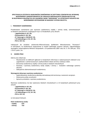 Załącznik nr 1 SPECYFIKACJA ISTOTNYCH WARUNKÓW ZAMÓWIENIA W ZAPYTANIU CENOWYM NA WYMIANĘ WODOMIERZY ZAMONTOWANYCH W LOKALACH MIESZKALNYCH ZNAJDUJĄCYCH SIĘ W BUDYNKACH NALEŻĄCYCH DO ZASOBÓW LWSM "DRZEWIARZ" W USTRZYKACH DOLNYCH NA WODOMIERZE WYPOSAŻONE W RADIOWY SYSTEM ODCZYTU. I. PRZEDMIOT ZAMÓWIENIA Przedmiotem zamówienia jest wymiana wodomierzy ciepłej i zimnej wody, zamontowanych w lokalach mieszkalnych znajdujących się w 13 budynkach, przy ulicach: - Jagiellońskiej nr 42 i 44, - Piastowskiej nr 36 i 38, - ST. Batorego nr 28,30,32 i 34, - J III Sobieskiego nr 22, 24 i 26, - PCK nr 50 i 52, należących do zasobów Lokatorsko-Własnościowej Spółdzielni Mieszkaniowej "Drzewiarz" w Ustrzykach, na wodomierze wyposażone w moduł radiowego systemu odczytu, odpowiadające wymogom rozporządzenia Ministra Gospodarki z 23 października 2007 roku Dz. U. Nr 209 poz. 1512 i 1513 z późn. zm. II. ZAKRES PRAC Zakres prac obejmuje; Wywieszenie na tablicach ogłoszeń w budynkach informacji o wykonywanych robotach oraz uzgodnienie z zainteresowanym użytkownikiem lokalu terminu realizacji robót. Demontaż wodomierzy ciepłej i zimnej wody w lokalach mieszkalnych. Dostawę i wymianę wodomierzy wody ciepłej i zimnej z modułem radiowego systemu odczytu. Odkupienie zdemontowanych wodomierzy Wymagania dotyczące wymiany wodomierza: Zaplombowanie wodomierzy plombą zatrzaskową lub termiczną z numerem seryjnym. Wykonanie próby szczelności. Spisanie protokołu z wymiany wodomierza. Wymiana wodomierzy ma być wykonana lokalach mieszkalnych w 13 budynkach położonych przy ulicach: - Jagiellońskiej nr 42 i 44, - Piastowskiej nr 36 i 38, - ST. Batorego nr 28,30,32 i 34, - J III Sobieskiego nr 22, 24 i 26, - PCK nr 50 i 52, w Ustrzykach Dolnych. Ilości wodomierzy wody: - ciepłej: 674 - zimnej: 723 1 Załącznik nr 1 III. WYMAGANIA TECHNICZNE DOT. WODOMIERZY 1. Wodomierze jednostrumieniowe suchobieżne do wody zimniej (T-30°C), Dn-15mm ( ½ CALA), Qn=1,0 m3/h, konstrukcyjnie przystosowany do modułu radiowego, przeznaczonego do eksploatacji radiowego systemu odczytu, wg następujących wymogów technicznych: Klasa metrologiczna B-H/A-V, Każde urządzenie musi posiadać Dopuszczenie Typu, Zgodność z wymaganiami dopuszczenia dostosowania w budownictwie oznakowanie znakiem CE lub krajowym znakiem budowlanym B, Numer fabryczny wodomierz oraz klasa meteorologiczna muszą być trwale umieszczone na tarczy liczydła. Liczydło wodomierza powinno być hermetycznie zamknięte (IP65), Wodomierze mają zawierać rozłączny moduł radiowy, Urządzenia muszą być fabrycznie nowe i posiadać cechę legalizacyjną nadaną w roku realizacji dostawy do Zamawiającego. Możliwość odczytu wzrokowego z widocznym wskaźnikiem pracy wodomierza. 2. Wodomierze jednostrumieniowe suchobieżne do wody ciepłej (T-90°C), Dn-15mm (1/2 CALA), Qn=1,0 m3/h, konstrukcyjnie przystosowany do modułu radiowego, przeznaczonego do eksploatacji radiowego systemu odczytu, wg następujących wymogów technicznych: Klasa metrologiczna B-H/A-V, Każde urządzenie musi posiadać Dopuszczenie Typu, Zgodność z wymaganiami dopuszczenia dostosowania w budownictwie oznakowanie znakiem CE lub krajowym znakiem budowlanym B, Numer fabryczny wodomierz oraz klasa meteorologiczna muszą być trwale umieszczone na tarczy liczydła. Liczydło wodomierza powinno być hermetycznie zamknięte (IP65), Wodomierze mają zawierać rozłączny moduł radiowy, Urządzenia muszą być fabrycznie nowe i posiadać cechę legalizacyjną nadaną w roku realizacji dostawy do Zamawiającego. Możliwość odczytu wzrokowego z widocznym wskaźnikiem pracy wodomierza. IV. MINIMALNE WYMAGANIA TECHNICZNE DOT. NAKŁADEK (MODUŁY RADIOWE), RADIOWEGO SYSTEMU ZDALNEGO ODCZYTU WODOMIERZY. 1. Nakładki na wodomierze (moduły radiowe) powinny spełniać następujące wymogi techniczne: Wymagany system dwukierunkowej komunikacji między nakładką a urządzeniem odczytującym, Nakładka musi mieć możliwość zamontowania na wodomierz bez konieczności jego demontażu, Nakładka musi być montowana w sposób uniemożliwiający jej demontaż bez naruszenia plomb, Wymagana wytrzymałość baterii min. 10 lat, Wymagana automatyczna rejestracja w module stanu wodomierza na ostatni dzień miesiąca i dodatkowo opcjonalnie wybrany dzień miesiąca, 2 Załącznik nr 1 Wymagana rejestracja próby zakłócenia polem magnetycznym wodomierza w module i generacja automatycznego alarmu z datą alarmu, Wymagana rejestracja próby rozłączenia modułu i wodomierza i generacja automatycznego alarmu z datą alarmu. Wymagany alarm niskiego poziomu baterii. Wymagany alarm cofania wody wraz z dokładnym wskazaniem ilości cofniętej wody z datą alarmu. Nakładka musi mieć możliwość przeprogramowania w przypadku wymiany wodomierza Wymagana możliwość zabezpieczenia modułu radiowego poprzez plombę mechaniczną, Wymagane zabezpieczenie baterii zasilającej moduł radiowy przed możliwością jej nieuprawnionego demontażu. 2. Radiowy system zdalnego odczytu wodomierzy realizowany przez zastosowanie modułów (nakładek na wodomierze) wraz z niezbędnym oprzyrządowaniem, oprogramowaniem, powinien spełniać minimalne wymogi, tj: Wymagana możliwość odczytu modułu „w ruchu” – poprzez przejście inkasenta na zewnątrz budynku. Wymagana historia pełnego rozbioru wody w m3 za 12 miesięcy, Wymagana informacja o braku połączenia z wodomierzem wybranym do odczytu, Wymagana możliwość eksportu wyników do istniejącej bazy danych lub opcjonalnie eksport do niezaszyfrowanego pliku tekstowego o strukturze podanej przez zamawiającego, np. xls. Urządzenia powinny spełniać wszystkie wymagane normy dopuszczające do obrotu w Polsce i posiadać wymagane certyfikaty w tym oznakowanie CE. Transmisja radiowa powinna być odpowiednio zabezpieczona (zaszyfrowana), odporna na zakłócenia i modyfikacje. 3. Oferent dopuszcza możliwość odkupienia systemu i urządzeń