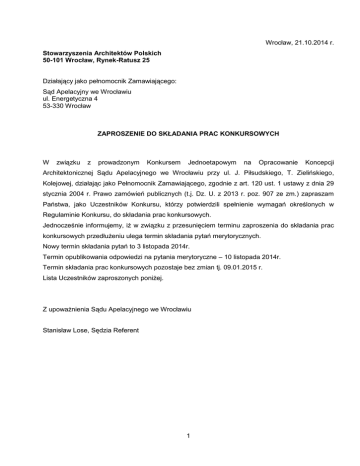 Wrocław, 21.10.2014 r. Stowarzyszenia Architektów Polskich 50-101 Wrocław, Rynek-Ratusz 25 Działający jako pełnomocnik Zamawiającego: Sąd Apelacyjny we Wrocławiu ul. Energetyczna 4 53-330 Wrocław ZAPROSZENIE DO SKŁADANIA PRAC KONKURSOWYCH W związku z prowadzonym Konkursem Jednoetapowym na Opracowanie Koncepcji Architektonicznej Sądu Apelacyjnego we Wrocławiu przy ul. J. Piłsudskiego, T. Zielińskiego, Kolejowej, działając jako Pełnomocnik Zamawiającego, zgodnie z art. 120 ust. 1 ustawy z dnia 29 stycznia 2004 r. Prawo zamówień publicznych (t.j. Dz. U. z 2013 r. poz. 907 ze zm.) zapraszam Państwa, jako Uczestników Konkursu, którzy potwierdzili spełnienie wymagań określonych w Regulaminie Konkursu, do składania prac konkursowych. Jednocześnie informujemy, iż w związku z przesunięciem terminu zaproszenia do składania prac konkursowych przedłużeniu ulega termin składania pytań merytorycznych. Nowy termin składania pytań to 3 listopada 2014r. Termin opublikowania odpowiedzi na pytania merytoryczne – 10 listopada 2014r. Termin składania prac konkursowych pozostaje bez zmian tj. 09.01.2015 r. Lista Uczestników zaproszonych poniżej. Z upoważnienia Sądu Apelacyjnego we Wrocławiu Stanisław Lose, Sędzia Referent 1 LISTA UCZESTNIKÓW DOPUSZCZONYCH DO UDZIAŁU W KONKURSIE LP 1. 2. Nazwa firmy/ Imię i nazwisko Atelier Loegler Sp. z o.o. Kraków Adres ul. Mazowiecka 84 30-023 Kraków korespondencja Sławkowska 12 31-014 Kraków KONTAKT tel/mail 12- 422 17 92 [email protected] Biuro Architektoniczne “STUDIO FIKUS” Poznań ul. Umultowska 100, 61-614 Poznań 61-821 80 30 [email protected] 3. Janusz Bułat Wrocław ul. Kazimierska 7/8 51-657 Wrocław 601 564 930 [email protected] 4. B.A.U. – Jan Barysz Tychy ul. Norwida 56 43-100 Tychy 32 -217 10 72 [email protected] 5. BIPROWŁÓK Sp. z o.o. Łódź ul. Piłsudskiego 12 90-051 Łódź 42-636 39 22 [email protected] 6. WXCA Sp. z o.o. Warszawa Bulanda, Mucha – Architekci Sp. o.o. Warszawa ul. Górczewska 242/9 01-460 Warszawa 22-256 86 73 [email protected] ul. Lipińska 4, 01-833 Warszawa ul. Słonecznikowa 8a/2 30-213 Kraków 22-869 01 55 [email protected] 12- 66 12 098 [email protected] ul. Mostowa 25/34 61-854 Poznań ul. Bohaterów Warszawy 40/3A2A 70-342 Szczecin 61-855 14 99 [email protected] 91- 488 43 64 [email protected] ul. Poniatowskiego 35 41-807 Zabrze 601 433 960 [email protected] ul. Nastrojowa 42/11 91-496 Łódź 42-658 27 06 [email protected] ul. Promienista 78 60-289 Poznań ul. Fabryczna 45 43-100 Tychy 61- 662 29 65 [email protected] 604 480 531 [email protected] ul. Oświęcimska 90B 32-500 Chrzanów 32- 623 53 13 ul. Okrzei 19/2 58-500 Jelenia Góra 605 579 364 ul. Jordana 14/9 40-043 Katowice 32- 757 38 58 [email protected] ul. Pajęcza 33 04-806 Warszawa pl. Wojska Polskiego 9 43-300 Bielsko Biała 660 405 181 [email protected] 33-816 61 82 [email protected] ul. Dąbrowskiego 30 32-600 Oświęcim 33- 844 00 12 [email protected] 7. 8. Artur Jasiński i Wspólnicy Biuro Architektoniczne Sp. z o.o. Kraków 9. Atrium ASA Poznań 10. 11. 12. 13. 14. 15. 16. 17. 18. MXL4 Sp. z o.o. Sp. K. Szczecin Studio Architektury FORMAT Adam Gorczyca Zabrze Biuro Realizacji Inwestycji FRONTON Sp. z o.o. Łódź MCS Infrastruktura Sp. z o.o. Poznań Architektoniczna Pracownia AP Sp. z o.o. Tychy Meritum Grupa Budowlana Sp. z o.o. Sp. K. Chrzanów A Projekt Pracownia Architektury Jelenia Góra Archistudio Tomasz Studniarek Małgorzata Pilinkiewicz s.c. Katowice Marek Hys Architekt Warszawa 19. Gronner & Rączka Architekci S.J. Bielsko-Biała 20. Susuł & Strama Architekci Sp. z o.o. Oświęcim 2 21. 22. 23. 24. 25. 26. 27. PiG Architekci Sp. z o.o. Warszawa Studio ADS sp. z o.o. sp.k. Poznań ARE Stiasny / Wacławek Warszawa Krzysztof Janus ARCHIMEDIA Pracownia Architektoniczna Architekci & Inżynierowie Poznań Manufaktura Nr 1 Bogusław Wowrzeczka Wrocław Pracownia Architektoniczno Konstrukcyjna FULLBET Jadwiga i Robert Szota Katowice Warsztat Architektury Pracownia Autorska Krzysztof Kozłowski ul. Stępińska 20/30 lok. 506A 00-739 Warszawa 607 808 295 [email protected] ul. Mostowa 11/11 61-854 Poznań 61-858 29 00 [email protected] 22- 82 631 66 [email protected] ul. Chmielna 24/3 00-020 Warszawa ul. Swięciańska 6 61-132 Poznań 607 170 057 [email protected] pl. Grunwaldzki 18/60 50-384 Wrocław 601 990 727 Fax: 71-345 35 71 ul. Dąbrówki 15/10 40-081 Katowice 601 188 795 [email protected] ul. Armii Krajowej 85/1 81-844 Sopot 58-551 45 59 [email protected] 28. Franta & Franta Architekci Sp. z o.o. Chorzów Aleja Różana 6 41-501 Chorzów 32-745 27 24 [email protected] 29. Biuro Projektów PKZ Arkona Kraków Pracownia Architektoniczna Wasko Projekt Bartłomiej Skoczek Bernadetta Bigaj Skoczek Kraków pl. Sikorskiego 3/9 31-115 Kraków 12- 421 24 41 [email protected] ul. Bursztynowa 5 81-213 Kraków 12-416 70 00 [email protected] 32. PAS Projekt Archi Studio Nadarzyn Pracownia Projektowa Wojciech Kolesiński Poznań ul. Platanowa 5 05-830 Nadarzyn ul. Ostroroga 2/1 60-349 Poznań 22-739 90 25 [email protected] 61- 867 37 03 [email protected] 33. Zespół Projektowy AMD Jaworzno ul. Długoszyńska 6 43-600 Jaworzno 32-752 99 23 [email protected] 34. CDG Sp. z o.o. Oleśnica 504 232 125 [email protected] 35. Schick Architekci Sp. zo.o. Sp. K. Ruda Śląska SADAR+VUGA Lublijana, Słowenia PEPES Łukasz Sterzyński Poznań ul. Krzywoustego 2 46-400 Oleśnica ul. Piotra Niedurnego 99C 41-709 Ruda Śląska ul. Woźna 7/8 M7 61-777 Poznań 502 729 794 [email protected] 30. 31. 36. 32-240 00 09 37. APA Hubka Wrocław ul. Grottgera 7 51-630 Wrocław 71- 337 47 11 [email protected] 38. Grupa RB Sp. zo.o. Sp. K. Wrocław ul. Tęczowa 13/310 53-601 Wrocław 71-734 55 51 [email protected] 39. Grupa Platforma Sp. z o.o. Wrocław ul. Kwiska 61/3 54-210 Wrocław [email protected] 40. Kappa GM S.C. Bielsko-Biała pl. Ratuszowy 4/1 43-300 Bielsko-Biała 608 533 985 [email protected] 41. Jacek Sieniawski A