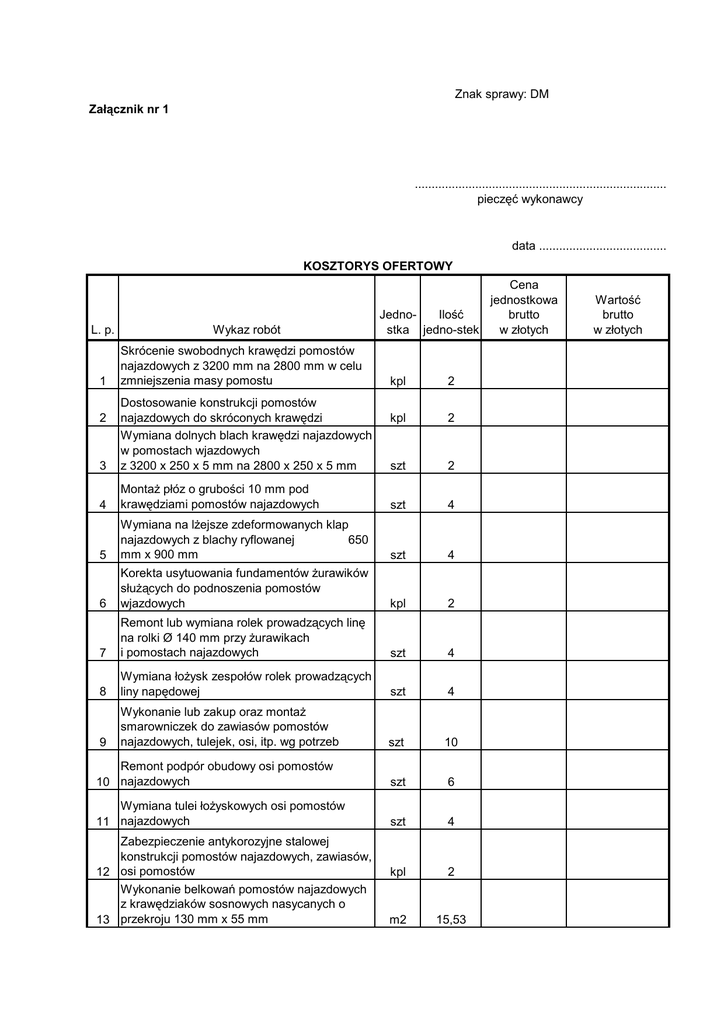 Znak sprawy: DM Załącznik nr 1 ........................................................................... pieczęć wykonawcy data ...................................... KOSZTORYS OFERTOWY L. p. 1 Wykaz robót Skrócenie swobodnych krawędzi pomostów najazdowych z 3200 mm na 2800 mm w celu zmniejszenia masy pomostu Cena jednostkowa JednoIlość brutto stka jedno-stek w złotych kpl 2 kpl 2 szt 2 3 Dostosowanie konstrukcji pomostów najazdowych do skróconych krawędzi Wymiana dolnych blach krawędzi najazdowych w pomostach wjazdowych z 3200 x 250 x 5 mm na 2800 x 250 x 5 mm 4 Montaż płóz o grubości 10 mm pod krawędziami pomostów najazdowych szt 4 5 Wymiana na lżejsze zdeformowanych klap najazdowych z blachy ryflowanej 650 mm x 900 mm szt 4 6 Korekta usytuowania fundamentów żurawików służących do podnoszenia pomostów wjazdowych kpl 2 7 Remont lub wymiana rolek prowadzących linę na rolki Ø 140 mm przy żurawikach i pomostach najazdowych szt 4 8 Wymiana łożysk zespołów rolek prowadzących liny napędowej szt 4 9 Wykonanie lub zakup oraz montaż smarowniczek do zawiasów pomostów najazdowych, tulejek, osi, itp. wg potrzeb szt 10 Remont podpór obudowy osi pomostów 10 najazdowych szt 6 Wymiana tulei łożyskowych osi pomostów 11 najazdowych szt 4 kpl 2 m2 15,53 2 Zabezpieczenie antykorozyjne stalowej konstrukcji pomostów najazdowych, zawiasów, 12 osi pomostów Wykonanie belkowań pomostów najazdowych z krawędziaków sosnowych nasycanych o 13 przekroju 130 mm x 55 mm Wartość brutto w złotych Zaspawanie otworów po śrubach w poszyciu 14 kadłuba szt 10 Wymiana poszycia pokładu z blachy 15 o grubości 5 mm m2 2,00 Wymiana poszycia pokładu z blachy o grubości 6 mm (w tym pod silnikiem napędowym oraz urządzeniami hydrauliki 16 siłowej). m2 1,00 Wymiana poszycia burt z blachy o grubości 17 5 mm m2 10,00 Wymiana lub naprawa fragmentów poszycia z blachy o grubości 10 mm (w tym w części czołowej dziobu i rufy w miejscu mocowań 18 zawiasów pomostów) m2 0,10 Wymiana blach dennych kadłuba w skrajniku 19 dziobowym i rufowym o grubości 5 mm m2 5,00 Wymiana poszycia dna z blachy o grubości 20 5 mm m2 40,00 21 Wymiana kątowników owręża mb 1,00 Wymiana kątowników pod silnikami hydraulicznymi pod poszyciem pokładu 22 mb 1,00 23 Wymiana kątownika obłowego 50 x 50 x 5 mm mb 16,00 Wymiana lub wbudowanie pozostałych blach i 24 kształtowników ze stali walcowanej kg 1,00 Wymiana lub wbudowanie pozostałych 25 kształtowników zimnogiętych kg 1,00 Wymiana lub wbudowanie pozostałych wyrobów w formie odlewów lub odkuwek 26 stalowych kg 1,00 Spawanie dodatkowe nie związanie z wymianą elementów owręża, płóz dennych, i poszycia kadłuba o długości spoiny 27 m 1,00 Spawanie nadbudówek na pokładzie pływaka 28 o długości spoiny m 20,00 Montaż szyby zespolonej o wymiarach około 300 x 770 mm w kabinie socjalnej od strony 29 górnej wody kpl 1 Wykonanie belkowań pokładu z krawędziaków sosnowych nasycanych o przekroju 130 mm x 55 mm (powierzchnia 30 prostokątna 3,03 m x 12,00 m) m2 36,36 Wykonanie krawężników z drewna dębowego o przekroju 60 x 80 mm i łącznej długości 24 31 m m3 0,1152 Utylizacja starych i wykonanie nowych gretingów na powierzchniach pokładu 32 przeznaczonych dla przebywania osób m2 12,60 Zakup nowej czteroosobowej łodzi towarzyszącej z komorami wypornościowymi w 33 dziobie i rufie kpl 1 Zakup kompletu wioseł oraz wylewki do łodzi 34 towarzyszącej kpl 1 35 Wyposażenie w greting łodzi towarzyszącej kpl 1 Zabezpieczenie antykorozyjne kotwicy łodzi 36 towarzyszącej szt 1 Wykonanie od zewnątrz zabezpieczenia antykorozyjnego dna, burt, skrajników, pokładu 37 zasłoniętego belkowaniem m2 119,00 Wykonanie zabezpieczenia antykorozyjnego poszycia pokładu (poza belkowaniem), kabiny, sterówki, barierek i pozostałych części 38 nawodnych, oraz wciągarek i kotwic m2 121,00 Malowanie owręża 40 m2 i wszystkich wewnętrznych powierzchni poszycia komór 39 pływaka farbą w kolorze białym 165 m2 m2 205,00 Zakonserwowanie liny głównej, bloków 40 ruchomych na pylonach oraz kołowrota. kpl 1 Wymiana pompy hydraulicznej zębatej B41141 2SPA06SDG11T (Grene) na nową szt 1 Remont i konserwacja pozostałych urządzeń hydrauliki siłowej na promie wraz z niezbędną 42 wymianą niektórych elementów kpl 1 Remont przekładni wind do podnoszenia 43 pomostów kpl 2 44 Konserwacja wind cumowniczych szt 2 45 Konserwacja wind kotwicznych szt 2 46 Zakup i wymiana mambran pompy szyperskiej szt 2 Zakup i montaż lamp nawigacyjnych 47 (zakręcanych): białej i zielonej szt 2 48 Wykonanie połączenia śrubowego Ø 16 mm szt 1 49 Zakup lin stalowych dowolnej średnicy kg 100 50 Zakup dowolnych łańcuchów stalowych kg 30 51 Wykonanie napisów metodą okleinową pkl 2 52 Transport pływaka promu kpl 1 Wartość ogółem brutto w złotych słownie:............................................................................................................................................................... ................................................................................................................................................ złotych Ceny jednostkowe zawarte w niniejszym formularzu obejmują cały zakres prac oraz koszty dodatkowe jak: koszty ogólne, zysk, transport. W cenę wymiana poszycia pokładu wkalkulowano demontaż i montaż urządzeń pokładowych, nadbudówek, instalacji hydraulicznej oraz elektrycznej. Ceny jednostkowe i wynikłe z nich wartości robót zawierają należny podatek vat. Oświadczam, że zapoznałem się w terenie z zakresem i rodzajem robót objętych przetargiem. Prace remontowe będę wykonywał pod nadzorem Polskiego Rejestru Statków. Do remontu użyję blach z atestem hutniczym. ..................................................................... podpis wykonawcy P