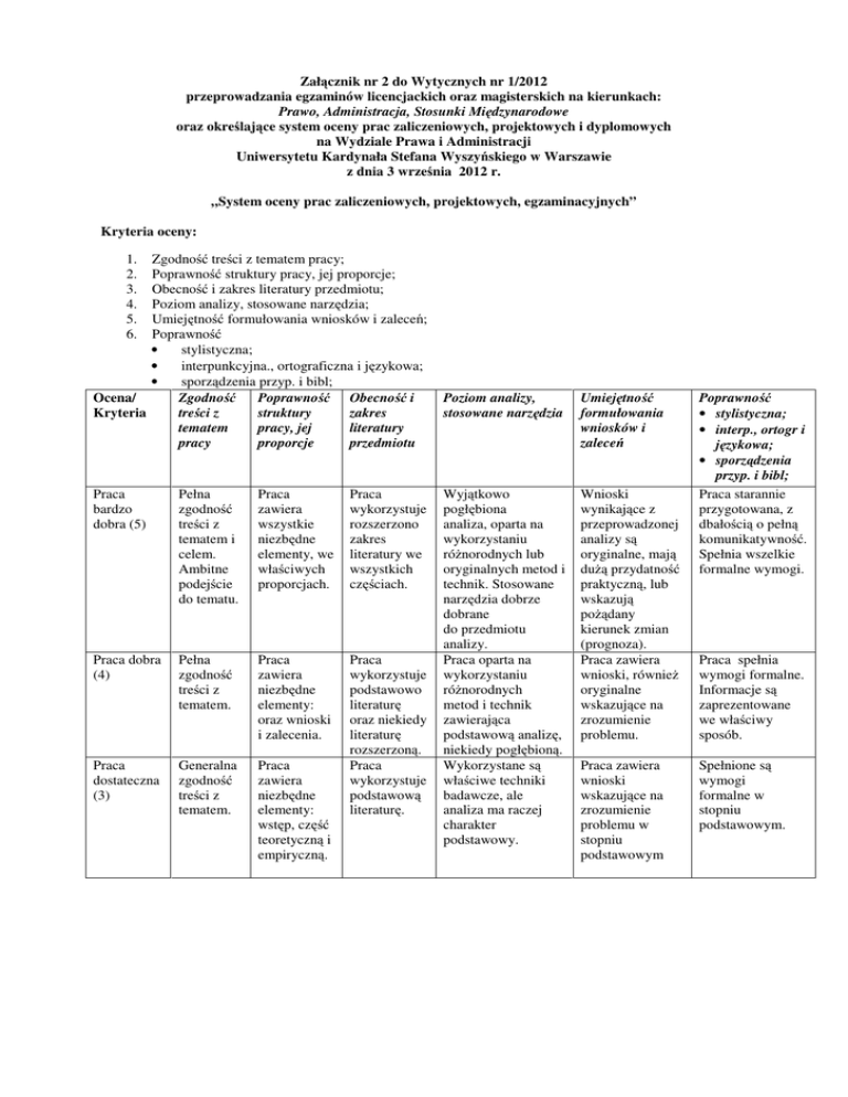 Załącznik nr 2 do Wytycznych nr 1/2012 przeprowadzania egzaminów licencjackich oraz magisterskich na kierunkach: Prawo, Administracja, Stosunki Międzynarodowe oraz określające system oceny prac zaliczeniowych, projektowych i dyplomowych na Wydziale Prawa i Administracji Uniwersytetu Kardynała Stefana Wyszyńskiego w Warszawie z dnia 3 września 2012 r. „System oceny prac zaliczeniowych, projektowych, egzaminacyjnych” Kryteria oceny: 1. 2. 3. 4. 5. 6. Zgodność treści z tematem pracy; Poprawność struktury pracy, jej proporcje; Obecność i zakres literatury przedmiotu; Poziom analizy, stosowane narzędzia; Umiejętność formułowania wniosków i zaleceń; Poprawność • stylistyczna; • interpunkcyjna., ortograficzna i językowa; • sporządzenia przyp. i bibl; Ocena/ Zgodność Poprawność Obecność i Kryteria treści z struktury zakres tematem pracy, jej literatury pracy proporcje przedmiotu Praca bardzo dobra (5) Pełna zgodność treści z tematem i celem. Ambitne podejście do tematu. Praca zawiera wszystkie niezbędne elementy, we właściwych proporcjach. Praca wykorzystuje rozszerzono zakres literatury we wszystkich częściach. Praca dobra (4) Pełna zgodność treści z tematem. Praca zawiera niezbędne elementy: oraz wnioski i zalecenia. Praca dostateczna (3) Generalna zgodność treści z tematem. Praca zawiera niezbędne elementy: wstęp, część teoretyczną i empiryczną. Praca wykorzystuje podstawowo literaturę oraz niekiedy literaturę rozszerzoną. Praca wykorzystuje podstawową literaturę. Poziom analizy, stosowane narzędzia Umiejętność formułowania wniosków i zaleceń Wyjątkowo pogłębiona analiza, oparta na wykorzystaniu różnorodnych lub oryginalnych metod i technik. Stosowane narzędzia dobrze dobrane do przedmiotu analizy. Praca oparta na wykorzystaniu różnorodnych metod i technik zawierająca podstawową analizę, niekiedy pogłębioną. Wykorzystane są właściwe techniki badawcze, ale analiza ma raczej charakter podstawowy. Wnioski wynikające z przeprowadzonej analizy są oryginalne, mają dużą przydatność praktyczną, lub wskazują pożądany kierunek zmian (prognoza). Praca zawiera wnioski, również oryginalne wskazujące na zrozumienie problemu. Praca zawiera wnioski wskazujące na zrozumienie problemu w stopniu podstawowym Poprawność • stylistyczna; • interp., ortogr i językowa; • sporządzenia przyp. i bibl; Praca starannie przygotowana, z dbałością o pełną komunikatywność. Spełnia wszelkie formalne wymogi. Praca spełnia wymogi formalne. Informacje są zaprezentowane we właściwy sposób. Spełnione są wymogi formalne w stopniu podstawowym.
