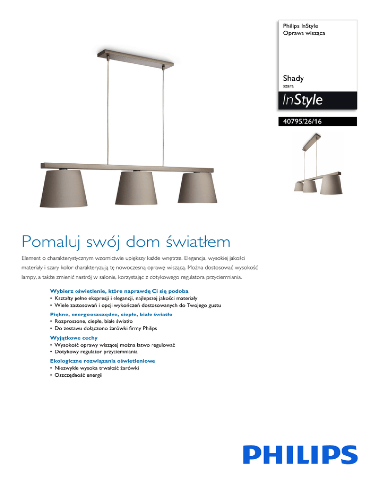 Philips InStyle Oprawa wisząca Shady szara InStyle 40795/26/16 Pomaluj swój dom światłem Element o charakterystycznym wzornictwie upiększy każde wnętrze. Elegancja, wysokiej jakości materiały i szary kolor charakteryzują tę nowoczesną oprawę wiszącą. Można dostosować wysokość lampy, a także zmienić nastrój w salonie, korzystając z dotykowego regulatora przyciemniania. Wybierz oświetlenie, które naprawdę Ci się podoba • Kształty pełne ekspresji i elegancji, najlepszej jakości materiały • Wiele zastosowań i opcji wykończeń dostosowanych do Twojego gustu Piękne, energooszczędne, ciepłe, białe światło • Rozproszone, ciepłe, białe światło • Do zestawu dołączono żarówki firmy Philips Wyjątkowe cechy • Wysokość oprawy wiszącej można łatwo regulować • Dotykowy regulator przyciemniania Ekologiczne rozwiązania oświetleniowe • Niezwykle wysoka trwałość żarówki • Oszczędność energii 407952616 Oprawa wisząca Shady szara Zalety Kształty i materiały Lampy z kolekcji Philips InStyle zostały zaprojektowane tak, aby doskonale pasowały do współczesnych wnętrz. Dzięki wielu kombinacjom dostępnych wykończeń, kolekcja ta znakomicie komponuje się z takimi elementami, jak zasłony, meble, kolory ścian i akcesoria, tworząc idealny efekt, o którym marzysz. Dbałość o szczegóły i koncepcję projektu pomoże Ci wyrazić swój styl dokładnie tak, jak chcesz, i pozwoli stworzyć nastrój i doskonałą atmosferę dla Ciebie, Twoich przyjaciół i rodziny. Wiele zastosowań zakończeniu. Wybierz odpowiednią wysokość w zależności od potrzeb. zmniejszyć rachunki za prąd i przyczynia się do ochrony środowiska. Rozproszone, ciepłe, białe światło Do zestawu dołączono żarówki firmy Philips Lampa jest wyposażona w żarówki firmy Philips, co gwarantuje najwyższą jakość światła i oświetlenie pasujące do danej oprawy. Dotykowy regulator przyciemniania Ta lampa wykorzystuje najnowszą technologię opracowaną przez firmę Philips, która pozwala uzyskać ciepłe, naturalne, białe światło przy jednoczesnej oszczędności energii. Efekt rozproszonego światła rozjaśni pomieszczenie ciepłym, białym blaskiem. Produkt łączy w sobie funkcjonalność i dbałość o środowisko. Rozproszone światło nadaje się idealnie do ogólnego oświetlenia. Intuicyjna obsługa — wystarczy dotknąć regulatora przyciemniania, aby ustawić jasność światła odpowiednią dla danego nastroju. Oszczędność energii Niezwykle wysoka trwałość żarówki Ta lampa firmy Philips zużywa mniej energii niż tradycyjne źródła światła, co pozwala W zestawie żarówka firmy Philips o niezwykłej trwałości — do 8000 godzin użytkowania. Jeśli interesujesz się projektowaniem wnętrz i lubisz eksperymentować, bawiąc się w domu najnowszymi stylami i konwencjami, wypróbuj Philips InStyle, czyli kolekcję dekoracyjnych opraw wiszących, kinkietów, opraw sufitowych oraz lamp podłogowych i stołowych wykonanych z najszlachetniejszych materiałów i dostępnych w bogatej palecie kolorów. Regulacja wysokości Oprawa wisząca firmy Philips jest wyposażona w długie przewody, co zapewnia większą elastyczność podczas instalacji oraz po jej 407952616 Oprawa wisząca Shady szara Dane techniczne Stylistyka i wykończenie • Materiał: aluminium • Kolor: szara Dodatkowe funkcje/akcesoria w zestawie • • • • • Dotykowy regulator przyciemniania Świetlówki w zestawie Efekt rozproszonego światła Element dekoracyjny Regulacja wysokości Wymiary i waga produktu • • • • • Minimalna wysokość: 28 cm Maksymalna wysokość: 260 cm Długość: 118 cm Szerokość: 25 cm Waga netto: 3,882 kg Dane techniczne • • • • • • Zasilanie sieciowe: Przedział 220–240 V, 50–60 Hz Technologia źródła światła: fluorescencyjne, 230 V Liczba źródeł światła: 3 Trzonek: E27 Moc źródła światła w zestawie: 20 W Maksymalna moc wymiennego źródła światła: 23 W • Barwa światła: ciepła biel • Oprawa z możliwością przyciemniania • • • • • • • • • LED: Nie Wbudowane źródło światła LED: NIE Klasa energetyczna dołączonego źródła światła: A Oprawa jest zgodna ze źródłami światła klasy: A+ do E Maksymalny okres eksploatacji: 10 000 godz. Współczynnik IP: IP20, ochrona przed przedmiotami powyżej 12,5 mm, brak ochrony przed wodą Klasa ochronności: I — uziemienie Źródło światła odpowiadające tradycyjnej żarówce o mocy: 90 W Moc strumienia świetlnego dołączonego źródła światła w lumenach: 1220 lm Serwis • Gwarancja: 2 lata Wymiary i waga opakowania • • • • Wysokość: 31,6 cm Długość: 119,8 cm Szerokość: 27,8 cm Waga: 6,126 kg Różne • Opracowano z myślą o: Salon i sypialnia • Styl: Tradycyjny • Typ: Oprawa wisząca • Data wydania 2016-10-07 © 2016 Philips Lighting Holding B.V. Wszelkie prawa zastrzeżone. Wersja: 1.0.1 Dane techniczne mogą ulec zmianie bez powiadomienia. Znaki towarowe są własnością Philips Lighting Holding B.V. lub własnością odpowiednich firm. 12 NC: 9150 040 61001 EAN: 87 18291 43332 3 www.philips.com