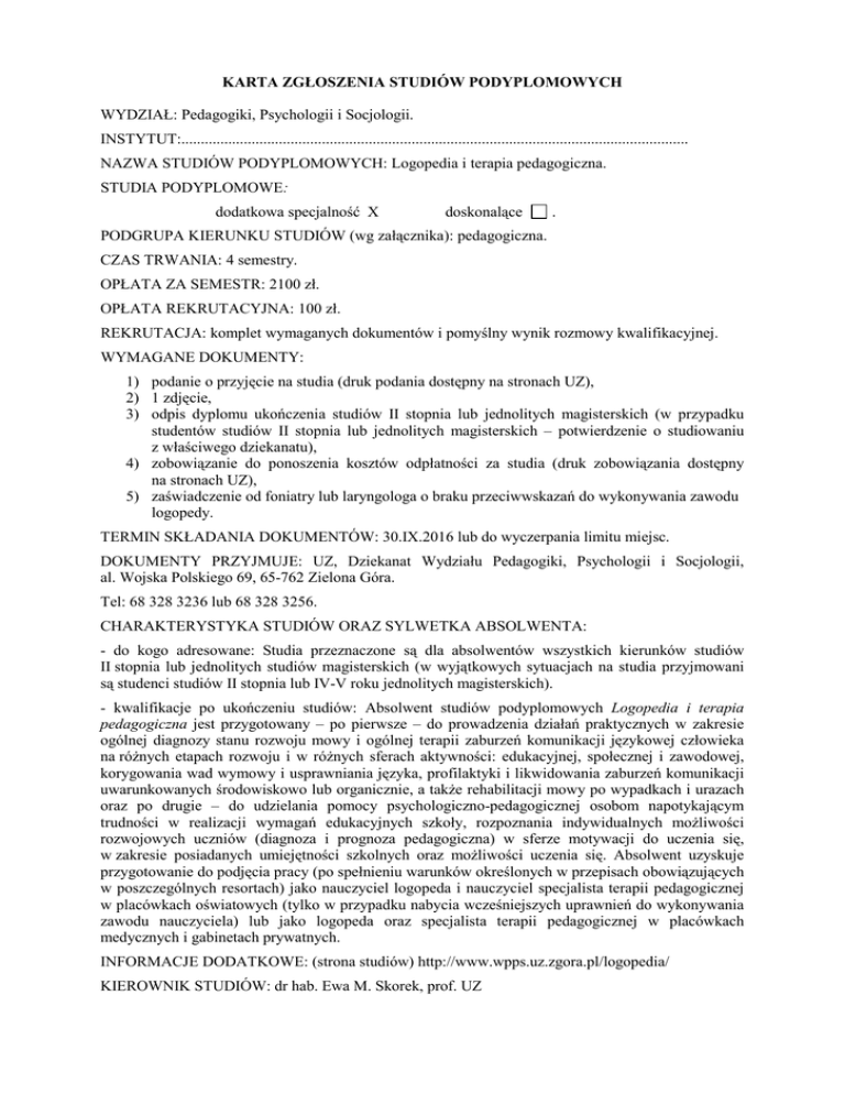 KARTA ZGŁOSZENIA STUDIÓW PODYPLOMOWYCH WYDZIAŁ: Pedagogiki, Psychologii i Socjologii. INSTYTUT:.................................................................................................................................. NAZWA STUDIÓW PODYPLOMOWYCH: Logopedia i terapia pedagogiczna. STUDIA PODYPLOMOWE: dodatkowa specjalność X doskonalące . PODGRUPA KIERUNKU STUDIÓW (wg załącznika): pedagogiczna. CZAS TRWANIA: 4 semestry. OPŁATA ZA SEMESTR: 2100 zł. OPŁATA REKRUTACYJNA: 100 zł. REKRUTACJA: komplet wymaganych dokumentów i pomyślny wynik rozmowy kwalifikacyjnej. WYMAGANE DOKUMENTY: 1) podanie o przyjęcie na studia (druk podania dostępny na stronach UZ), 2) 1 zdjęcie, 3) odpis dyplomu ukończenia studiów II stopnia lub jednolitych magisterskich (w przypadku studentów studiów II stopnia lub jednolitych magisterskich – potwierdzenie o studiowaniu z właściwego dziekanatu), 4) zobowiązanie do ponoszenia kosztów odpłatności za studia (druk zobowiązania dostępny na stronach UZ), 5) zaświadczenie od foniatry lub laryngologa o braku przeciwwskazań do wykonywania zawodu logopedy. TERMIN SKŁADANIA DOKUMENTÓW: 30.IX.2016 lub do wyczerpania limitu miejsc. DOKUMENTY PRZYJMUJE: UZ, Dziekanat Wydziału Pedagogiki, Psychologii i Socjologii, al. Wojska Polskiego 69, 65-762 Zielona Góra. Tel: 68 328 3236 lub 68 328 3256. CHARAKTERYSTYKA STUDIÓW ORAZ SYLWETKA ABSOLWENTA: - do kogo adresowane: Studia przeznaczone są dla absolwentów wszystkich kierunków studiów II stopnia lub jednolitych studiów magisterskich (w wyjątkowych sytuacjach na studia przyjmowani są studenci studiów II stopnia lub IV-V roku jednolitych magisterskich). - kwalifikacje po ukończeniu studiów: Absolwent studiów podyplomowych Logopedia i terapia pedagogiczna jest przygotowany – po pierwsze – do prowadzenia działań praktycznych w zakresie ogólnej diagnozy stanu rozwoju mowy i ogólnej terapii zaburzeń komunikacji językowej człowieka na różnych etapach rozwoju i w różnych sferach aktywności: edukacyjnej, społecznej i zawodowej, korygowania wad wymowy i usprawniania języka, profilaktyki i likwidowania zaburzeń komunikacji uwarunkowanych środowiskowo lub organicznie, a także rehabilitacji mowy po wypadkach i urazach oraz po drugie – do udzielania pomocy psychologiczno-pedagogicznej osobom napotykającym trudności w realizacji wymagań edukacyjnych szkoły, rozpoznania indywidualnych możliwości rozwojowych uczniów (diagnoza i prognoza pedagogiczna) w sferze motywacji do uczenia się, w zakresie posiadanych umiejętności szkolnych oraz możliwości uczenia się. Absolwent uzyskuje przygotowanie do podjęcia pracy (po spełnieniu warunków określonych w przepisach obowiązujących w poszczególnych resortach) jako nauczyciel logopeda i nauczyciel specjalista terapii pedagogicznej w placówkach oświatowych (tylko w przypadku nabycia wcześniejszych uprawnień do wykonywania zawodu nauczyciela) lub jako logopeda oraz specjalista terapii pedagogicznej w placówkach medycznych i gabinetach prywatnych. INFORMACJE DODATKOWE: (strona studiów) http://www.wpps.uz.zgora.pl/logopedia/ KIEROWNIK STUDIÓW: dr hab. Ewa M. Skorek, prof. UZ
