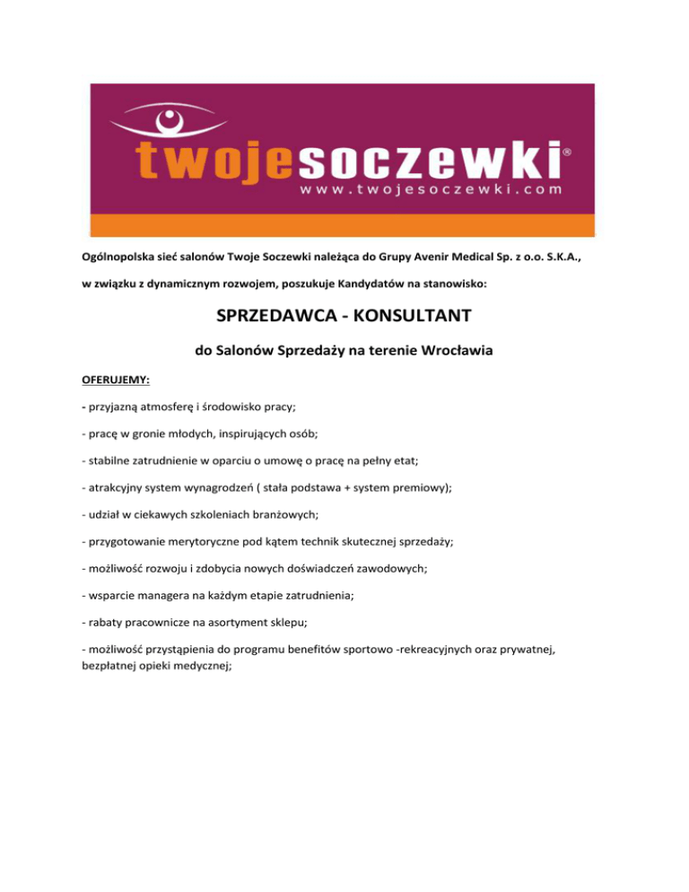 Ogólnopolska sieć salonów Twoje Soczewki należąca do Grupy Avenir Medical Sp. z o.o. S.K.A., w związku z dynamicznym rozwojem, poszukuje Kandydatów na stanowisko: SPRZEDAWCA - KONSULTANT do Salonów Sprzedaży na terenie Wrocławia OFERUJEMY: - przyjazną atmosferę i środowisko pracy; - pracę w gronie młodych, inspirujących osób; - stabilne zatrudnienie w oparciu o umowę o pracę na pełny etat; - atrakcyjny system wynagrodzeń ( stała podstawa + system premiowy); - udział w ciekawych szkoleniach branżowych; - przygotowanie merytoryczne pod kątem technik skutecznej sprzedaży; - możliwość rozwoju i zdobycia nowych doświadczeń zawodowych; - wsparcie managera na każdym etapie zatrudnienia; - rabaty pracownicze na asortyment sklepu; - możliwość przystąpienia do programu benefitów sportowo -rekreacyjnych oraz prywatnej, bezpłatnej opieki medycznej; ZAKRES OBOWIĄZKÓW: - aktywne nawiązywanie kontaktów z Klientem; - bezpośrednia, wielopoziomowa obsługa Klienta i profesjonalne doradztwo produktowe; - podstawowe prace rachunkowe ( fiskalizacja, raportowanie, wystawianie dowodów sprzedaży); - dbałość o ekspozycję i nienaganny aspekt wizualny salonu; - kreowanie pozytywnego wizerunku sieci Twoje Soczewki; OCZEKUJEMY: - łatwości w nawiązywaniu kontaktów oraz budowaniu długofalowych relacji z Klientem; - pełnej dyspozycyjności ( praca zmianowa, w tym także w weekendy); - kreatywności, entuzjazmu i zaangażowania w wykonywane czynności; - wysokiej kultury osobistej i nienagannej prezencji; - umiejętności współpracy w zespole; - sprawnego poruszania się w środowisku internetowym i pakiecie MS Office; - orientacji na osiąganie celów; - wykształcenia minimum średniego, mile widziane wykształcenie kierunkowe; - mile widziane doświadczenie w sprzedaży i bezpośredniej obsłudze Klienta; Zatrudnienie poprzedza bezpłatne 5 – dniowe bezpłatne szkolenie tematyczne organizowane w centrali firmy. Aplikacje prosimy przesyłać na adres: [email protected] z dopiskiem KONSULTANT do dnia 03-02-2017. Dane Pracodawcy: Avenir Medical Sp. z o.o. S.K.A. Siechnice, ul. Kościuszki 40 55-011 Siechnice