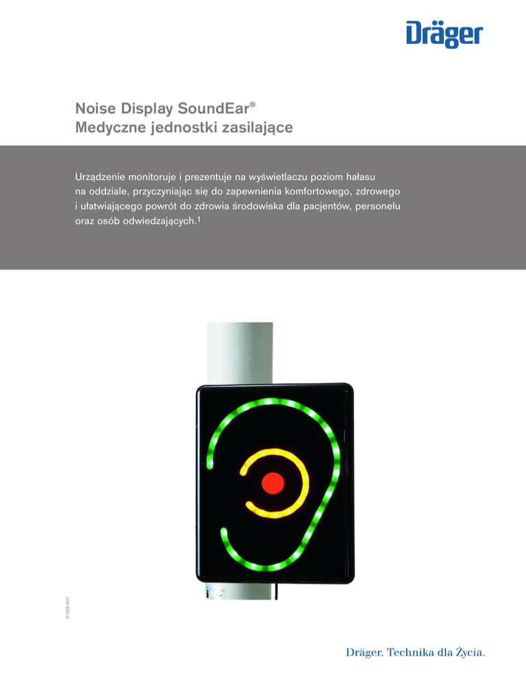 Noise Display SoundEar® Medyczne jednostki zasilające D-1322-2011 Urządzenie monitoruje i prezentuje na wyświetlaczu poziom hałasu na oddziale, przyczyniając się do zapewnienia komfortowego, zdrowego i ułatwiającego powrót do zdrowia środowiska dla pacjentów, personelu oraz osób odwiedzających.1 02 | Noise Display SoundEar® Zalety Problem hałasu Ludzkie ucho odbiera hałasy w tle przez cały czas, co może prowadzić do utraty zdolności obiektywnej oceny poziomu hałasu. W rzeczywistości poziom hałasu ma tendencje do zwiększania się w ciągu dnia. Urządzenie Noise Display mierzy i wyświetla aktualny poziom hałasu na oddziale, dostarczając w ten sposób cennych informacji, które pomagają rozpoznać i kontrolować nadmierny poziom hałasu. Wizualizacja dźwięku Noise Display prezentuje poziomy hałasu przy użyciu kolorowej sygnalizacji: kolor zielony oznacza, że poziom hałasu mieści się w dopuszczalnych granicach, natomiast żółty i czerwony oznaczają potencjalnie szkodliwy poziom hałasu. Czytelny wyświetlacz prezentuje obiektywne informacje, wskazując kiedy personel medyczny powinien zmniejszyć hałas do właściwego poziomu. Mniej stresu dla wszystkich Nadmierny hałas może powodować niepotrzebny stres dla pacjentów i zmniejszyć efektywność pracy personelu2. Badania wykazały, że ten stres może mieć bardzo istotny wpływ na samopoczucie3,4. Mózg przeznacza dużo energii na odfiltrowywanie niepożądanych bodźców, dlatego większości ludzi łatwiej jest skoncentrować się i odpoczywać w cichym otoczeniu5. Noise Display może pomóc w lepszym wykorzystaniu tej energii. Widoczne skupienie się na dobrym samopoczuciu pacjenta Osoby odwiedzające szybko docenią urządzenie Noise Display jako Twój znaczący wkład w zapewnienie pełnego komfortu i najwyższego poziomu opieki pacjentom. To oczywisty znak, że robisz wszystko, aby pacjenci, personel i odwiedzający czuli się jak najlepiej. Hospital Noise — Levels and Potential Health Hazards. S. Falk et al.; N Engl J Med 1973; 289:774-781 October 11, 1973 2 Nurses‘ Perception of Noise Levels in Hospitals in Spain Marqués Sánchez, M del Pilar et al.; Journal of Nursing Administration, May 2008 – Volume 38 – Issue 5 – pp 220-222 3 Hospital Noise — Levels and Potential Health Hazards. S. Falk et al.; N Engl J Med 1973; 289:774-781 October 11, 1973 4 Noise pollution in the operating theatre B. Hodge et al.; The Lancet, Volume 335, Issue 8694, 14 April 1990, Pages 891-894 5 How does background noise affect our concentration? M. Andrews; Scientific American Mind, January Issue 2010 1 Noise Display SoundEar® | 03 Powiązane produkty Opcje oświetlenia D-1402-2011 Polepsz atmosferę na oddziale intensywnej terapii, z korzyścią dla pacjentów, personelu i osób odwiedzających, poprzez wybór opcji oświetlenia dla sufitowych jednostek zasilających. Zintegrowany system do podnoszenia pacjentów D-1348-2011 Ekonomiczny system do podnoszenia pacjentów, zamontowany do jednostki zasilającej, pozwala usprawnić pracę i obniżyć poziom ryzyka dla wszystkich zaangażowanych osób, poprawiając jednocześnie jakość opieki nad pacjentami. Dräger Pendula® D-57963-2012 Sufitowy uchwyt do mocowania zestawu monitorów dla dopasowanego i ergonomicznego stanowiska pracy oraz łatwego i bezpiecznego pozycjonowania monitorów w hybrydowych salach operacyjnych. Dane techniczne WERSJA ZE ZINTEGROWANYM ZASILACZEM ZAINSTALOWANYM NA WYSIĘGNIKU JEDNOSTKI ZASILAJĄCEJ Masa 1,5 kg Napięcie 24 V DC Wymiary (S x W x G) 265 x 205 x 46 mm Uchwyt rury dystansującej Masa 1,9 kg Wymiary (S x W) 178 x 100 mm WERSJA DO ROZBUDOWY (Z ZASILACZEM WTYKOWYM) Masa Napięcie 1,5 kg 24 V DC Z zasilaczem wtykowym Wtyczka euro CEE7/16 USA plug NEMA 1-15 UK plug BS1363 Australia plug AS3112 IEC plug DIN EN60320 Informacje zamówieniowe Wersja do rozbudowy G24925 Noise Display SoundEar® Zasilacz wtykowy G24926 Zintegrowane rozwiązania dostępne podczas konfiguracji kolumny. CENTRALA Drägerwerk AG & Co. KGaA Moislinger Allee 53–55 23558 Lubeka, Niemcy www.draeger.com Producent: SoundEar A/S Strandboulevarden 164, 2100 Copenhagen Denmark Znajdź lokalnego przedstawiciela handlowego na stronie: www.draeger.com/kontakt POLSKA Dräger Polska Sp. z o.o. ul. Sułkowskiego 18a 85 - 655 Bydgoszcz Tel +48 52 346 14-33 (-34, -35) Fax +48 52 346 14-37 [email protected] G24926 90 69 293 | 16-02-1 | Communications & Sales Marketing | PP | LE | Nie zawiera chloru – spełnia warunki ochrony środowiska | Zastrzegamy prawo zmian | © 2016 Drägerwerk AG & Co. KGaA 04 | Noise Display SoundEar®