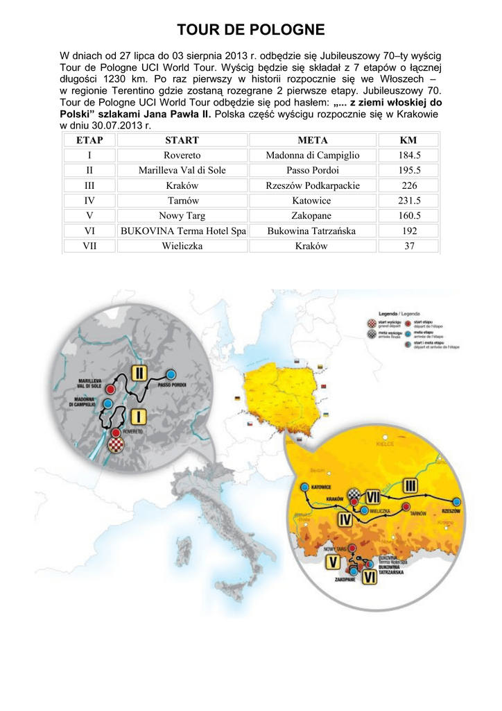 TOUR DE POLOGNE W dniach od 27 lipca do 03 sierpnia 2013 r. odbędzie się Jubileuszowy 70–ty wyścig Tour de Pologne UCI World Tour. Wyścig będzie się składał z 7 etapów o łącznej długości 1230 km. Po raz pierwszy w historii rozpocznie się we Włoszech – w regionie Terentino gdzie zostaną rozegrane 2 pierwsze etapy. Jubileuszowy 70. Tour de Pologne UCI World Tour odbędzie się pod hasłem: „... z ziemi włoskiej do Polski” szlakami Jana Pawła II. Polska część wyścigu rozpocznie się w Krakowie w dniu 30.07.2013 r. ETAP START META KM I Rovereto Madonna di Campiglio 184.5 II Marilleva Val di Sole Passo Pordoi 195.5 III Kraków Rzeszów Podkarpackie 226 IV Tarnów Katowice 231.5 V Nowy Targ Zakopane 160.5 VI BUKOVINA Terma Hotel Spa Bukowina Tatrzańska 192 VII Wieliczka Kraków 37 Etap III wyścigu Kraków – Rzeszów przebiegał będzie m.in. przez teren Gminy Czudec!! Trasa III etapu wiodła będzie z Krakowa m.in. przez Wieliczkę, Łapanów, Jasło, Lublę, Frysztak, Wiśniową, Strzyżów, gdzie przewidziano premię lotną, Glinik Charzewski, Czudec, Lubenię aż do Rzeszowa. W dniu 30 lipca pomiędzy godziną 17.00, a 18.00 planowany jest przejazd zawodników przez teren Gminy Czudec w kierunku od Zaborowa do Babicy.