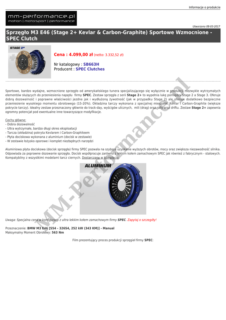 Informacje o produkcie Utworzono 08-03-2017 Sprzęgło M3 E46 (Stage 2+ Kevlar & Carbon-Graphite) Sportowe Wzmocnione SPEC Clutch Cena : 4.099,00 zł (netto: 3.332,52 zł) l Nr katalogowy : SB663H Producent : SPEC Clutches an rm Cechy główne: - Dobra dozowalność - Ultra wytrzymałe, bardzo długi okres eksploatacji - Tarcza (okładzina) pokryta Kevlarem i Carbon-Graphiteem - Płyta dociskowa wykonana z aluminium (docisk w zestawie) - W zestawie łożysko oporowe i komplet niezbędnych narzędzi ce .p Sportowe, bardzo wydajne, wzmocnione sprzęgło od amerykańskiego tunera specjalizującego się wyłącznie w produkcji niezwykle wytrzymałych elementów służących do przeniesienia napędu firmy SPEC. Zestaw sprzęgła z serii Stage 2+ to wypełnia lukę pomiędzy Stage 2 a Stage 3. Oferuje dobrą dozowalność i poprawne właściwości jezdne jak i wydłużoną żywotność (jak w przypadku Stage 2) ale oferuje dodatkowo bezpieczne przeniesienie wysokiego momentu obrotowego (15-20%). Okładzina tarczy wykonana z specjalnej mieszanki Kevlar i Carbon-Graphite (większe pokrycie tarczy). Idealny zestaw przeznaczony głównie do track-day, wyścigów ulicznych, mili (drag) oraz rally oraz driftu. Zestaw Stage 2+ zapewnia ogromny potencjał pod ewentualne inne towarzyszące modyfikacje. M M -P er fo Aluminiowa płyta dociskowa (docisk sprzęgła) firmy SPEC pozwala na szybsze uzyskanie wyższych obrotów, mocy oraz zwiększa niezawodność silnika. Odpowiada za poprawne dozowanie sprzęgła. Docisk współpracuje zarówno z lekkim kołem zamachowym SPEC jak również z fabrycznym - stalowych. Kompatybilny z wszystkimi modelami tarcz ciernych. Dostarczany w komplecie. Uwaga: Specjalna cena w konfiguracji z ultra lekkim kołem zamachowym firmy SPEC. Zapytaj o szczegóły! Przeznaczenie: BMW M3 E46 [S54 - 326S4, 252 kW (343 KM)] - Manual Maksymalny Moment Obrotowy: 563 Nm Film prezentujący proces produkcji sprzęgieł firmy SPEC: l ce .p an rm fo er -P M M