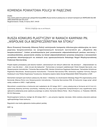 KOMENDA POWIATOWA POLICJI W PAJĘCZNIE Źródło: http://www.pajeczno.policja.gov.pl/epj/informacje/8881,Rusza-konkurs-plastyczny-w-ramach-kampanii-pn-WSPOLNIE-DLA-BE ZPIECZENSTWA-NA-STO.html Wygenerowano: Środa, 8 marca 2017, 04:03 Strona znajduje się w archiwum. RUSZA KONKURS PLASTYCZNY W RAMACH KAMPANII PN. „WSPÓLNIE DLA BEZPIECZEŃSTWA NA STOKU” Biuro Prewencji Komendy Głównej Policji zainicjowało kampanię informacyjno-edukacyjną na rzecz poprawy bezpieczeństwa na zorganizowanych terenach narciarskich pn. „Wspólnie dla bezpieczeństwa”. Celem przedsięwzięcia jest promowanie odpowiedzialnych postaw narciarzy i snowboardzistów, poszerzenie wiedzy na temat odpowiedzialności prawnej związanej z naruszeniem przepisów obowiązujących na stokach oraz upowszechnianie Dekalogu Reguł Międzynarodowej Federacji Narciarskiej. Projekt będzie prowadzony pod dwoma hasłami, adresowanymi do różnych odbiorców: dla dorosłych - „Odpowiedzialni na stoku” oraz dla dzieci – „Stok nie jest dla bałwanów”. Partnerstwo w kampanii zadeklarowali: Polski Związek Narciarski, oraz Stowarzyszenie Instruktorów i Trenerów Narciarstwa PZN, Górskie Ochotnicze Pogotowie Ratunkowe, Tatrzańskie Ochotnicze Pogotowie Ratunkowe, Stowarzyszenie Instruktorów i Trenerów Narciarstwa PZN, Generalny Inspektor Ochrony Danych Osobowych oraz Polska Organizacja Turystyczna. Kampanię wspiera także Zarząd Wojewódzki NSZZ Policjantów w KGP. Elementem kampanii jest konkurs plastyczny dla dzieci i młodzieży na zilustrowanie Dekalogu Reguł FIS organizowany przez Komendę Główną Policji oraz Stowarzyszenie Instruktorów i Trenerów Narciarstwa PZN. W konkursie mogą wziąć udział osoby urodzone w 2001 r. bądź później. Warunkiem uczestnictwa w konkursie jest nadesłanie do 20 lutego 2017 r. pracy plastycznej w formacie od A-5 do A-3, wykonanej dowolną techniką rysunkową, malarską lub przy użyciu programów komputerowych oraz wypełnionej karty zgłoszenia podpisanej przez opiekuna prawnego na adres: Komenda Główna Policji - Biuro Prewencji, ul. Puławska 148/150, 02-514 Warszawa. Rozstrzygnięcie konkursu nastąpi do 28 lutego 2017 r., jury przyzna nagrody rzeczowe, które zostaną wręczone podczas ogólnopolskiego finału konkursu. Regulamin oraz kartę zgłoszenia można pobrać poniżej. KGP / ig Ocena: 0/5 (0) Tweetnij konkurs