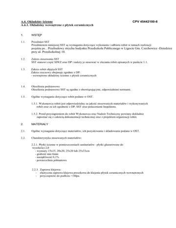 A.6. Okładziny ścienne A.6.1. Okładziny wewnętrzne z płytek ceramicznych CPV 45442100-8 1. WSTĘP 1.1. Przedmiot SST Przedmiotem niniejszej SST są wymagania dotyczące wykonania i odbioru robót w ramach realizacji projektu pn. . Przebudowy strychu budynku Przedszkola Publicznego w Ligocie Gm. Czechowice -Dziedzice przy ul. Przedszkolnej 10. 1.2. Zakres stosowania SST SST stanowi część SIWZ oraz DP i należy je stosować w zlecaniu robót opisanych w punkcie 1.1. 1.3. Zakres robót objętych SST Zakres rzeczowy obejmuje zgodnie z DP: - wewnętrzne okładziny ścienne z płytek ceramicznych 1.4. Określenia podstawowe Określenia podstawowe SST są zgodne z obowiązującymi, odpowiednimi normami. 1.5. Ogólne wymagania dotyczące robót podano w OST. 1.5.1. Wykonawca robót jest odpowiedzialny za jakość stosowanych materiałów i wykonywanych robót oraz za ich zgodność z DP, SST oraz poleceniami Inspektora. 1.5.2. Przed przystąpieniem do robót Wykonawca oraz Nadzór Techniczny powinny dokładnie zapoznać się z całością dokumentacji technicznej oraz z projektem organizacji robót. 2. MATERIAŁY 2.1. Ogólne wymagania dotyczące materiałów, ich pozyskiwania i składowania podano w OST. 2.2. Charakterystyka stosowanych materiałów: 2.2.1. Płytki ścienne w pomieszczeniach sanitariatów– płytki glazurowane do wysokości 2,0 - wymiary 15x15, 20x20, 25x20 lub 25x33cm - grubość min 6mm - nasiąkliwość 0,1% - powierzchnia półmatowa 2.2.3. Zaprawa klejowa: - elastyczna zaprawa klejowa proszkowa do klejenia płytek ceramicznych wewnętrznych - przyczepność do podłoża >1Mpa. 2.2.4. - Zaprawa fugowa aprobata techniczna grubość spoiny 3÷5mm elastyczna wodoodporna niska zawartość chromianów wytrzymałość na ściskanie >16Mpa wytrzymałość na zginanie >3Mpa. 3. SPRZĘT 3.1. Ogólne wymagania dotyczące sprzętu podano w OST. Dobór sprzętu pozostawia się do uznania Wykonawcy po uzgodnieniu z Kierownikiem Kontraktu. Jakikolwiek sprzęt, maszyny lub urządzenia nie gwarantujące zachowania wymagań jakościowych robót i bezpieczeństwa zostaną przez Kierownika Kontraktu zdyskwalifikowane i niedopuszczone do robót. 4. TRANSPORT Ogólne wymagania dotyczące transportu podano w OST. Płytki okładzinowe pakowane są w kartony lub zafoliowane pakiety i dostarczane na teren budowy na paletach. Składować je należy w pomieszczeniach zamkniętych, suchych, w dodatnich, na równej mocnej, poziomej posadzce. Do przewozu zaleca się stosowanie samochodów krytych plandeką, z otwieranymi burtami, przewożone płytki należy zabezpieczyć przed przesunięciem. Klejów i zapraw do fugowania nie należy transportować i przechowywać w temp. poniżej 50C, powinny być składowane na paletach w pomieszczeniach suchych i przewiewnych. 5. WYKONANIE ROBÓT 5.1. Ogólne warunki wykonywania robót podano w OST. 5.2. Zalecenie ogólne do okładzin wewnętrznych z płytek ceramicznych. Temperatura powietrza wewnętrznego i zewnętrznego w czasie układania płytek powinna wynosić +5°÷35°C. Okładziny powinny być wykonywane na warstwie wyrównującej podłoże lub bezpośrednio na równym podłożu. W przypadku pomieszczeń mokrych okładzina powinna być mocowana na odpowiednio wytrzymałych podkładach z wykonaną uprzednio izolacją przeciwwilgociową i paroochronną. Podłożem pod okładziny mogą być tynkowane lub nie otynkowane ściany murowane z elementów drobnowymiarowych a także ściany monolityczne z elementów wielkopłytowych Do mocowania elementów okładzin można przystąpić po zakończeniu procesu osiadania murów. Oczyszczona i zwilżona powierzchnia ścian murowanych powinna być wyrównana przez nałożenie podkładu z obrzutki 2-3mm z ciekłej zaprawy cementowej marki 8, narzut z plastycznej zaprawy cementowo – wapiennej marki 5. Jeśli powierzchnie monolityczne betonowe lub żelbetowe wykazują nierówności >3mm, należy wyrównać zaprawą marki nie niższej niż 5 po uprzednim nakłuciu podłoża, jego oczyszczeniu i zamoczeniu. Układanie płytek rozpoczyna się od wyznaczenia rozmieszczenia płytek – rozplanowanie powinno być symetryczne względem otworów okiennych i drzwiowych. Przycinanie płytek należy ograniczyć do minimum. Układanie płytek należy rozpocząć od najniższego pasa płytek na ścianie. Ułożenie płytek do wysokości sufitu podwieszanego. Szerokość spoin wynosić będzie 3 mm dla płytek ceramicznych. Klej nanosić na całą powierzchnię płytek warstwą grubości ok. 2mm, przy pomocy specjalnej pacy ząbkowanej. Narożniki zewnętrzne i wewnętrzne należy wykończyć fugami z PVC w kolorze fugowania harmonizującym z barwą płytek ceramicznych. Po zakończeniu prac i stwardnieniu spoiny okładzinę należy zmyć. 6. KONTROLA JAKOŚCI ROBÓT 6.1. Ogólne wymagania dotyczące kontroli jakości robót podano w OST. Kontroli jakości powinny podlegać zarówno materiały użyte klejenia i spoinowania płytek jak i płytki okładzinowe. 6.2. Płytki ceramiczne. Podczas odbioru jakościowego płytek ceramicznych przeznaczonych do wykonania okładzin wewnętrznych ścian należy sprawdzić: - zaświadczenie o jakości wystawione przez producenta, - gatunek dostarczonych płytek (płytki w I gatunku), - jednolitość barwy i wzoru, - stan powierzchni (brak pęknięć i odprysków szkliwa), - prawidłowość zachowania kształtu - nie może występować zwichrowanie, łukowatość, rombowatość płytek - wszystkie płytki mają mieć kąty proste krawędzi bez wyszczerbień, - prawidłowość zachowania wymiarów. Płytki należy kleić do podłoża klejem elastycznym a spoiny wypełniać zaprawą do fugowania - elastyczną. Płytki powinny posiadać na powierzchni montażowej następujące oznaczenia: symbol producenta, datę produkcji. Na opakowaniu powinny być umieszczone dane producenta, oznaczenie rodzaju płytek, wymiarów, barwy i gatunku. 7. ODBIÓR ROBÓT Ogólne wymagania dotyczące odbioru robót 
