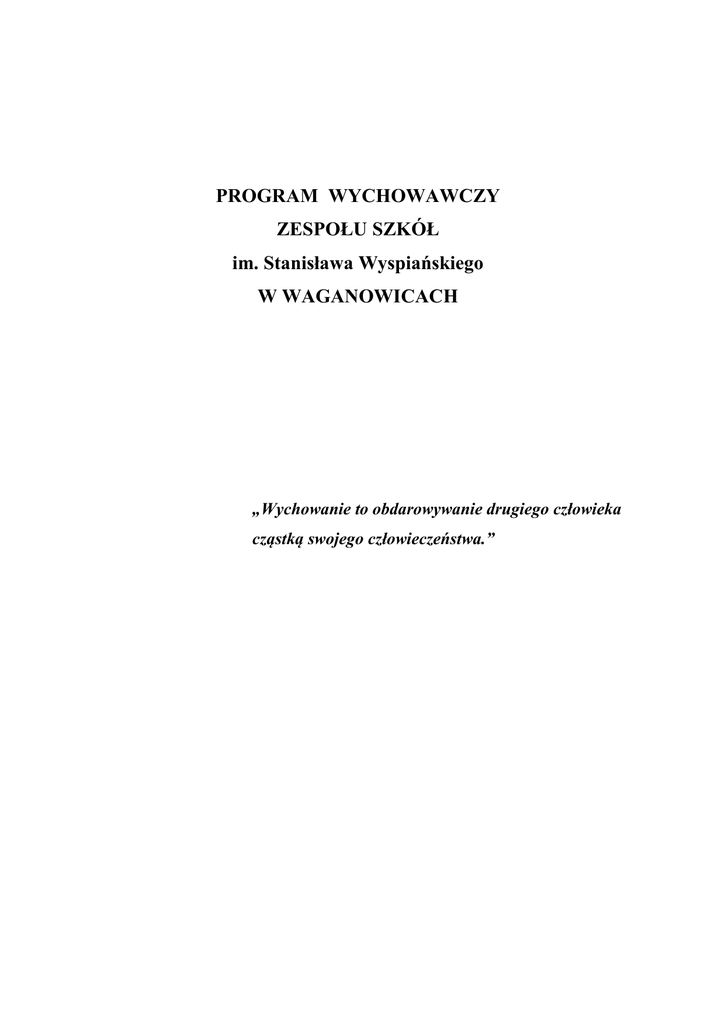 PROGRAM WYCHOWAWCZY ZESPOŁU SZKÓŁ im. Stanisława Wyspiańskiego W WAGANOWICACH „Wychowanie to obdarowywanie drugiego człowieka cząstką swojego człowieczeństwa.” 2 Podstawy prawne: Powszechna Deklaracja Praw Człowieka z 10 grudnia 1948r. Europejska Konwencja o Ochronie Praw Człowieka i podstawowych Wolności z 4 listopada 1950r. Deklaracja Praw Dziecka z 1959r. Konstytucja Rzeczypospolitej Polskiej z 1997r. (art. 48, 53, 70), Ustawa o systemie oświaty z 7.09. 1991 r. (art.1,5,33,34a,40) Ustawa z 26.01.1982 r. Karta Nauczyciela (art.6) Program Polityki Prorodzinnej Państwa z 17.11.1998r. Rozporządzenie MEN z 21 maja 2001r z późniejszymi zmianami w sprawie ramowych statutów publicznego przedszkola oraz publicznych szkół Statut Szkoły Podstawa programowa kształcenia ogólnego. Charakterystyka szkoły Zespół Szkół im. S. Wyspiańskiego w Waganowicach tworzy: Oddział Przedszkolny, Szkoła Podstawowa, Publiczne Gimnazjum i Szkoła Specjalna Przysposabiająca do Pracy. Szkoła jest szkołą ogólnodostępną, w której tworzy się klasy integracyjne i specjalne. Organizujemy również zajęcia rewalidacyjno – wychowawcze dla dzieci z upośledzeniem głębokim. W szkole uczniowie i rodzice mogą skorzystać z pomocy psychologicznej, pedagogicznej, logopedycznej i rehabilitacyjnej. Działa Grupa Wsparcia dla rodziców. Współpracujemy z Poradnią Psychologiczno – Pedagogiczną. Szkołą stara się rozwijać zainteresowania uczniów, dlatego każdego roku organizowane są koła zainteresowań przy współpracy z MGCK w Słomnikach. W szkole działają organizacje uczniowski: Samorząd Uczniowski, Harcerstwo, Gromada Zuchowa, Sekcja Olimpiad Specjalnych Koliber, SKO. 3 Uczniowie biorą udział i odnoszą sukcesy w licznych konkursach szkolnych i pozaszkolnych. Biorą udział w licznych wycieczkach dydaktycznych i krajoznawczych Każdego roku organizowane i podejmowane są różnego rodzaju spotkania, akcje, imprezy w tym charytatywne, w których czynny udział biorą rodzice. Dzięki swojej pracy i działalności szkoła jest dobrze znana w środowisku nie tylko lokalnym. Szkoła funkcjonuje na wsi – jest głównym centrum edukacyjnym i kulturowym. WIZJA Zespół Szkół im. Stanisława Wyspiańskiego w Waganowicach zapewnia każdemu uczniowi wszechstronny rozwój jego osobowości, dobrze przygotowuje do dalszego etapu kształcenia, daje podstawę wychowania w duchu takich wartości jak prawda, dobro, piękno, godność człowieka, rozwijając jednocześnie u uczniów poczucie odpowiedzialności, patriotyzmu oraz poszanowania polskiego dziedzictwa kulturowego i tradycji regionalnej. MISJA Jesteśmy społecznością uczniów, rodziców, nauczycieli i pracowników niepedagogicznych. Dobro dziecka i jego harmonijny rozwój w bezpiecznych warunkach jest dla nas sprawą najważniejszą. Pragniemy jak najlepiej przygotować młode pokolenie do wkroczenia w kolejny etap szkolnej edukacji. Naszym celem jest kształcenie uczniów wrażliwych na los drugiego człowieka, posiadających umiejętność odróżniania dobra od zła i w sposób wolny wybierających dobro. 4 Oferujemy uczniom swój czas, doświadczenie i pomoc w zdobywaniu wiedzy i rozwoju własnych uzdolnień i zainteresowań. Stawiamy sobie wysokie wymagania. Pragniemy się rozwijać i systematycznie podnosić jakość pracy szkoły. Stwarzamy warunki do tego, aby szkoła podstawowa, gimnazjum i szkoła ponadgimnazjalna funkcjonowały we wzajemnej symbiozie i skutecznie zbliżały się do ideału zespołu szkół integracyjnych. Model absolwenta szkoły: 1. Ma co najmniej przeciętny zasób wiadomości i umiejętności zawartych w podstawie programowej. Jest ciekawy świata, stale poszukuje prawdy i nowych wiadomości w różnych źródłach. Ustawicznie rozwija dotychczasowe zainteresowania i poszukuje nowych. Używa poprawnej polszczyzny w porozumiewaniu się z innymi ludźmi. Potrafi sprawnie formułować wypowiedź na różnorodne tematy. Posługuje się przynajmniej jednym językiem obcym w mowie i piśmie. Posiada kompetencje i z rozwagą posługuje się multimediami. Ma wypracowany własny styl uczenia się, potrafi przez dłuższy czas utrzymać koncentrację uwagi, stale poszerza zdolność zapamiętywania i kojarzenia faktów. 2. Jest prawy. Rozróżnia dobro od zła. Potrafi zweryfikować swoje postępowanie, a w razie potrzeby przyznać się do błędu i naprawić go. Opowiada się po stronie dobra własnego jak i drugiej osoby, chętnie pomaga osobom słabszym, jest zdolny do poświęceń. 3. Stale rozwija swoje życie duchowe. Posiada zdolność myślenia refleksyjnego. Jest nastawiony na ustawiczne poznawanie dorobku kultury. 4. Ma ukształtowaną postawę dialogu i słuchania innych. Jest gotowy do współdziałania i tworzenia wspólnoty. Jest odpowiedzialny za najbliższe środowisko społeczne i przyrodnicze. Samodzielnie podejmuje aktywność 5 społeczną i kulturalną. Chętnie uczestniczy w wydarzeniach o charakterze kulturalnym i patriotycznym. 5. Panuje nad swymi emocjami, potrafi je wyrażać w sposób akceptowany społecznie. Współdziała w grupie, nawiązuje satysfakcjonujące relacje rówieśnicze. W sposób konstruktywny rozwiązuje konflikty. 6. Jest rzetelny i punktualny. Dotrzymuje obietnic i zobowiązań. Umiejętnie planuje swoje zajęcia, nie marnuje swojego czasu i innych. Potrafi stawiać cele dostosowane do swoich możliwości i wytrwale dążyć do ich osiągnięcia. 7. Ma ugruntowane nawyki higieniczne. Wykazuje stosowną aktywność fizyczną. Dba o zdrowie i bezpieczeństwo swoje i innych. Świadomie planuje swoją prace i wypoczynek, potrafi przeciwdziałać stresowi. Główny cel wychowania Stworzenie środowiska wychowawczego sprzyjającego pełnemu, wszechstronnemu rozwojowi osobowemu ucznia. Cele szczegółowe: I. Nauka i praca: 1. Dobrowolne podejmowanie trudu nauki. 2. Pilność, czyli sprawność wykonywania wszystkiego, co robi się dobrze, w sposób najleps
