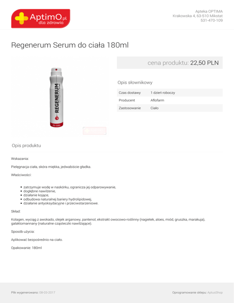 Apteka OPTIMA Krakowska 4, 63-510 Mikstat 531-470-109 Regenerum Serum do ciała 180ml cena produktu: 22,50 PLN Opis słownikowy Czas dostawy 1 dzień roboczy Producent Aflofarm Zastosowanie Ciało Opis produktu Wskazania: Pielęgnacja ciała, skóra miękka, jedwabiście gładka. Właściwości: zatrzymuje wodę w naskórku, ogranicza jej odparowywanie, dogłębne nawilżenie, działanie kojące, odbudowa naturalnej bariery hydrolipidowej, działanie antyoksydacyjne i przeciwstarzeniowe. Skład: Kolagen, wyciąg z awokado, olejek arganowy, pantenol, ekstrakt owocowo-roślinny (nagietek, aloes, miód, gruszka, marakuja), galaktomannany (naturalne cząsteczki nawilżające). Sposób użycia: Aplikować bezpośrednio na ciało. Opakowanie: 180ml Plik wygenerowano: 08-03-2017 Powered by TCPDF (www.tcpdf.org) Oprogramowanie sklepu: AptusShop