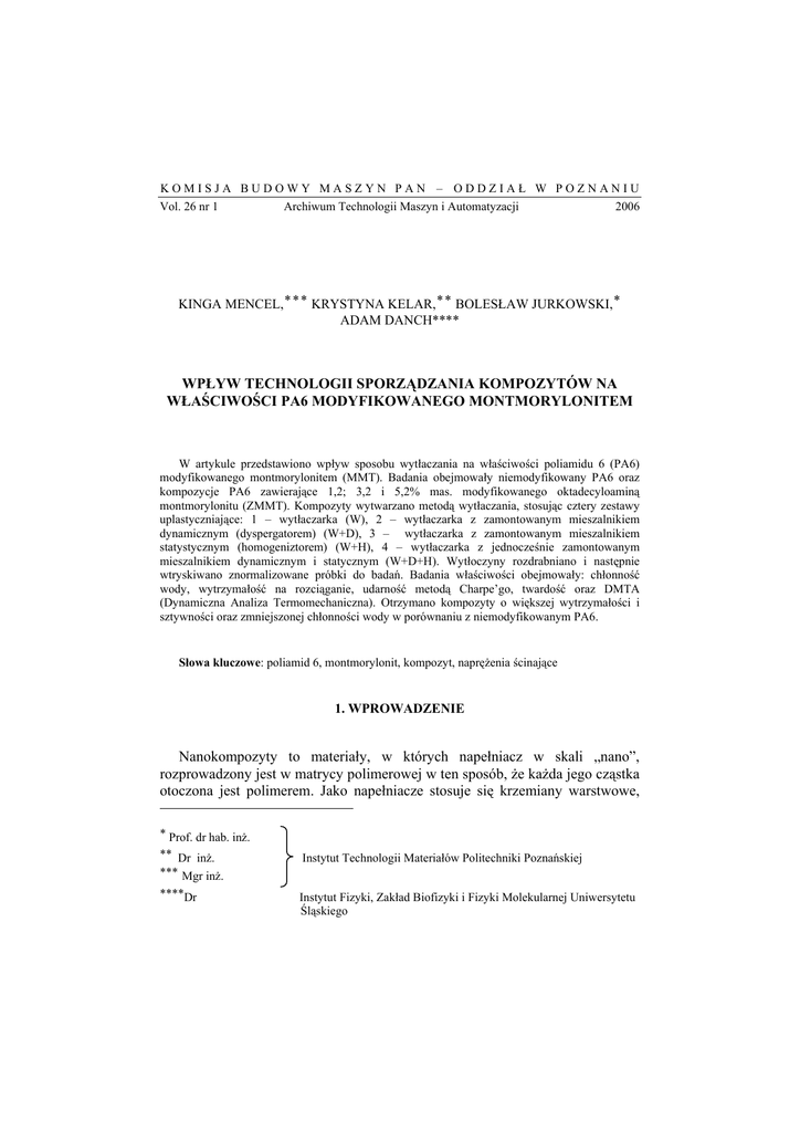 KOMISJA BUDOWY MASZYN PAN – ODDZIAŁ W POZNANIU Vol. 26 nr 1 Archiwum Technologii Maszyn i Automatyzacji 2006 KINGA MENCEL, * ** KRYSTYNA KELAR, ** BOLESŁAW JURKOWSKI, * ADAM DANCH**** WPŁYW TECHNOLOGII SPORZĄDZANIA KOMPOZYTÓW NA WŁAŚCIWOŚCI PA6 MODYFIKOWANEGO MONTMORYLONITEM W artykule przedstawiono wpływ sposobu wytłaczania na właściwości poliamidu 6 (PA6) modyfikowanego montmorylonitem (MMT). Badania obejmowały niemodyfikowany PA6 oraz kompozycje PA6 zawierające 1,2; 3,2 i 5,2% mas. modyfikowanego oktadecyloaminą montmorylonitu (ZMMT). Kompozyty wytwarzano metodą wytłaczania, stosując cztery zestawy uplastyczniające: 1 – wytłaczarka (W), 2 – wytłaczarka z zamontowanym mieszalnikiem dynamicznym (dyspergatorem) (W+D), 3 – wytłaczarka z zamontowanym mieszalnikiem statystycznym (homogeniztorem) (W+H), 4 – wytłaczarka z jednocześnie zamontowanym mieszalnikiem dynamicznym i statycznym (W+D+H). Wytłoczyny rozdrabniano i następnie wtryskiwano znormalizowane próbki do badań. Badania właściwości obejmowały: chłonność wody, wytrzymałość na rozciąganie, udarność metodą Charpe’go, twardość oraz DMTA (Dynamiczna Analiza Termomechaniczna). Otrzymano kompozyty o większej wytrzymałości i sztywności oraz zmniejszonej chłonności wody w porównaniu z niemodyfikowanym PA6. Słowa kluczowe: poliamid 6, montmorylonit, kompozyt, naprężenia ścinające 1. WPROWADZENIE Nanokompozyty to materiały, w których napełniacz w skali „nano”, rozprowadzony jest w matrycy polimerowej w ten sposób, że każda jego cząstka otoczona jest polimerem. Jako napełniacze stosuje się krzemiany warstwowe, * Prof. dr hab. inż. ** Dr inż. *** Mgr inż. Instytut Technologii Materiałów Politechniki Poznańskiej ****Dr Instytut Fizyki, Zakład Biofizyki i Fizyki Molekularnej Uniwersytetu Śląskiego 2 K. Mencel, K. Kelar, B. Jurkowski, A. Danch krzemionki, produkty węglowe w postaci sadzy, piłeczek (fulereny), rurek (nanorurki węglowe), szungity, metale i ich związki [2, 16, 20]. Wśród warstwowych krzemianów największe znaczenie ma montmorylonit (MMT), który jest krzemianem trójwarstwowym, zbudowanym z dwóch czworościanów glinowo-tlenowo-wodorotlenowych. Pomiędzy warstwami znajdują się kationy metali, głównie sodu [21]. Pojedyncza cząsteczka MMT ma postać płytki o grubości 1 nm i pozostałych wymiarach rzędu 0,2–2 μm. MMT jest związkiem hydrofilowym, co ogranicza jego mieszalność z hydrofobowymi polimerami i utrudnia otrzymanie homogenicznych dyspersji [2, 5–9, 23]. Z tego względu należy go poddać hydrofobizacji. Najczęstsza metoda modyfikacji tego typu minerałów polega na wprowadzeniu w miejsce kationów sodu różnego rodzaju kationów organicznych, głównie kationów amoniowych [6, 9, 13]. Po modyfikacji następuje zwiększenie odległości między płytkami MMT, co ułatwia wnikanie w przestrzenie te monomerów i polimerów. W zależności od ułożenia płytek MMT i stopnia ich uporządkowania w matrycy polimerowej wyróżnia się dwa rodzaje morfologii nanokompozytów: interkalacyjną i eksfoliacyjną [2, 14–19, 25]. O powstającej strukturze nanokompozytu decyduje głównie metoda jego otrzymywania oraz rodzaj związku modyfikującego MMT. Efekt eksfoliacji płytek MMT zależy od właściwości reologicznych polimeru matrycy, struktury modyfikatora, stężenia MMT, naprężeń ścinających oraz czasu przebywania polimeru w stanie uplastycznionym [2, 5, 16]. Celem badań była analiza wpływu sposobu wytłaczania na właściwości kompozytów poliamidowo-montmorylonitowych, wytwarzanych metodą mieszania uplastycznionego PA6 z montmorylonitem (MMT) modyfikowanym oktadecyloaminą (ZMMT). Zawartość ZMMT w kompozytach wynosiła 1,2; 3,2 i 5,2% mas. Właściwości kompozytów PA6/ZMMT porównywano z właściwościami niemodyfikowanego PA6, przetwarzanego w takich samych warunkach. 2. CZĘŚĆ DOŚWIADCZALNA 2.1. Stosowane surowce W badaniach stosowano następujące surowce: – hydrolityczny PA6 (MFR(230°C; 3,16 N) = 3,13 g/10 min.) o nazwie handlowej Technyl C 306 NAT, produkcji ZWCH „Stilon” S.A. Gorzów Wlkp., – montmorylonit (produkcji firmy Fluka), o zdolności wymiennej kationu 100 mmol/100 g, modyfikowany oktadecyloaminą [13]. Wpływ technologii sporządzania kompozytów na właściwości... 3 2.2. Sporządzanie kompozycji Granulat PA6 przed przetwórstwem suszono w komorze termicznej w temperaturze 80oC, przez 48 godzin. Kompozyty wytłaczano przy pomocy jednoślimakowej wytłaczarki Brabender (średnica ślimaka 16 mm) typu FOD 234 o L/D = 22:1. W badaniach zastosowano cztery różne zestawy uplastyczniające: 1 – wytłaczarka (W), 2 – wytłaczarka z zamontowanym mieszalnikiem dynamicznym (dyspergatorem) (W+D), 3 – wytłaczarka z zamontowanym mieszalnikiem statytycznym (homogenizatorem) (W+H), 4 – wytłaczarka z jednocześnie zamontowanym mieszalnikiem dynamicznym i statycznym (W+D+H). W każdym przypadku stosowano głowicę wytłaczarską z dyszą, nadającą wytłoczynie kołowy przekrój poprzeczny. Wymienione układy uplastyczniające zapewniały stałe, ale na różnym poziomie naprężenia (głównie ścinające). W celu dobrego wymieszania, odważonych z dokładnością 0,001 g surowców (PA6 i ZMMT), przed wprowadzeniem ich do leja zasypowego wytłaczarki, dodawano aceton (od 5 do 10 ml/100 g surowców) i następnie dokładnie mieszano do momentu jego całkowitego odparowania (do stałej masy naważki). W wyniku takiego sposobu przygotowania surowców, proszek ZMMT „oblepiał” granulat poliamidowy, co ułatwiało dozowanie ich do leja zasypowego i nie powodowało pylenia. Kompozycje wytłaczano w temperaturze 235±5oC, w atmosferze azotu, z prędkością obrotową ślimaka 50 min-1. Prędkość obrotowa ślimaka mieszalnika dynamicznego wynosiła 80 min-1. Wytłoczyny chłodzono w powietrzu do temperatury pokojowej i następnie rozdrabniano z użyciem młyna (typ 25-16/51, produ