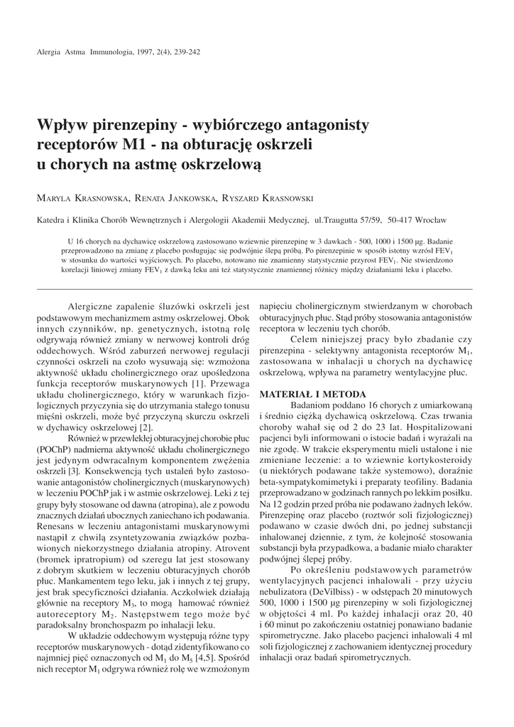 239 Alergia Astma Immunologia, 1997, 2(4), 239-242 Wp³yw pirenzepiny - wybiórczego antagonisty receptorów M1 - na obturacjê oskrzeli u chorych na astmê oskrzelow¹ MARYLA KRASNOWSKA, R ENATA J ANKOWSKA, R YSZARD K RASNOWSKI Katedra i Klinika Chorób Wewnêtrznych i Alergologii Akademii Medycznej, ul.Traugutta 57/59, 50-417 Wroc³aw U 16 chorych na dychawicê oskrzelow¹ zastosowano wziewnie pirenzepinê w 3 dawkach - 500, 1000 i 1500 µg. Badanie przeprowadzono na zmianê z placebo pos³uguj¹c siê podwójnie lep¹ prób¹. Po pirenzepinie w sposób istotny wzrós³ FEV1 w stosunku do wartoci wyjciowych. Po placebo, notowano nie znamienny statystycznie przyrost FEV1 . Nie stwierdzono korelacji liniowej zmiany FEV1 z dawk¹ leku ani te¿ statystycznie znamiennej ró¿nicy miêdzy dzia³aniami leku i placebo. Alergiczne zapalenie luzówki oskrzeli jest podstawowym mechanizmem astmy oskrzelowej. Obok innych czynników, np. genetycznych, istotn¹ rolê odgrywaj¹ równie¿ zmiany w nerwowej kontroli dróg oddechowych. Wród zaburzeñ nerwowej regulacji czynnoci oskrzeli na czo³o wysuwaj¹ siê: wzmo¿ona aktywnoæ uk³adu cholinergicznego oraz upoledzona funkcja receptorów muskarynowych [1]. Przewaga uk³adu cholinergicznego, który w warunkach fizjologicznych przyczynia siê do utrzymania sta³ego tonusu miêni oskrzeli, mo¿e byæ przyczyn¹ skurczu oskrzeli w dychawicy oskrzelowej [2]. Równie¿ w przewlek³ej obturacyjnej chorobie p³uc (POChP) nadmierna aktywnoæ uk³adu cholinergicznego jest jedynym odwracalnym komponentem zwê¿enia oskrzeli [3]. Konsekwencj¹ tych ustaleñ by³o zastosowanie antagonistów cholinergicznych (muskarynowych) w leczeniu POChP jak i w astmie oskrzelowej. Leki z tej grupy by³y stosowane od dawna (atropina), ale z powodu znacznych dzia³añ ubocznych zaniechano ich podawania. Renesans w leczeniu antagonistami muskarynowymi nast¹pi³ z chwil¹ zsyntetyzowania zwi¹zków pozbawionych niekorzystnego dzia³ania atropiny. Atrovent (bromek ipratropium) od szeregu lat jest stosowany z dobrym skutkiem w leczeniu obturacyjnych chorób p³uc. Mankamentem tego leku, jak i innych z tej grupy, jest brak specyficznoci dzia³ania. Aczkolwiek dzia³aj¹ g³ównie na receptory M3, to mog¹ hamowaæ równie¿ autoreceptory M 2 . Nastêpstwem tego mo¿e byæ paradoksalny bronchospazm po inhalacji leku. W uk³adzie oddechowym wystêpuj¹ ró¿ne typy receptorów muskarynowych - dot¹d zidentyfikowano co najmniej piêæ oznaczonych od M1 do M5 [4,5]. Sporód nich receptor M1 odgrywa równie¿ rolê we wzmo¿onym napiêciu cholinergicznym stwierdzanym w chorobach obturacyjnych p³uc. St¹d próby stosowania antagonistów receptora w leczeniu tych chorób. Celem niniejszej pracy by³o zbadanie czy pirenzepina - selektywny antagonista receptorów M1, zastosowana w inhalacji u chorych na dychawicê oskrzelow¹, wp³ywa na parametry wentylacyjne p³uc. MATERIA£ I METODA Badaniom poddano 16 chorych z umiarkowan¹ i rednio ciê¿k¹ dychawic¹ oskrzelow¹. Czas trwania choroby waha³ siê od 2 do 23 lat. Hospitalizowani pacjenci byli informowani o istocie badañ i wyra¿ali na nie zgodê. W trakcie eksperymentu mieli ustalone i nie zmieniane leczenie: a to wziewnie kortykosteroidy (u niektórych podawane tak¿e systemowo), doranie beta-sympatykomimetyki i preparaty teofiliny. Badania przeprowadzano w godzinach rannych po lekkim posi³ku. Na 12 godzin przed próba nie podawano ¿adnych leków. Pirenzepinê oraz placebo (roztwór soli fizjologicznej) podawano w czasie dwóch dni, po jednej substancji inhalowanej dziennie, z tym, ¿e kolejnoæ stosowania substancji by³a przypadkowa, a badanie mia³o charakter podwójnej lepej próby. Po okreleniu podstawowych parametrów wentylacyjnych pacjenci inhalowali - przy u¿yciu nebulizatora (DeVilbiss) - w odstêpach 20 minutowych 500, 1000 i 1500 µg pirenzepiny w soli fizjologicznej w objêtoci 4 ml. Po ka¿dej inhalacji oraz 20, 40 i 60 minut po zakoñczeniu ostatniej ponawiano badanie spirometryczne. Jako placebo pacjenci inhalowali 4 ml soli fizjologicznej z zachowaniem identycznej procedury inhalacji oraz badañ spirometrycznych. Alergia Astma Immunologia, 1997, 2(4), 239-242 Ocenie statystycznej poddano parametry FEV1 i delta FEV 1%. Obliczono rednie arytmetyczne i odchylenia standardowe. Istotnoæ ró¿nic rednich arytmetycznych badano testem t Studenta dla zmiennych po³¹czonych oraz obliczano wspó³czynnik korelacji. Przyjêto poziom istotnoci alfa=0,05. Obliczeñ dokonano przy u¿yciu arkusza kalkulacyjnego EXCEL 5.0 for WINDOWS. WYNIKI Po inhalacji 500 µg pirenzepiny wyst¹pi³a poprawa parametru FEV1 ze redniej wyjciowej 1,7±0,37L do 1,87±0,49L. Przyrost ten by³ znamienny statystycznie - p<0,05 (tab. I). Odpowiednie do tego badanie z placebo: FEV 1 wyjciowe 1,81±0,49L i koñcowe 1,96±0,42l (tab. II). Ró¿nica ta by³a nieznamienna. 2,0 p<0,01 FEV1 [l/min] 240 1000µg 1500µg ∆FEV1% 1,89 ±0,49 2,05 ±0,47 2,01 ±0,54 28,27 ±24,61 Tabela II. Parametry spirometryczne (FEV1) po nebulizacji placebo placebo wyjciowe (1 inhalacja) (2 inhalacja)(3 inhalacja) FEV1 [l] x±SD 1,81 ±0,49 1,96 ±0,42 1,97 ±0,48 1,95 ±0,46 ∆ FEV1% 23,96 ±33,41 500 µg 1000 µg dawka pirenzepiny 1500 µg przed po inhalacji Ryc. 1. FEV1 po nebulizacji pirenzepiny (* znamienna róznica w stosounku do wartoci wyjciowych) 2,0 1,8 FEV1 [l/min] 500µg 1,70 ±0,37 1,6 1,2 pirenzepina wyjciowe 1,8 1,4 Tabela I. Parametry spirometryczne (FEV1) po nebulizacji pirenzepiny FEV1 [l] x±SD ns 1,6 1,4 1,2 1 2 kolejna inhalacja placebo 3 przed po inhalacji Ryc. 2. FEV1 po nebulizacji placebo Po inhalacji kolejnej dawki 1000 µg pirenzepiny FEV1 wzros³o do 2,05±0,47l. W stosunku do pomiaru wyjciowego przyrost by³ istotny - p<0,01. Podobnie po 1500 µg leku stwierdzono znamienna poprawê wentylacji - p<0,01. Natomiast w próbie z placebo, aczkolwiek notowano przyrosty pomiarów w stosunku do wartoci wyjciowych, to ró¿nice nie by³y istotne statyst