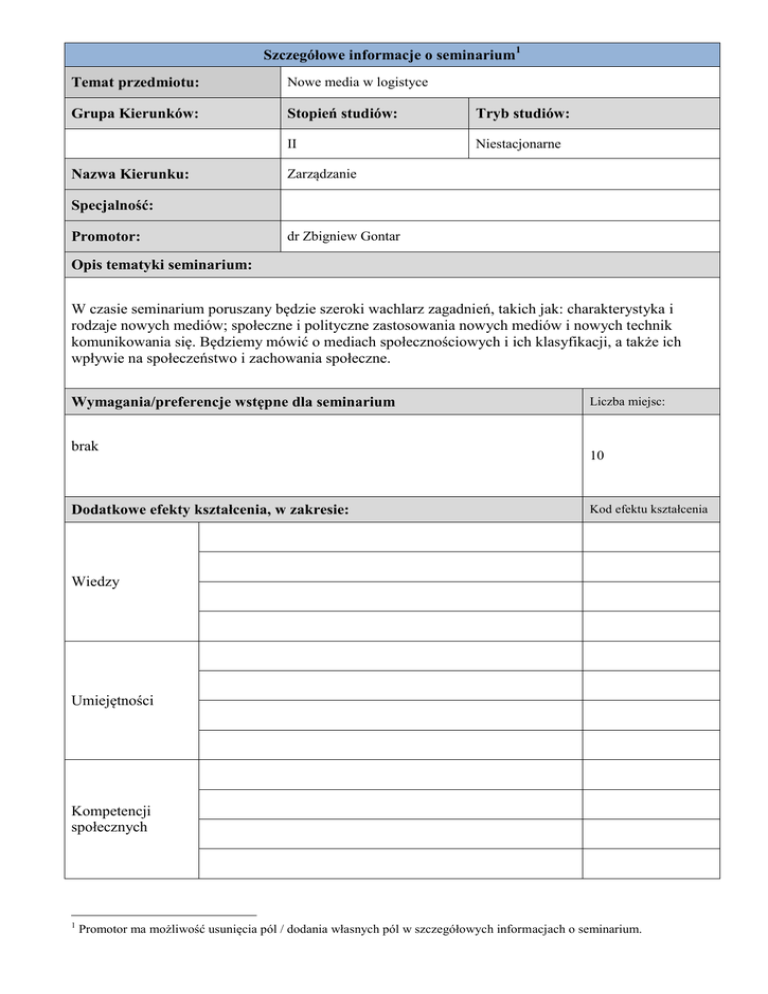 Szczegółowe informacje o seminarium1 Temat przedmiotu: Nowe media w logistyce Grupa Kierunków: Stopień studiów: Tryb studiów: II Niestacjonarne Nazwa Kierunku: Zarządzanie Specjalność: Promotor: dr Zbigniew Gontar Opis tematyki seminarium: W czasie seminarium poruszany będzie szeroki wachlarz zagadnień, takich jak: charakterystyka i rodzaje nowych mediów; społeczne i polityczne zastosowania nowych mediów i nowych technik komunikowania się. Będziemy mówić o mediach społecznościowych i ich klasyfikacji, a także ich wpływie na społeczeństwo i zachowania społeczne. Wymagania/preferencje wstępne dla seminarium brak Dodatkowe efekty kształcenia, w zakresie: Liczba miejsc: 10 Kod efektu kształcenia Wiedzy Umiejętności Kompetencji społecznych 1 Promotor ma możliwość usunięcia pól / dodania własnych pól w szczegółowych informacjach o seminarium. Szczegółowy opis przedmiotu: Treści programowe (tematy/problemy zajęć): L.g. dydaktycznych 1. Nowe media – definicje, charakterystyka, rodzaje 4 2. Fenomen mediów społecznościowych 4 3. Wykorzystanie nowych technologii komunikacyjnych (np. flesz mob czy smart mob) 2 4. Przykłady nowych mediów: facebook, Google+ i youtube 2 5. Przykłady nowych mediów: gry społecznościowe, podcasty 2 6. Przykłady nowych mediów: blogi, mikroblogi i vblogi 2 7. Prezentacje studentów z wybranych tematów 4 8. 9. 10. 11. 12. 13. 14. 15. Dodatkowa literatura: Obowiązkowa: „Nowe media. Wprowadzenie”, Martin Lister, Jon Dovey, Seth Giddings, Iain Grant, Kieran Kelly, Wydawnictwo: Wydawnictwo Uniwersytetu Jagiellońskiego, 2009, ISBN: 978-83-2332773-8 „Nowe nowe media”, Paul Levinson, Wydaw. WAM, Kraków 2010 Zalecana: Sposób obliczania oceny semestralnej / końcowej z przedmiotu (algorytm): Przygotowanie do seminarium oraz lektury bieżące (rozliczenie godzin zgodnie z kalkulatorem) – 30% Przygotowanie prezentacji zaliczeniowych (rozliczenie godzin zgodnie z kalkulatorem) – 30% Przygotowanie pracz dyplomowej – 40%
