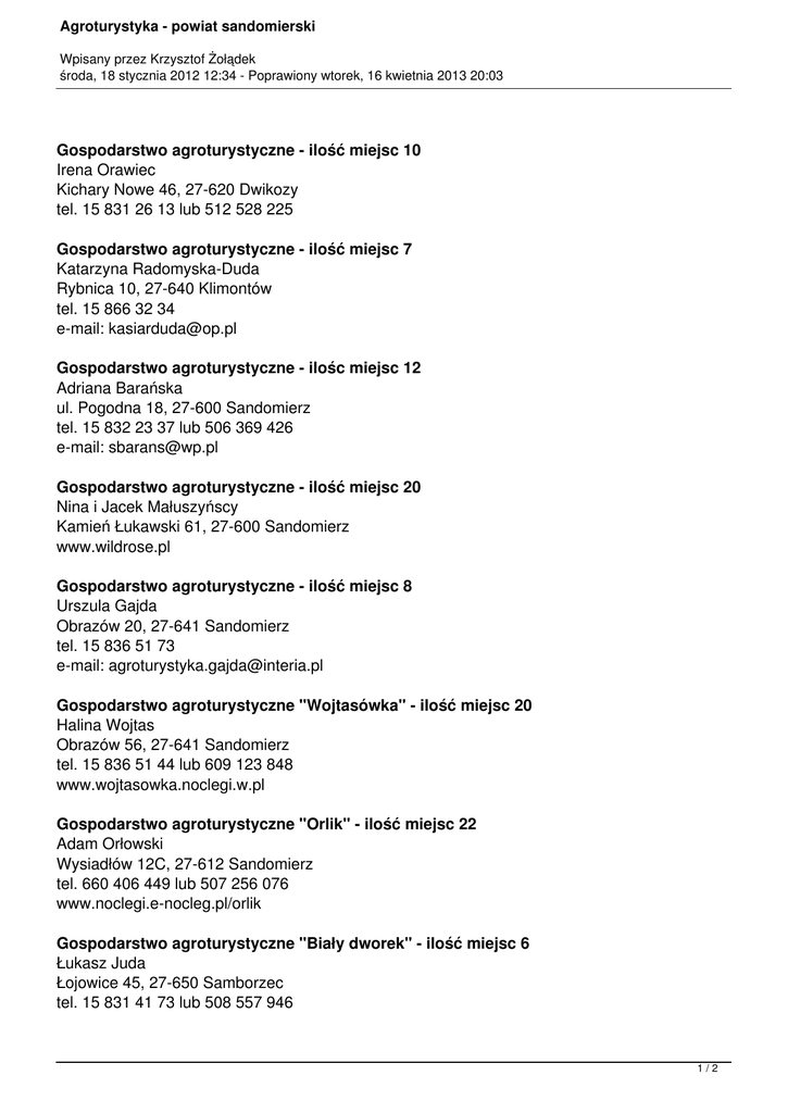 Agroturystyka - powiat sandomierski Wpisany przez Krzysztof Żołądek środa, 18 stycznia 2012 12:34 - Poprawiony wtorek, 16 kwietnia 2013 20:03 Gospodarstwo agroturystyczne - ilość miejsc 10 Irena Orawiec Kichary Nowe 46, 27-620 Dwikozy tel. 15 831 26 13 lub 512 528 225 Gospodarstwo agroturystyczne - ilość miejsc 7 Katarzyna Radomyska-Duda Rybnica 10, 27-640 Klimontów tel. 15 866 32 34 e-mail: [email protected] Gospodarstwo agroturystyczne - ilośc miejsc 12 Adriana Barańska ul. Pogodna 18, 27-600 Sandomierz tel. 15 832 23 37 lub 506 369 426 e-mail: [email protected] Gospodarstwo agroturystyczne - ilość miejsc 20 Nina i Jacek Małuszyńscy Kamień Łukawski 61, 27-600 Sandomierz www.wildrose.pl Gospodarstwo agroturystyczne - ilość miejsc 8 Urszula Gajda Obrazów 20, 27-641 Sandomierz tel. 15 836 51 73 e-mail: [email protected] Gospodarstwo agroturystyczne "Wojtasówka" - ilość miejsc 20 Halina Wojtas Obrazów 56, 27-641 Sandomierz tel. 15 836 51 44 lub 609 123 848 www.wojtasowka.noclegi.w.pl Gospodarstwo agroturystyczne "Orlik" - ilość miejsc 22 Adam Orłowski Wysiadłów 12C, 27-612 Sandomierz tel. 660 406 449 lub 507 256 076 www.noclegi.e-nocleg.pl/orlik Gospodarstwo agroturystyczne "Biały dworek" - ilość miejsc 6 Łukasz Juda Łojowice 45, 27-650 Samborzec tel. 15 831 41 73 lub 508 557 946 1/2 Agroturystyka - powiat sandomierski Wpisany przez Krzysztof Żołądek środa, 18 stycznia 2012 12:34 - Poprawiony wtorek, 16 kwietnia 2013 20:03 e-mail: [email protected] Gospodarstwo agroturystyczne - ilość miejsc 11 Tadeusz Godzawon Zawisełcze 2, 27-650 Samborzec tel. 15 832 31 40 lub 607 911 308 Gospodarstwo agroturystyczne - ilość miejsc 7 Irena Chmiel Złota 2, 27-650 Samborzec tel. 15 831 45 05 Gospodarstwo agroturystyczne "Dobrocka Dolina" - ilość miejsc 10 Grzegorz Ciźla Dobrocice 1, 27-612 Wilczyce tel. 15 821 34 22 lub 504 059 778 www.dobrockadolina.com.pl Gospodarstwo agroturystyczne - ilość miejsc ? Danuta i Leszek Sałata Pęczyny 40, 27-612 Wilczyce tel. 15 837 72 93 Gospodarstwo agroturystyczne - ilość miejsc 8 Beata i Piotr Panasiuk Czyżów Szlachecki 43, 27-630 Zawichost tel. 15 835 51 34 e-mail: [email protected] Gospodarstwo agroturystyczne - ilość miejsc ? Halina i Eugeniusz Pileccy Czyżów Szlachecki 64, 27-630 Zawichost tel. 15 835 52 59 2/2
