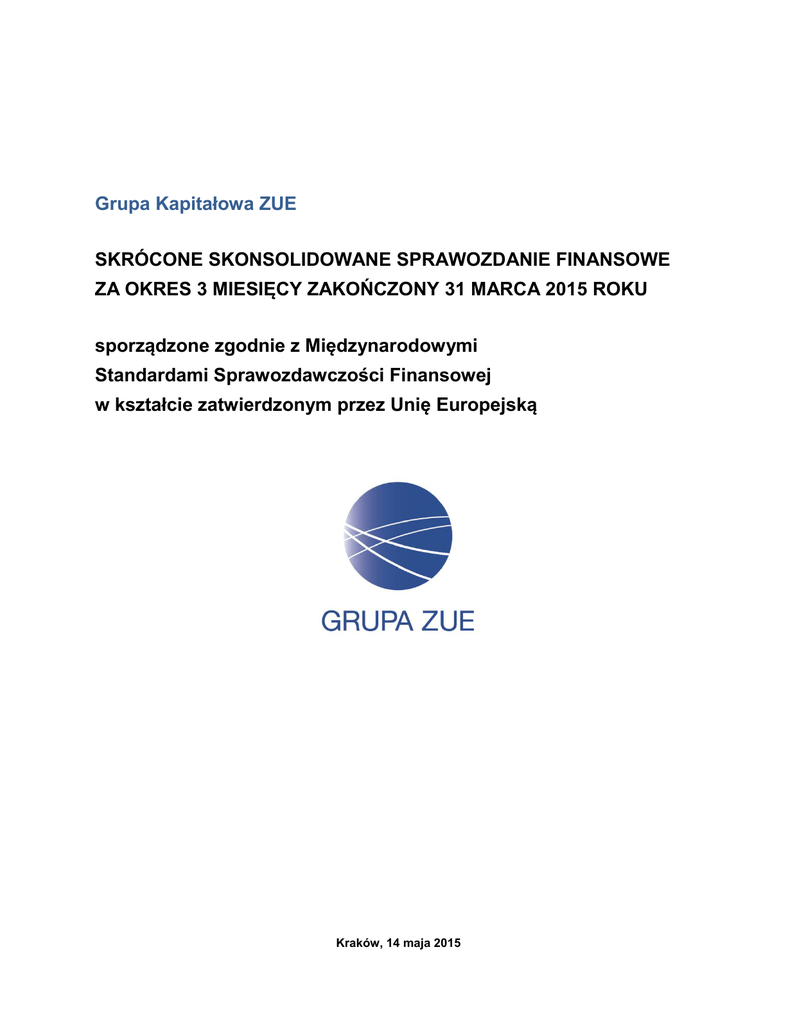 Grupa Kapitałowa ZUE SKRÓCONE SKONSOLIDOWANE SPRAWOZDANIE FINANSOWE ZA OKRES 3 MIESIĘCY ZAKOŃCZONY 31 MARCA 2015 ROKU sporządzone zgodnie z Międzynarodowymi Standardami Sprawozdawczości Finansowej w kształcie zatwierdzonym przez Unię Europejską Kraków, 14 maja 2015 Grupa Kapitałowa ZUE Skrócone skonsolidowane sprawozdanie finansowe za okres 3 miesięcy zakończony 31 marca 2015 roku Zawartość skonsolidowanego raportu kwartalnego: I. Wybrane dane finansowe Grupy Kapitałowej ZUE II. Skonsolidowane sprawozdanie finansowe Grupy Kapitałowej ZUE III. Dodatkowe informacje i objaśnienia do skróconego skonsolidowanego sprawozdania finansowego Grupy Kapitałowej ZUE IV. Wybrane dane finansowe ZUE V. Jednostkowe sprawozdanie finansowe ZUE VI. Dodatkowe informacje i objaśnienia do skróconego jednostkowego sprawozdania finansowego ZUE 2 Grupa Kapitałowa ZUE Skrócone skonsolidowane sprawozdanie finansowe za okres 3 miesięcy zakończony 31 marca 2015 roku Stosowane skróty i oznaczenia: ZUE, Spółka ZUE S. A. z siedzibą w Krakowie, wpisana do Krajowego Rejestru Sądowego pod numerem KRS 0000135388, akta rejestrowe prowadzone przez Sąd Rejonowy dla Krakowa – Śródmieścia w Krakowie, XI Wydział Gospodarczy Krajowego Rejestru Sądowego, kapitał zakładowy 5 757 520,75 PLN, wpłacony w całości. Podmiot dominujący Grupy Kapitałowej ZUE. BIUP Biuro Inżynieryjnych Usług Projektowych Sp. z o.o. z siedzibą w Krakowie, wpisana do Krajowego Rejestru Sądowego pod numerem KRS 0000332405, akta rejestrowe prowadzone przez Sąd Rejonowy dla Krakowa – Śródmieścia w Krakowie, XI Wydział Gospodarczy Krajowego Rejestru Sądowego, kapitał zakładowy 2 017 850 PLN, wpłacony w całości. Podmiot zależny od ZUE. RTI Railway Technology International Sp. z o.o. z siedzibą w Krakowie, wpisana do Krajowego Rejestru Sądowego pod numerem KRS 0000397032, akta rejestrowe prowadzone przez Sąd Rejonowy dla Krakowa – Śródmieścia w Krakowie, XI Wydział Gospodarczy Krajowego Rejestru Sądowego, kapitał zakładowy 50 000 PLN, wpłacony w całości. Podmiot zależny od ZUE. RTI Germany Railway Technology International Germany GmbH z siedzibą w Hamburgu, Niemcy. Kapitał zakładowy 25 000 EUR, wpłacony w całości. Podmiot zależny od Railway Technology International Sp. z o.o. z siedzibą w Krakowie. BPK Poznań Biuro Projektów Komunikacyjnych w Poznaniu Sp. z o.o. z siedzibą w Poznaniu, wpisana do Krajowego Rejestru Sądowego pod numerem KRS 0000160302, akta rejestrowe prowadzone są przez Sąd Rejonowy Poznań Nowe Miasto i Wilda, VIII Wydział Gospodarczy Krajowego Rejestru Sądowego, kapitał zakładowy 2 170 000 PLN, wpłacony w całości. Podmiot zależny od BIUP. BPK Gdańsk Biuro Projektów Kolejowych w Gdańsku Sp. z o.o. w likwidacji z siedzibą w Gdańsku, wpisana do Krajowego Rejestru Sądowego pod numerem KRS 0000273363, akta rejestrowe prowadzone są przez Sąd Rejonowy Gdańsk-Północ, VII Wydział Gospodarczy Krajowego Rejestru Sądowego, kapitał zakładowy 1 000 000 PLN, wpłacony w całości. Jednostka stowarzyszona. Raliway gft Raliway gft Polska Sp. z o.o. z siedzibą w Krakowie, wpisana do Krajowego Rejestru Sądowego pod numerem KRS 0000532311, akta rejestrowe prowadzone przez Sąd Rejonowy dla Krakowa – Śródmieścia w Krakowie, XI Wydział Gospodarczy Krajowego Rejestru Sądowego, kapitał zakładowy 5 000 PLN, wpłacony w całości. Grupa ZUE, Grupa, Grupa Kapitałowa Grupa Kapitałowa ZUE, w skład której na dzień bilansowy wchodzą: ZUE S.A., Biuro Inżynieryjnych Usług Projektowych Sp. z o.o., Railway Technology International Sp. z o.o., Biuro Projektów Komunikacyjnych w Poznaniu Sp. z o.o., Railway Technology International Germany GmbH. PLN Złoty polski EUR Euro ksh Ustawa Kodeks Spółek Handlowych (Dz. U. 2000 roku nr 94 poz. 1037 z późn. zmianami) Dane o wysokości kapitałów zakładowych są podane według stanu na dzień 31 marca 2015 roku. 3 Grupa Kapitałowa ZUE Skrócone skonsolidowane sprawozdanie finansowe za okres 3 miesięcy zakończony 31 marca 2015 roku SPIS TREŚCI ZATWIERDZENIE SKRÓCONEGO SKONSOLIDOWANEGO SPRAWOZDANIA FINANSOWEGO ........................................... 6 I. WYBRANE DANE FINANSOWE GRUPY KAPITAŁOWEJ ZUE ........................................................................................ 7 II. SKONSOLIDOWANE SPRAWOZDANIE FINANSOWE GRUPY KAPITAŁOWEJ ZUE ...................................................... 8 Skonsolidowane sprawozdanie z całkowitych dochodów ............................................................................................. 8 Skonsolidowane sprawozdanie z sytuacji finansowej ................................................................................................... 9 Skonsolidowane sprawozdanie ze zmian w kapitałach własnych ............................................................................... 10 Skonsolidowane sprawozdanie z przepływów pieniężnych ......................................................................................... 11 III. DODATKOWE INFORMACJE I OBJAŚNIENIA DO SKRÓCONEGO SKONSOLIDOWANEGO SPRAWOZDANIA FINANSOWEGO GRUPY KAPITAŁOWEJ ZUE ........................................................................................................................ 12 1. Informacje ogólne .................................................................................................................................................... 12 1.1. Skład Grupy Kapitałowej i podstawowy przedmiot jej działalności ................................................................... 12 1.2. Jednostki podlegające konsolidacji ................................................................................................................. 15 1.3. Opis zmian w strukturze Grupy wraz ze wskazaniem ich skutków................................................................... 16 1.4. Waluta funkcjonalna i waluta sprawozdawcza ................
