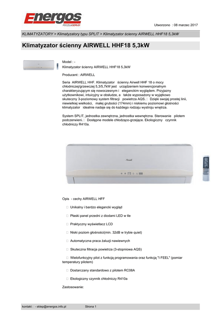 Utworzono : 08 marzec 2017 KLIMATYZATORY > Klimatyzatory typu SPLIT > Klimatyzator ścienny AIRWELL HHF18 5,3kW Klimatyzator ścienny AIRWELL HHF18 5,3kW Model : Klimatyzator ścienny AIRWELL HHF18 5,3kW Producent : AIRWELL Seria AIRWELL HHF. Klimatyzator ścienny Airwell HHF 18 o mocy chłodniczej/grzewczej 5,3/5,7kW jest urządzeniem konwencjonalnym charakteryzującym się nowoczesnym i eleganckim wyglądem. Przyjazny użytkownikowi, intuicyjny w obsłudze, a także wyposażony w wyjątkowo skuteczny 3-poziomowy system filtracji powietrza AQS.� Dzięki swojej prostej linii, niewielkiej wielkości, małej grubości (174mm) i niskiemu poziomowi głośności klimatyzator idealnie nadaje się do każdego rodzaju wystroju wnętrza. System SPLIT, jednostka zewnętrzna, jednostka wewnętrzna. Sterowanie pilotem podczerwieni.� Dostępne modele chłodząco-grzejące. Ekologiczny czynnik chłodniczy R410a. Opis - cechy AIRWELL HFF � Unikalny i bardzo elegancki wygląd � Płaski panel przedni z diodami LED w tle � Praktyczny wyświetlacz LCD � Niski poziom głośności(min. 32dB w trybie quiet) � Automatyczna praca żaluzji nawiewnych � Skuteczna filtracja powietrza (3-stopniowa AQS) � Wielofunkcyjny pilot z funkcją programowania oraz funkcją "I FEEL" (pomiar temperatury pilotem) � Dostarczany standardowo z pilotem RC08A � Ekologiczny czynnik chłodniczy R410a Zastosowanie: kontakt : - [email protected] Strona 1 Utworzono : 08 marzec 2017 KLIMATYZATORY > Klimatyzatory typu SPLIT > Klimatyzator ścienny AIRWELL HHF18 5,3kW Klimatyzator ścienny AIRWELL HHF18 5,3kW � Pokoje mieszkalne, hotelowe, domy mieszkalne, salony, biura, gabinety, obiekty użyteczności publicznej, bary, restauracje, sklepy, puby, itp. Moc chłodnicza: 5,3 kW Moc grzewcza: 5,7 kW Sterowanie: Pilot RC08A - standard Filtracja: system AQS Zastosowanie:� Pomieszczenia biurowe, mieszkalne, sklepy i inne Karta katalogowa produktu: Cena : 2.850,00 zł Brutto ( 2.317,07 zł Netto) Dostępność: Produkt dostępny w naszym sklepie od 14 lipiec 2009 kontakt : - [email protected] Strona 2