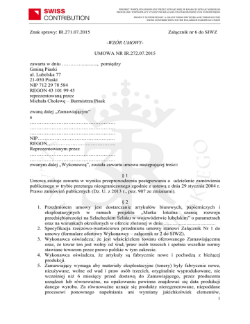 PROJEKT WSPÓŁFINANSOWANY PRZEZ SZWAJCARIĘ W RAMACH SZWAJCARSKIEGO PROGRAMU WSPÓŁPRACY Z NOWYMI KRAJAMI CZŁONKOWSKIMI UNII EUROPEJSKIEJ PROJECT SUPPORTED BY A GRANT FROM SWITZERLAND THROUGH THE SWISS CONTRIBUTION TO THE ENLARGED EUROPEAN UNION Znak sprawy: IR.271.07.2015 Załącznik nr 6 do SIWZ -WZÓR UMOWYUMOWA NR IR.272.07.2015 zawarta w dniu …………............, pomiędzy Gminą Piaski ul. Lubelska 77 21-050 Piaski NIP 712 29 78 584 REGON 43 101 99 45 reprezentowaną przez Michała Cholewę – Burmistrza Piask zwaną dalej „Zamawiającym” a …………………………………………… …………………………………………… …………………………………………… NIP………………………………………. REGON………………………………….. Reprezentowanym przez …………………………………………… …………………………………………… zwanym dalej „Wykonawcą”, została zawarta umowa następującej treści: §1 Umowa zostaje zawarta w wyniku przeprowadzenia postępowania o udzielenie zamówienia publicznego w trybie przetargu nieograniczonego zgodnie z ustawą z dnia 29 stycznia 2004 r. Prawo zamówień publicznych (Dz. U. z 2013 r., poz. 907 ze zmianami). §2 1. Przedmiotem umowy jest dostarczanie artykułów biurowych, papierniczych i eksploatacyjnych w ramach projektu „Marka lokalna szansą rozwoju przedsiębiorczości na Szlacheckim Szlaku w województwie lubelskim” o parametrach oraz na warunkach określonych w ofercie złożonej w dniu ......................................... 2. Specyfikacja rzeczowo-wartościowa przedmiotu umowy stanowi Załącznik Nr 1 do umowy (formularz ofertowy Wykonawcy – załącznik nr 2 do SIWZ). 3. Wykonawca oświadcza, że jest właścicielem towaru oferowanego Zamawiającemu oraz, że towar ten jest wolny od wad, praw osób trzecich i spełnia wszelkie normy stawiane towarom przez prawo polskie w tym zakresie. 4. Wykonawca oświadcza, że artykuły są fabrycznie nowe i pochodzą z bieżącej produkcji. 5. Zamawiający wymaga aby materiały eksploatacyjne (tonery) były fabrycznie nowe, nieużywane, wolne od wad i praw osób trzecich, oryginalnie wyprodukowane, nie wcześniej niż 6 miesięcy przed dostawą do Zamawiającego, przez producenta urządzeń lub równoważne, na opakowaniu powinna znajdować się data produkcji danego wyrobu. Za równoważne uznaje się produkty nieregenerowane, niepoddane procesowi ponownego napełniania ani wymiany jakichkolwiek elementów, 1 PROJEKT WSPÓŁFINANSOWANY PRZEZ SZWAJCARIĘ W RAMACH SZWAJCARSKIEGO PROGRAMU WSPÓŁPRACY Z NOWYMI KRAJAMI CZŁONKOWSKIMI UNII EUROPEJSKIEJ PROJECT SUPPORTED BY A GRANT FROM SWITZERLAND THROUGH THE SWISS CONTRIBUTION TO THE ENLARGED EUROPEAN UNION kompatybilne z urządzeniami, w których będą wykorzystywane i niepowodujące uszkodzeń ani zaburzeń w pracy urządzeń, do których są przeznaczone. Równoważne materiały muszą mieć wydajność co najmniej taką, jaka została podana w załączniku do SIWZ. Materiały równoważne muszą działać analogicznie, jak materiały oryginalne producenta urządzeń i posiadać elementy elektroniczne dające komunikaty przy pracy w sieci. 6. Jeżeli Wykonawca zaoferuje materiały równoważne, Zamawiający może wymagać od niego zapewnienia gwarancji zwrotu kosztów naprawy urządzenia, wymiany urządzenia na nowe lub przejęcia gwarancji producenta urządzenia, jeżeli bezpośrednią przyczyną awarii urządzeń będzie zastosowanie dostarczonych materiałów eksploatacyjnych. 7. Jeżeli w trakcie trwania umowy Zamawiający stwierdzi, iż wydajność, jakość lub niezawodność dostarczonych produktów niekorzystnie odbiega od parametrów produktu oryginalnego (pochodzącego od producenta urządzenia, do którego materiał jest przeznaczony) lub jeżeli produkt nie sygnalizuje we właściwy sposób stanu zużycia tuszu lub tonera, Wykonawca na żądanie Zamawiającego winien materiał oferowany w asortymencie, którego żądanie dotyczy, wymienić na materiał spełniający wymagania Zamawiającego (np. pochodzący od producenta, do którego materiał jest przeznaczony), bez zmiany ceny. 8. Dostarczone przez Wykonawcę materiały eksploatacyjne będą posiadały znak firmowy producenta, etykiety zawierające numer katalogowy i jego termin, listę kompatybilności (typ drukarek, urządzeń wielofunkcyjnych, do których są przystosowane) oraz nienaruszone cechy pierwotnego opakowania. §3 1. Miejscem dostawy artykułów biurowych, papierniczych i eksploatacyjnych jest Urząd Miejski w Piaskach, ul. Lubelska 77, 21-050 Piaski, sekretariat – pok. nr 12, I piętro. 2. Wykonawca zobowiązuję się dostarczyć zamówiony w terminie: do … dni od dnia zawarcia umowy. §4 1. Wartość przedmiotu umowy, zgodnie ze złożoną ofertą wynosi ………………………….. zł brutto (słownie: ……………………………………………………………………. złotych brutto). 2. Wartość brutto jest ceną ostateczną umowy zawierającą zapłatę za przedmiot umowy, wszelkie inne koszty związane z jej realizacją wraz z podatkiem od towarów i usług VAT, w tym koszty dostarczenia do siedziby Zamawiającego oraz wszystkie koszty pochodne (między innymi: ubezpieczenia, opłaty celne, itp.). 3. Wykonawcy przysługuje wynagrodzenie za dostarczony i odebrany przez Zamawiającego towar. 4. Płatność za dostarczony towar nastąpi w formie przelewu na rachunek bankowy Wykonawcy w terminie 7 dni od dnia otrzymania faktury. 5. Za dzień zapłaty uważany będzie dzień złożenia przez Zamawiającego dyspozycji obciążenia rachunku Zamawiającego kwotą wynagrodzenia. §5 1. Materiały biurowe i papiernicze dostarczone do siedziby Zamawiającego, będą kontrolowane pod względem ilościowym, jakościowym oraz wad jawnych. 2. Odbiór ilościowy i jakościowy odbędzie się w siedzibie Zamawiającego. 2 PROJEKT WSPÓŁFINANSO