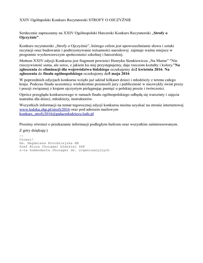 XXIV Ogólnpolski Konkurs Recytatorski STROFY O OJCZYŹNIE Serdecznie zapraszamy na XXIV Ogólnopolski Harcerski Konkurs Recytatorski „Strofy o Ojczyźnie”. Konkurs recytatorski „Strofy o Ojczyźnie”, którego celem jest upowszechnianie słowa i sztuki recytacji oraz budowanie i podtrzymywanie tożsamości narodowej zajmuje ważne miejsce w programie wychowawczym społeczności szkolnej i harcerskiej. Mottem XXIV edycji Konkursu jest fragment powieści Henryka Sienkiewicza „Na Marne” "Nie rzeczywistość sama, ale serce, z jakiem ku niej przystępujemy, daje rzeczom kształty i kolory."Na zgłoszenia do eliminacji dla województwa łódzkiego oczekujemy do2 kwietnia 2016. Na zgłoszenia do finału ogólnopolskiego oczekujemy do5 maja 2016 W poprzednich edycjach konkursu wzięło już udział kilkaset dzieci i młodzieży z terenu całego kraju. Podczas finału uczestnicy wielokrotnie przenosili jury i publiczność w niezwykły świat prozy i poezji związanej z krajem ojczystym pielęgnując pamięć o polskiej prozie i twórczości. Oprócz przeglądu konkursowego w ramach finału ogólnopolskiego odbędą się warsztaty i zajęcia teatralne dla dzieci, młodzieży, instruktorów. Wszystkich informacji na temat tegorocznej edycji konkursu można uzyskać na stronie internetowej www.lodzka.zhp.pl/strofy2016 oraz pod adresem mailowym [email protected] Prosimy również o przekazanie informacji podległym hufcom oraz wszystkim zainteresowanym. Z góry dziękuję:) -Czuwaj! hm. Magdalena Kołodziejska HR Szef Biura Chorągwi Łódzkiej ZHP z-ca komendanta chorągwi ds. organizacyjnych