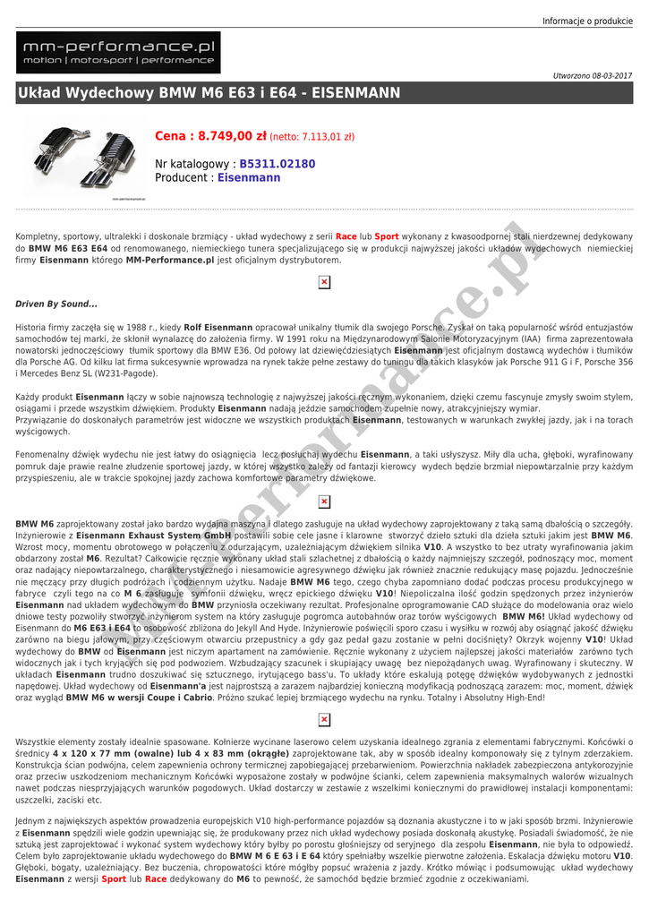 Informacje o produkcie Utworzono 08-03-2017 Układ Wydechowy BMW M6 E63 i E64 - EISENMANN Cena : 8.749,00 zł (netto: 7.113,01 zł) Nr katalogowy : B5311.02180 Producent : Eisenmann ce .p l Kompletny, sportowy, ultralekki i doskonale brzmiący - układ wydechowy z serii Race lub Sport wykonany z kwasoodpornej stali nierdzewnej dedykowany do BMW M6 E63 E64 od renomowanego, niemieckiego tunera specjalizującego się w produkcji najwyższej jakości układów wydechowych niemieckiej firmy Eisenmann którego MM-Performance.pl jest oficjalnym dystrybutorem. Driven By Sound... an Historia firmy zaczęła się w 1988 r., kiedy Rolf Eisenmann opracował unikalny tłumik dla swojego Porsche. Zyskał on taką popularność wśród entuzjastów samochodów tej marki, że skłonił wynalazcę do założenia firmy. W 1991 roku na Międzynarodowym Salonie Motoryzacyjnym (IAA) firma zaprezentowała nowatorski jednoczęściowy tłumik sportowy dla BMW E36. Od połowy lat dziewięćdziesiątych Eisenmann jest oficjalnym dostawcą wydechów i tłumików dla Porsche AG. Od kilku lat firma sukcesywnie wprowadza na rynek także pełne zestawy do tuningu dla takich klasyków jak Porsche 911 G i F, Porsche 356 i Mercedes Benz SL (W231-Pagode). rm Każdy produkt Eisenmann łączy w sobie najnowszą technologię z najwyższej jakości ręcznym wykonaniem, dzięki czemu fascynuje zmysły swoim stylem, osiągami i przede wszystkim dźwiękiem. Produkty Eisenmann nadają jeździe samochodem zupełnie nowy, atrakcyjniejszy wymiar. Przywiązanie do doskonałych parametrów jest widoczne we wszystkich produktach Eisenmann, testowanych w warunkach zwykłej jazdy, jak i na torach wyścigowych. er fo Fenomenalny dźwięk wydechu nie jest łatwy do osiągnięcia lecz posłuchaj wydechu Eisenmann, a taki usłyszysz. Miły dla ucha, głęboki, wyrafinowany pomruk daje prawie realne złudzenie sportowej jazdy, w której wszystko zależy od fantazji kierowcy wydech będzie brzmiał niepowtarzalnie przy każdym przyspieszeniu, ale w trakcie spokojnej jazdy zachowa komfortowe parametry dźwiękowe. M M -P BMW M6 zaprojektowany został jako bardzo wydajna maszyna i dlatego zasługuje na układ wydechowy zaprojektowany z taką samą dbałością o szczegóły. Inżynierowie z Eisenmann Exhaust System GmbH postawili sobie cele jasne i klarowne stworzyć dzieło sztuki dla dzieła sztuki jakim jest BMW M6. Wzrost mocy, momentu obrotowego w połączeniu z odurzającym, uzależniającym dźwiękiem silnika V10. A wszystko to bez utraty wyrafinowania jakim obdarzony został M6. Rezultat? Całkowicie ręcznie wykonany układ stali szlachetnej z dbałością o każdy najmniejszy szczegół, podnoszący moc, moment oraz nadający niepowtarzalnego, charakterystycznego i niesamowicie agresywnego dźwięku jak również znacznie redukujący masę pojazdu. Jednocześnie nie męczący przy długich podróżach i codziennym użytku. Nadaje BMW M6 tego, czego chyba zapomniano dodać podczas procesu produkcyjnego w fabryce czyli tego na co M 6 zasługuje symfonii dźwięku, wręcz epickiego dźwięku V10! Niepoliczalna ilość godzin spędzonych przez inżynierów Eisenmann nad układem wydechowym do BMW przyniosła oczekiwany rezultat. Profesjonalne oprogramowanie CAD służące do modelowania oraz wielo dniowe testy pozwoliły stworzyć inżynierom system na który zasługuje pogromca autobahnów oraz torów wyścigowych BMW M6! Układ wydechowy od Eisenmann do M6 E63 i E64 to osobowość zbliżona do Jekyll And Hyde. Inżynierowie poświęcili sporo czasu i wysiłku w rozwój aby osiągnąć jakość dźwięku zarówno na biegu jałowym, przy częściowym otwarciu przepustnicy a gdy gaz pedał gazu zostanie w pełni dociśnięty? Okrzyk wojenny V10! Układ wydechowy do BMW od Eisenmann jest niczym apartament na zamówienie. Ręcznie wykonany z użyciem najlepszej jakości materiałów zarówno tych widocznych jak i tych kryjących się pod podwoziem. Wzbudzający szacunek i skupiający uwagę bez niepożądanych uwag. Wyrafinowany i skuteczny. W układach Eisenmann trudno doszukiwać się sztucznego, irytującego bass'u. To układy które eskalują potęgę dźwięków wydobywanych z jednostki napędowej. Układ wydechowy od Eisenmann'a jest najprostszą a zarazem najbardziej konieczną modyfikacją podnoszącą zarazem: moc, moment, dźwięk oraz wygląd BMW M6 w wersji Coupe i Cabrio. Próżno szukać lepiej brzmiącego wydechu na rynku. Totalny i Absolutny High-End! Wszystkie elementy zostały idealnie spasowane. Kołnierze wycinane laserowo celem uzyskania idealnego zgrania z elementami fabrycznymi. Końcówki o średnicy 4 x 120 x 77 mm (owalne) lub 4 x 83 mm (okrągłe) zaprojektowane tak, aby w sposób idealny komponowały się z tylnym zderzakiem. Konstrukcja ścian podwójna, celem zapewnienia ochrony termicznej zapobiegającej przebarwieniom. Powierzchnia nakładek zabezpieczona antykorozyjnie oraz przeciw uszkodzeniom mechanicznym Końcówki wyposażone zostały w podwójne ścianki, celem zapewnienia maksymalnych walorów wizualnych nawet podczas niesprzyjających warunków pogodowych. Układ dostarczy w zestawie z wszelkimi koniecznymi do prawidłowej instalacji komponentami: uszczelki, zaciski etc. Jednym z największych aspektów prowadzenia europejskich V10 high-performance pojazdów są doznania akustyczne i to w jaki sposób brzmi. Inżynierowie z Eisenmann spędzili wiele godzin upewniając się, że produkowany przez nich układ wydechowy posiada doskonałą akustykę. Posiadali świadomość, że nie sztuką jest zaprojektować i wykonać system wydechowy który byłby po porostu głośniejszy od seryjnego dla zespołu Eisenmann, nie była to odpowiedź. Celem było zaprojektowanie układu wydechowego do BMW M 6 E 63 i E 64 który spełniałby wszelkie pierwotne założenia. Eskalacja dźwięku motoru V10. Głęboki, bogaty, uzależniający. Bez buczenia, chropowatości które mógłby popsuć wrażenia z jazdy. Krótko m