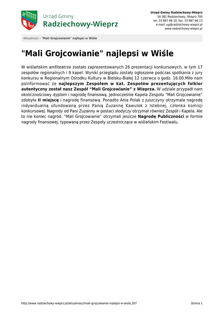 Urząd Gminy Radziechowy-Wieprz 34-381 Radziechowy, Wieprz 700 tel. 33 867 66 10, fax. 33 867 66 13 e-mail: [email protected] www.radziechowy-wieprz.pl Aktualności › "Mali Grojcowianie" najlepsi w Wiśle "Mali Grojcowianie" najlepsi w Wiśle W wiślańskim amfiteatrze zostało zaprezentowanych 26 prezentacji konkursowych, w tym 17 zespołów regionalnych i 9 kapel. Wyniki przeglądu zostały ogłoszone podczas spotkania z jury konkursu w Regionalnym Ośrodku Kultury w Bielsku-Białej 12 czerwca o godz. 16.00.Miło nam poinformować że najlepszym Zespołem w kat. Zespołów prezentujących folklor autentyczny został nasz Zespół “Mali Grojcowianie” z Wieprza. W udziale przypadł nam okolicznościowy dyplom i nagrodę finansową. Jednocześnie Kapela Zespołu “Mali Grojcowianie” zdobyła II miejscę i nagrodę finansową. Ponadto Ania Polak z Juszczyny otrzymała nagrodę indywidualną ufundowaną przez Panią Zuzannę Kawulok z Istebnej, członka komisji konkursowej. Nagrody od Pani Zuzanny w postaci słodyczy otrzymał również Zespół i Kapela. Ale to nie koniec nagród. “Mali Grojcowianie” otrzymali jeszcze Nagrodę Publiczności w formie nagrody finansowej, typowaną przez Zespoły uczestniczące w wiślańskim Festiwalu. http://www.radziechowy-wieprz.pl/aktualnosci/mali-grojcowianie-najlepsi-w-wisle,207 Strona 1