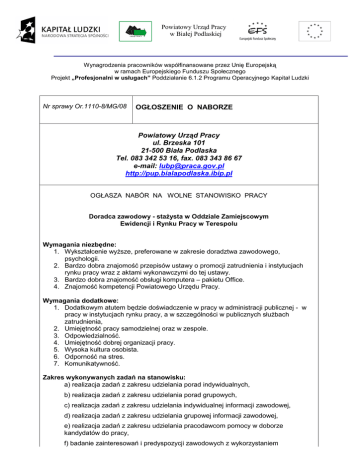 Powiatowy Urząd Pracy w Białej Podlaskiej Wynagrodzenia pracowników współfinansowane przez Unię Europejską w ramach Europejskiego Funduszu Społecznego Projekt „Profesjonalni w usługach” Poddziałanie 6.1.2 Programu Operacyjnego Kapitał Ludzki Nr sprawy Or.1110-8/MG/08 OGŁOSZENIE O NABORZE Powiatowy Urząd Pracy ul. Brzeska 101 21-500 Biała Podlaska Tel. 083 342 53 16, fax. 083 343 86 67 e-mail: [email protected] http://pup.bialapodlaska.ibip.pl OGŁASZA NABÓR NA WOLNE STANOWISKO PRACY Doradca zawodowy - staŜysta w Oddziale Zamiejscowym Ewidencji i Rynku Pracy w Terespolu Wymagania niezbędne: 1. Wykształcenie wyŜsze, preferowane w zakresie doradztwa zawodowego, psychologii. 2. Bardzo dobra znajomość przepisów ustawy o promocji zatrudnienia i instytucjach rynku pracy wraz z aktami wykonawczymi do tej ustawy. 3. Bardzo dobra znajomość obsługi komputera – pakietu Office. 4. Znajomość kompetencji Powiatowego Urzędu Pracy. Wymagania dodatkowe: 1. Dodatkowym atutem będzie doświadczenie w pracy w administracji publicznej - w pracy w instytucjach rynku pracy, a w szczególności w publicznych słuŜbach zatrudnienia, 2. Umiejętność pracy samodzielnej oraz w zespole. 3. Odpowiedzialność. 4. Umiejętność dobrej organizacji pracy. 5. Wysoka kultura osobista. 6. Odporność na stres. 7. Komunikatywność. Zakres wykonywanych zadań na stanowisku: a) realizacja zadań z zakresu udzielania porad indywidualnych, b) realizacja zadań z zakresu udzielania porad grupowych, c) realizacja zadań z zakresu udzielania indywidualnej informacji zawodowej, d) realizacja zadań z zakresu udzielania grupowej informacji zawodowej, e) realizacja zadań z zakresu udzielania pracodawcom pomocy w doborze kandydatów do pracy, f) badanie zainteresowań i predyspozycji zawodowych z wykorzystaniem standaryzowanych metod. Wymagane dokumenty: 1. CV z opisem przebiegu nauki i pracy zawodowej 2. List motywacyjny 3. Oryginał kwestionariusza osobowego (dostępny na stronie internetowej Powiatowego Urzędu Pracy w Białej Podlaskiej lub w siedzibie Urzędu pok. nr 10) 4. Kserokopie dokumentów potwierdzających posiadane wykształcenie, poświadczone przez kandydata za zgodność oryginałem. 5. Kserokopie dokumentów potwierdzających posiadanie niezbędnych kwalifikacji i uprawnień zawodowych, poświadczone za zgodność z oryginałem. 6. Kserokopie świadectw pracy dokumentujących wymagany staŜ pracy lub zaświadczenie o zatrudnieniu w przypadku pozostawania w stosunku pracy, poświadczone przez kandydata za zgodność z oryginałem. 7. Podpisane oświadczenie kandydata o pełnej zdolności do czynności prawnych, korzystaniu z pełni praw publicznych oraz niekaralności (dostępny na stronie internetowej Powiatowego Urzędu Pracy w Białej Podlaskiej lub w siedzibie Urzędu pok. nr 10) 8. Podpisane oświadczenie o wyraŜeniu zgody na przetwarzanie danych osobowych, zgodnie z ustawą z dnia 28 sierpnia 1997r. o ochronie danych osobowych. 9. Podpisane oświadczenie wyraŜeniu chęci udziału w projekcie „Profesjonalni w usługach”. Ofertę moŜe składać osoba: 1. Posiadająca pełną zdolność do czynności prawnych. 2. Niekarana za przestępstwa popełnione umyślnie. 3. Korzystająca z pełni praw publicznych. 4. Posiadająca obywatelstwo polskie. 5. Ciesząca się nieposzlakowaną opinią. 6. Posiadająca stan zdrowia pozwalający na zatrudnienie na określonym stanowisku. Wymagane dokumenty aplikacyjne naleŜy składać osobiście w siedzibie Powiatowego Urzędu Pracy lub drogą pocztową (list polecony) na adres: Powiatowy Urząd Pracy ul. Brzeska 101 21-500 Biała Podlaska z dopiskiem: Dotyczy naboru na stanowisko Doradca zawodowy – staŜysta w Oddziale Zamiejscowym Ewidencji i Rynku Pracy w Terespolu w terminie do dnia 17.12.2008r. Aplikacje, które wpłyną do Urzędu po upływie wskazanego terminu zostaną odrzucone. Informacja o wyniku naboru zostanie umieszczana na stronie internetowej Biuletynu Informacji Publicznej Powiatowego Urzędu Pracy w Białej Podlaskiej http://pup.bialapodlaska.ibip.pl oraz na tablicy informacyjnej w siedzibie Urzędu przy ul. Brzeskiej 101. Wymagane dokumenty aplikacyjne: list motywacyjny, szczegółowe CV, powinny być opatrzone klauzulą: „WyraŜam zgodę na przetwarzanie moich danych osobowych zawartych w ofercie pracy dla potrzeb niezbędnych do realizacji procesu rekrutacji zgodnie z ustawą z dnia 29.08.1997r. o ochronie danych osobowych (Dz.U. z 2002r. Nr 101, poz. 926 z późn. zm.) oraz ustawą z dnia 22.03.1990r. o pracownikach samorządowych (Dz.U. z 2001r. Nr 142, poz. 1593 z późn. zm.).” ………………………………………… Podpis Dyrektora PUP mgr inŜ. Edward Tymoszyński Dyrektor Powiatowego Urzędu Pracy w Białej Podlaskiej Powiatowy Urząd Pracy w Białej Podlaskiej Wynagrodzenia pracowników współfinansowane przez Unię Europejską w ramach Europejskiego Funduszu Społecznego Projekt „Profesjonalni w usługach” Poddziałanie 6.1.2 Programu Operacyjnego Kapitał Ludzki KWESTIONARIUSZ OSOBOWY DLA OSOBY UBIEGAJĄCEJ SIĘ O ZATRUDNIENIE 1. 2. 3. 4. 5. Imię (imiona) i nazwisko …………………………………………….. Imiona rodziców …………………………………………….. Data i miejsce urodzenia ……………………………………………. Obywatelstwo …………………………………………….. Miejsce zamieszkania (adres do korespondencji) ……………………. ………………………………………………………………………… ………………………………………………………………………… 6. Wykształcenie ………………………………………………………… (nazwa szkoły i rok jej ukończenia) ………………………………………………………………………… ………………………………………………………………………… (zawód, specjalność, stopie