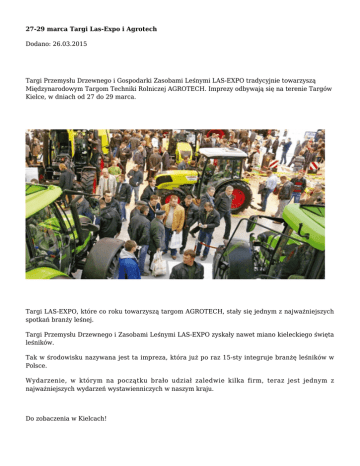 27-29 marca Targi Las-Expo i Agrotech Dodano: 26.03.2015 Targi Przemysłu Drzewnego i Gospodarki Zasobami Leśnymi LAS-EXPO tradycyjnie towarzyszą Międzynarodowym Targom Techniki Rolniczej AGROTECH. Imprezy odbywają się na terenie Targów Kielce, w dniach od 27 do 29 marca. Targi LAS-EXPO, które co roku towarzyszą targom AGROTECH, stały się jednym z najważniejszych spotkań branży leśnej. Targi Przemysłu Drzewnego i Zasobami Leśnymi LAS-EXPO zyskały nawet miano kieleckiego święta leśników. Tak w środowisku nazywana jest ta impreza, która już po raz 15-sty integruje branżę leśników w Polsce. Wydarzenie, w którym na początku brało udział zaledwie kilka firm, teraz jest jednym z najważniejszych wydarzeń wystawienniczych w naszym kraju. Do zobaczenia w Kielcach! Komentarze (0) Nie dodano jeszcze żadnego komentarza.