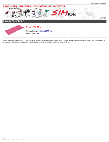 Informacje o produkcie Utworzono 08-03-2017 Śpiwór "Bedtime" Cena : 78,96 zł Nr katalogowy : S6-0603515 Producent : S6 Śpiwór "Bedtime" (190 x 75 cm), dzięki suwakowi wokół używany także jako kołdra (190 x 155 cm), wysoki komfort spania, w torbie w tym samym kolorze ze sznurkiem i plastikowym stoperem ? nadaje się do rekreacji na świeżym powietrzu, waga ok. 1 kg. Wygenerowano w programie www.oscGold.com