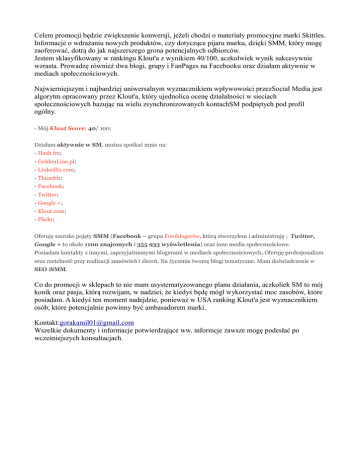 Celem promocji będzie zwiększenie konwersji, jeżeli chodzi o materiały promocyjne marki Skittles. Informacje o wdrażaniu nowych produktów, czy dotyczące pijaru marku, dzięki SMM, który mogę zaoferować, dotrą do jak najszerszego grona potencjalnych odbiorców. Jestem sklasyfikowany w rankingu Klout'a z wynikiem 40/100, aczkolwiek wynik sukcesywnie wzrasta. Prowadzę również dwa blogi, grupy i FanPages na Facebooku oraz działam aktywnie w mediach społecznościowych. Najwierniejszym i najbardziej uniwersalnym wyznacznikiem wpływowości przezSocial Media jest algorytm opracowany przez Klout'a, który ujednolica ocenę działalności w sieciach społecznościowych bazując na wielu zsynchronizowanych kontachSM podpiętych pod profil ogólny. - Mój Klout Score: 40/ 100; Działam aktywnie w SM, można spotkać mnie na: - Hash.fm; - GoldenLine.pl; - LinkedIn.com; - Thumblr; - Facebook; - Twitter; - Google +; - Klout.com; - Flickr; Oferuję szeroko pojęty SMM (Facebook – grupa Fotoblogerów, którą stworzyłem i administruję ; Twitter, Google + to około 1100 znajomych i 355 933 wyświetlenia) oraz inne media społecznościowe. Posiadam kontakty z innymi, zaprzyjaźnionymi blogerami w mediach społecznościowych,.Oferuję profesjonalizm oraz rzetelność przy realizacji zamówień i zleceń. Na życzenie tworzę blogi tematyczne. Mam doświadczenie w SEO iSMM. Co do promocji w sklepach to nie mam usystematyzowanego planu działania, aczkoliek SM to mój konik oraz pasja, którą rozwijam, w nadziei, że kiedyś będę mógł wykorzystać moc zasobów, które posiadam. A kiedyś ten moment nadejdzie, ponieważ w USA ranking Klout'a jest wyznacznikiem osób, które potencjalnie powinny być ambasadorem marki. Kontakt:[email protected] Wszelkie dokumenty i informacje potwierdzające ww. informcje zawsze mogę podesłać po wcześniejszych konsultacjach.