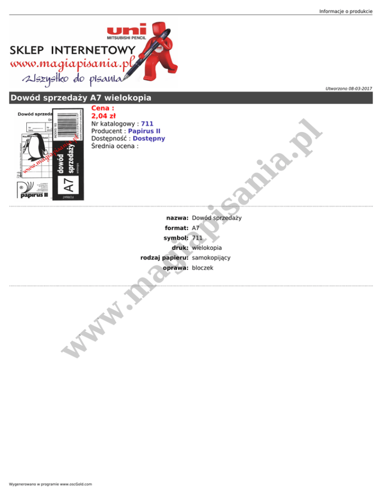 Informacje o produkcie Utworzono 08-03-2017 Dowód sprzedaży A7 wielokopia Cena : 2,04 zł sa n ia .p l Nr katalogowy : 711 Producent : Papirus II Dostępność : Dostępny Średnia ocena : pi nazwa: Dowód sprzedaży format: A7 ia symbol: 711 druk: wielokopia ag rodzaj papieru: samokopijący w w w .m oprawa: bloczek Wygenerowano w programie www.oscGold.com