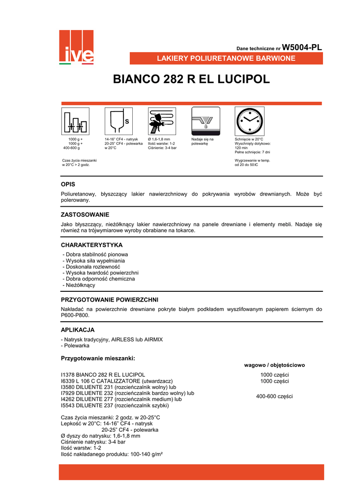 Dane techniczne nr W5004-PL LAKIERY POLIURETANOWE BARWIONE BIANCO 282 R EL LUCIPOL 1000 g + 1000 g + 400-600 g 14-16” CF4 - natrysk 20-25” CF4 - polewarka w 20°C Ø 1,6-1,8 mm Ilość warstw: 1-2 Ciśnienie: 3-4 bar Nadaje się na polewarkę Czas życia mieszanki w 20°C > 2 godz. Schnięcie w 20°C Wyschnięty dotykowo: 120 min Pełne schnięcie: 7 dni Wygrzewanie w temp. od 20 do 50°C OPIS Poliuretanowy, błyszczący lakier nawierzchniowy do pokrywania wyrobów drewnianych. Może być polerowany. ZASTOSOWANIE Jako błyszczący, nieżółknący lakier nawierzchniowy na panele drewniane i elementy mebli. Nadaje się również na trójwymiarowe wyroby obrabiane na tokarce. CHARAKTERYSTYKA - Dobra stabilność pionowa - Wysoka siła wypełniania - Doskonała rozlewność - Wysoka twardość powierzchni - Dobra odporność chemiczna - Nieżółknący PRZYGOTOWANIE POWIERZCHNI Nakładać na powierzchnie drewniane pokryte białym podkładem wyszlifowanym papierem ściernym do P600-P800. APLIKACJA - Natrysk tradycyjny, AIRLESS lub AIRMIX - Polewarka Przygotowanie mieszanki: wagowo / objętościowo I1378 BIANCO 282 R EL LUCIPOL I6339 L 106 C CATALIZZATORE (utwardzacz) I3580 DILUENTE 231 (rozcieńczalnik wolny) lub I7929 DILUENTE 232 (rozcieńczalnik bardzo wolny) lub I4262 DILUENTE 277 (rozcieńczalnik medium) lub I5543 DILUENTE 237 (rozcieńczalnik szybki) Czas życia mieszanki: 2 godz. w 20-25°C Lepkość w 20°C: 14-16” CF4 - natrysk 20-25” CF4 - polewarka Ø dyszy do natrysku: 1,6-1,8 mm Ciśnienie natrysku: 3-4 bar Ilość warstw: 1-2 Ilość nakładanego produktu: 100-140 g/m² 1000 części 1000 części 400-600 części CZAS SCHNIĘCIA Schnięcie przy 25°C i wilgotności względnej < 65%: Pyłosuchy: 60 min Wyschnięty dotykowo: 120 min Do składowania: 12 godz. Do polerowania: 48 godz. Pełne schnięcie: 7 dni Wygrzewanie: Można wygrzewać etapowo w temp. od 20°C do 50°C ZALECANY CYKL LAKIERNICZY Różnego rodzaju powierzchnie drewniane Szlifowanie papierem ściernym P100-P150-P180 Aplikacja białego podkładu Szlifowanie papierem ściernym P320-P400-P800 Aplikacja lakieru BIANCO 282 R EL LUCIPOL Polerowanie po upływie minimum 48 godz. DANE TECHNICZNE W5004-PL 09/2014 Produkt przeznaczony wyłącznie do użytku profesjonalnego, przez wykwalifikowany personel, posiadający niezbędną wiedzę na temat prawidłowego użytkowania produktu, zgodnie z danymi technicznymi i kartami bezpieczeństwa. Wszystkie zawarte informacje są wynikiem wiedzy, doświadczenia i przeprowadzonych testów, jakkolwiek nie ponosimy odpowiedzialności za skutki niewłaściwego stosowania produktu.