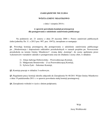 ZARZĄDZENIE NR 23.2014 WÓJTA GMINY MIASTKOWO z dnia 1 sierpnia 2014 r. w sprawie powołania komisji przetargowej dla postępowania o udzielenie zamówienia publicznego Na podstawie art. 21 ustawy z dnia 29 stycznia 2004 r. Prawo zamówień publicznych (tekst jednolity Dz. U. z 2013 poz. 907, poz. 1047)), zarządzam co następuje: §1. Powołuję komisję przetargową dla postępowania o udzielenie zamówienia publicznego pn. „Modernizacja i doposażenie oddziałów przedszkolnych w ramach projektu pn. Nowoczesne przedszkola na terenie Gminy Miastkowo”, zwaną dalej „komisją”, do oceny spełniania przez wykonawców warunków udziału w postępowaniu oraz do zbadania i oceny ofert, w składzie: 1) Alicja Jadwiga Dobrowolska – Przewodnicząca Komisji, 2) Małgorzata Struniewska – Z-ca Przewodniczącej Komisji, 3) Sylwia Zysk – Sekretarz Komisji, §2. Komisja pracuje w składzie 3-osobowym. §3. Regulamin pracy komisji określa załącznik do Zarządzenia Nr 48/2011 Wójta Gminy Miastkowo z dnia 19 października 2011 r. w sprawie powołania stałej komisji przetargowej. §4. Zarządzenie wchodzi w życie z dniem podpisania. Wójt Jerzy Wróblewski Załącznik Do Zarządzenia nr 48/2011 Wójta Gminy Miastkowo z dnia 19 października 2011 r. REGULAMIN PRACY KOMISJI PRZETARGOWEJ §1 1. Ilekroć w niniejszym Regulaminie jest mowa o: a) Komisji – należy przez to rozumieć komisję przetargową, b) Pzp – należy przez to rozumieć ustawę z dnia 29 stycznia 2004 r. Prawo zamówień publicznych (Dz. U. z 2010 r. Nr 113, poz. 759 z późn. zm.), c) Kierownika – należy przez to rozumieć Kierownika zamawiającego bądź osobę przez niego pisemnie upoważnioną, d) SIWZ – należy przez to rozumieć specyfikację istotnych warunków zamówienia. 2. Komisja wykonuje powierzone czynności zgodnie z przepisami Pzp, a w sprawach nieuregulowanych ustawą, w oparciu o przepisy ustawy Kodeks Cywilny. §2 1. Komisja rozpoczyna działalność z chwilą otwarcia ofert. 2. Po rozpoznaniu się z treścią SIWZ, Komisja przeprowadza postępowanie o udzielenie zamówienia publicznego, w zakresie: a) publicznego otwarcia ofert i sporządzenie odpowiedniego protokołu, b) oceny ofert pod względem formalnym i merytorycznym, c) przedstawienia Kierownikowi propozycji: wykluczenia z postępowania wykonawcy, odrzucenia oferty wykonawcy, wyboru najkorzystniejszej oferty, unieważnienia postępowania w całości lub części, d) sporządzenia i przedstawienia do zatwierdzenia Kierownikowi niezbędnej dokumentacji postępowania o udzielenie zamówienia publicznego, wymaganej przepisami Pzp. §3 1. Pracami Komisji kieruje Przewodniczący, a w przypadku jego nieobecności lub niemożności pełnienia tej funkcji – Z-ca Przewodniczącego. 2. Do zadań Przewodniczącego należy w szczególności: a) odbieranie oświadczeń, o których mowa w art. 17 ust. 2 Pzp, od członków Komisji oraz pozostałych osób (biegli) wykonujących czynności w postępowaniu o udzielenie zamówienia publicznego po stronie zamawiającego oraz informowanie Kierownika o ewentualnym wystąpieniu przesłanek, o których mowa w art. 17 ust. 1 Pzp, w stosunku do którejkolwiek z ww. osób, b) wyznaczanie terminów posiedzeń Komisji oraz ich prowadzenie, c) podział między członków Komisji prac podejmowanych w trybie roboczym, d) nadzorowanie prawidłowego prowadzenia dokumentacji danego postępowania o udzielenie zamówienia publicznego w zakresie powierzonym Komisji, e) informowanie na piśmie Kierownika o jakichkolwiek problemach związanych z pracami Komisji w toku postępowania o udzielenie danego zamówienia publicznego, f) inne czynności powierzone mu doraźnie, w formie pisemnej, przez Kierownika. 3. Dokumentację postępowania o udzielenie zamówienia publicznego prowadzi Sekretarz Komisji. 4. Do zadań Sekretarza Komisji należy w szczególności: a) prowadzenie dokumentacji danego postepowania o zamówienie publiczne w zakresie powierzonym Komisji, b) prowadzenie w sposób ciągły protokołu postępowania, włączanie wszelkiego typu oświadczeń do dokumentacji postepowania oraz dbałość o sprawną organizację postępowania o udzielenie zamówienia publicznego, c) udostępnianie na wniosek zainteresowanych osób jawnej części dokumentacji postepowań o zamówienia publiczne w oparciu o przepisy Pzp, d) zawiadamianie wykonawców o dokonanej w ich ofertach poprawie oczywistych omyłek pisarskich, oczywistych omyłek rachunkowych lub innych omyłek w trybie i na zasadach określonych w art. 87 oraz egzekwowanie od wykonawców pisemnej zgody na poprawienie tych omyłek. 5. Do zadań członka Komisji należy w szczególności a) wykonywanie wszystkich powierzonych czynności z należytą starannością oraz zachowaniem zasady bezstronności, b) dokonywanie oceny spełnienia warunków wymaganych od wykonawców, c) dokonywanie oceny ofert oraz najkorzystniejszej oferty, d) wykonywanie innych czynności niezbędnych w danym postępowaniu powierzonych do wykonania przez Przewodniczącego Komisji przetargowej. §4 1. Komisja składa się z minimum 3 osób. 2. Członkowie Komisji oraz pozostałe osoby biorące udział w postępowaniu, jak i przeprowadzeniu danego zamówienia publicznego po stronie zamawiającego, składają pisemne oświadczenie o zaistnieniu lub braku istnienia okoliczności, o których mowa w art.17 ust. 1 Pzp. Oświadczenie składane jest z chwilą powzięcia wiadomości o okolicznościach, o których mowa w art. 17 ust1 Pzp lecz najpóźniej z chwilą: a) upływu terminu składania ofert – w przetargu nieograniczonym i zapytaniu o cenę, z ogłoszeniem, dialogu konkurencyjnym i licytacji elektronicznej, b) po przystąpieniu do negocjacji wykonawców, którzy zostaną zaproszeni do negocjacji bez ogłoszenia lub zamówienia z wolnej ręki, - po powzięciu wiadomości o uczestnikach postepowania. 3. Osoby wchodzące w skład Komisji, obowiązane są w każdym czasie wyłączyć się z udziału 