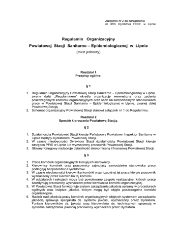 Załącznik nr 2 do zarządzenia nr 3/05 Dyrektora PSSE w Lipnie Regulamin Organizacyjny Powiatowej Stacji Sanitarno – Epidemiologicznej w Lipnie (tekst jednolity) Rozdział 1 Przepisy ogólne. §1 1. Regulamin Organizacyjny Powiatowej Stacji Sanitarno – Epidemiologicznej w Lipnie, zwany dalej „Regulaminem” określa organizację wewnętrzną oraz zadania poszczególnych komórek organizacyjnych oraz osób na samodzielnych stanowiskach pracy w Powiatowej Stacji Sanitarno – Epidemiologicznej w Lipnie, zwanej dalej Powiatową Stacją. 2. Schemat organizacyjny Powiatowej Stacji stanowi załącznik nr 1 do Regulaminu. Rozdział 2 Sposób kierowania Powiatową Stacją. §2 1. Działalnością Powiatowej Stacji kieruje Państwowy Powiatowy Inspektor Sanitarny w Lipnie będący Dyrektorem Powiatowej Stacji. 2. W czasie nieobecności Dyrektora Stacji działalnością Powiatowej Stacji kieruje zastępca PPIS w Lipnie lub wyznaczony pracownik Powiatowej Stacji. 3. Główny Księgowy nadzoruje działalność ekonomiczną i finansową Powiatowej Stacji. §3 1. Pracą komórek organizacyjnych kierują ich kierownicy. 2. Kierownicy komórek oraz pracownicy zajmujący samodzielne stanowiska pracy podlegają bezpośrednio Dyrektorowi. 3. W czasie nieobecności kierownika komórki organizacyjnej jej pracą kieruje pracownik wyznaczony przez kierownika tej komórki. 4. W oddziałach i sekcjach mogą być powoływane zespoły realizacyjne, których pracę koordynują pracownicy wyznaczeni przez kierownika komórki organizacyjnej. 5. W Powiatowej Stacji funkcjonuje system zarządzania jakością opisany w procedurach ogólnych oraz księdze jakości, którym mogą być objęte poszczególne komórki organizacyjne. 6. Nadzór nad jakością pracy komórek organizacyjnych objętych systemem zarządzania jakością sprawuje specjalista ds. systemu jakości, wyznaczony przez Dyrektora. Funkcje kierowników ds. jakości oraz kierowników ds. technicznych sprawują w systemie zarządzania jakością pracownicy wyznaczeni przez Dyrektora. 7. Dyrektor może powoływać do realizacji zadań bieżących i problemowych zespoły realizacyjne składające się z pracowników różnych komórek organizacyjnych i wyznaczyć koordynatora ich pracy. 8. Do realizacji szczególnie istotnych zagadnień problemowych Dyrektor może wyznaczyć swych pełnomocników lub koordynatorów. §4 1. Dyrektor wykonuje czynności pracodawcy wobec wszystkich pracowników Powiatowej Stacji. 2. W sprawach pracowniczych i socjalnych Dyrektor działa w porozumieniu z organizacjami związkowymi, w granicach określonych obowiązującymi przepisami. 3. Dyrektor organizuje i nadzoruje szkolenia pracowników Powiatowej Stacji. Rozdział 3 Organizacja wewnętrzna Powiatowej Stacji. §5 1. W skład Powiatowej Stacji wchodzą jako jej komórki organizacyjne następujące oddziały, sekcje, pracownie i samodzielne stanowiska pracy: 1) Oddział Zapobiegawczego i Bieżącego Nadzoru Sanitarnego, 2) Oddział Ekonomiczny i Administracyjny, 3) Stanowisko Pracy ds. Oświaty Zdrowotnej i Promocji Zdrowia, 4) Stanowisko Pracy Głównego Księgowego, 5) Stanowisko Pracy Radcy Prawnego. 2. Do wspólnych zadań komórek organizacyjnych oraz osób na samodzielnych stanowiskach pracy należy w szczególności: 1) planowanie zadań i sporządzanie okresowych sprawozdań z ich realizacji, 2) realizowanie zadań wytyczonych przez Głównego i Państwowego Wojewódzkiego Inspektora Sanitarnego, 3) rozpatrywanie oraz załatwianie skarg i wniosków, 4) prowadzenie ewidencji i zbioru przepisów prawnych związanych z działalnością komórki organizacyjnej oraz bieżąca analiza zmian obowiązującego prawa, 5) realizowanie wniosków pokontrolnych organów kontroli państwowej oraz wniosków wynikających z działalności kontrolnej Ministerstwa Zdrowia, Głównego Inspektoratu Sanitarnego i Państwowego Wojewódzkiego Inspektora Sanitarnego, 6) współdziałanie w drodze uzgodnień i konsultacji, opiniowanie, udostępnianie materiałów i danych oraz prowadzenie wspólnych prac nad określonymi zadaniami, 7) prowadzenie szkoleń wewnętrznych i udział pracowników komórki w szkoleniach zewnętrznych, 8) doskonalenie systemu zarządzania jakością. Rozdział 4 Zadania poszczególnych komórek organizacyjnych i osób na samodzielnych stanowiskach §6 1. Zadaniem Oddziału Zapobiegawczego i Bieżącego Nadzoru Sanitarnego jest prowadzenie nadzoru sanitarnego w celu ochrony zdrowia ludzkiego przed wpływem czynników szkodliwych i uciążliwych oraz zapobieganie powstawaniu chorób zakaźnych, zawodowych i powodowanych warunkami środowiska. Zapobiegawczy i bieżący nadzór sanitarny obejmuje w szczególności: 1) nadzór nad warunkami zdrowotnymi środowiska pracy w celu ochrony zdrowia ludzkiego przed wpływem czynników szkodliwych lub uciążliwych, a w szczególności w celu zapobiegania powstawaniu chorób zawodowych poprzez odpowiednią inspirację i koordynację działań Powiatowej Stacji, 2) prowadzenie postępowań wyjaśniających i przygotowywanie w I instancji projektów decyzji, dotyczących chorób zawodowych i naruszenia wymagań higienicznych oraz zdrowotnych w zakładach pracy, 3) prowadzenie dokumentacji i statystyki zachorowań na choroby zawodowe, 4) sporządzanie opracowań dotyczących oceny stanu higieniczno-sanitarnego zakładów pracy; 5) realizacja zagadnień problemowych w dziedzinie profilaktyki chorób zawodowych, 6) udzielanie porad, informacji i prowadzenie szkoleń w zakresie zapobiegania i eliminowania negatywnego wpływu czynników i zjawisk fizycznych, chemicznych oraz biologicznych na zdrowie pracowników, 7) kontrola aktualności zaświadczeń o zdolności do pracy zatrudnianych, 8) prowadzenie ewidencji zakładów pracy, w których wymagany jest nadzór nad warunkami środowiska pracy, 9) rejestrowanie i przetwarzanie danych dotyczących warunków pracy i zagrożeń związanych z chorobami zawodowymi, 10) ocena narażenia