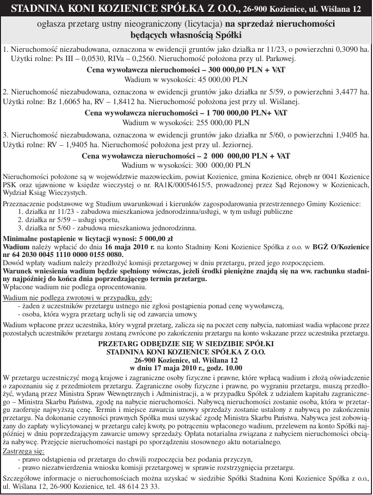 STADNINA KONI KOZIENICE SPÓŁKA Z O.O., 26-900 Kozienice, ul. Wiślana 12 ogłasza przetarg ustny nieograniczony (licytacja) na sprzedaż nieruchomości będących własnością Spółki 1. Nieruchomość niezabudowana, oznaczona w ewidencji gruntów jako działka nr 11/23, o powierzchni 0,3090 ha. Użytki rolne: Ps III – 0,0530, RIVa – 0,2560. Nieruchomość położona przy ul. Parkowej. Cena wywoławcza nieruchomości – 300 000,00 PLN + VAT Wadium w wysokości: 45 000,00 PLN 2. Nieruchomość niezabudowana, oznaczona w ewidencji gruntów jako działka nr 5/59, o powierzchni 3,4477 ha. Użytki rolne: Bz 1,6065 ha, RV – 1,8412 ha. Nieruchomość położona jest przy ul. Wiślanej. Cena wywoławcza nieruchomości – 1 700 000,00 PLN+ VAT Wadium w wysokości: 255 000,00 PLN 3. Nieruchomość niezabudowana, oznaczona w ewidencji gruntów jako działka nr 5/60, o powierzchni 1,9405 ha. Użytki rolne: RV – 1,9405 ha. Nieruchomość położona jest przy ul. Jeziornej. Cena wywoławcza nieruchomości – 2 000 000,00 PLN + VAT Wadium w wysokości: 300 000,00 PLN Nieruchomości położone są w województwie mazowieckim, powiat Kozienice, gmina Kozienice, obręb nr 0041 Kozienice PSK oraz ujawnione w księdze wieczystej o nr. RA1K/00054615/5, prowadzonej przez Sąd Rejonowy w Kozienicach, Wydział Ksiąg Wieczystych. Przeznaczenie podstawowe wg Studium uwarunkowań i kierunków zagospodarowania przestrzennego Gminy Kozienice: 1. działka nr 11/23 - zabudowa mieszkaniowa jednorodzinna/usługi, w tym usługi publiczne 2. działka nr 5/59 – usługi sportu, 3. działka nr 5/60 - zabudowa mieszkaniowa jednorodzinna. Minimalne postąpienie w licytacji wynosi: 5 000,00 zł Wadium należy wpłacić do dnia 16 maja 2010 r. na konto Stadniny Koni Kozienice Spółka z o.o. w BGŻ O/Kozienice nr 64 2030 0045 1110 0000 0155 0080. Dowód wpłaty wadium należy przedłożyć komisji przetargowej w dniu przetargu, przed jego rozpoczęciem. Warunek wniesienia wadium będzie spełniony wówczas, jeżeli środki pieniężne znajdą się na ww. rachunku stadniny najpóźniej do końca dnia poprzedzającego termin przetargu. Wpłacone wadium nie podlega oprocentowaniu. Wadium nie podlega zwrotowi w przypadku, gdy: - żaden z uczestników przetargu ustnego nie zgłosi postąpienia ponad cenę wywoławczą, - osoba, która wygra przetarg uchyli się od zawarcia umowy. Wadium wpłacone przez uczestnika, który wygrał przetarg, zalicza się na poczet ceny nabycia, natomiast wadia wpłacone przez pozostałych uczestników przetargu zostaną zwrócone po zakończeniu przetargu na konto wskazane przez uczestnika przetargu. PRZETARG ODBĘDZIE SIĘ W SIEDZIBIE SPÓŁKI STADNINA KONI KOZIENICE SPÓŁKA Z O.O. 26-900 Kozienice, ul. Wiślana 12 w dniu 17 maja 2010 r., godz. 10.00 W przetargu uczestniczyć mogą krajowe i zagraniczne osoby fizyczne i prawne, które wpłacą wadium i złożą oświadczenie o zapoznaniu się z przedmiotem przetargu. Zagraniczne osoby fizyczne i prawne, po wygraniu przetargu, muszą przedłożyć, wydaną przez Ministra Spraw Wewnętrznych i Administracji, a w przypadku Spółek z udziałem kapitału zagranicznego – Ministra Skarbu Państwa, zgodę na nabycie nieruchomości. Nabywcą nieruchomości zostanie osoba, która w przetargu zaoferuje najwyższą cenę. Termin i miejsce zawarcia umowy sprzedaży zostanie ustalony z nabywcą po zakończeniu przetargu. Na dokonanie czynności prawnych Spółka musi uzyskać zgodę Ministra Skarbu Państwa. Nabywca jest zobowiązany do zapłaty wylicytowanej w przetargu całej kwoty, po potrąceniu wpłaconego wadium, przelewem na konto Spółki najpóźniej w dniu poprzedzającym zawarcie umowy sprzedaży. Opłata notarialna związana z nabyciem nieruchomości obciąża nabywcę. Przejęcie nieruchomości nastąpi po sporządzeniu stosownego aktu notarialnego. Zastrzega się: - prawo odstąpienia od przetargu do chwili rozpoczęcia bez podania przyczyn, - prawo niezatwierdzenia wniosku komisji przetargowej w sprawie rozstrzygnięcia przetargu. Szczegółowe informacje o nieruchomościach można uzyskać w siedzibie Spółki Stadnina Koni Kozienice Spółka z o.o., ul. Wiślana 12, 26-900 Kozienice, tel. 48 614 23 33.