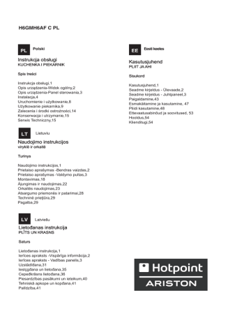 H6GMH6AF C PL PL Polski Instrukcja obsługi KUCHENKA I PIEKARNIK Spis treści Instrukcja obsługi,1 Opis urządzenia-Widok ogólny,2 Opis urządzenia-Panel sterowania,3 Instalacja,4 Uruchomienie i użytkowanie,8 Użytkowanie piekarnika,9 Zalecenia i środki ostrożności,14 Konserwacja i utrzymanie,15 Serwis Techniczny,15 LT Lietuviu Naudojimo instrukcijos viryklë ir orkaitë Turinys Naudojimo instrukcijos,1 Prietaiso aprašymas -Bendras vaizdas,2 Prietaiso aprašymas -Valdymo pultas,3 Montavimas,18 Ájungimas ir naudojimas,22 Orkaitës naudojimas,23 Atsargumo priemonës ir patarimai,28 Techninë prieţiűra,29 Pagalba,29 LV Latviešu Lietođanas instrukcija PLÎTS UN KRASNS Saturs Lietođanas instrukcija,1 Ierîces apraksts -Vispârîga informâcija,2 Ierîces apraksts - Vadîbas panelis,3 Uzstâdîđana,31 Ieslçgđana un lietođana,35 Cepeđkrâsns lietođana,36 Piesardzîbas pasâkumi un ieteikum,40 Tehniskâ apkope un kopđana,41 Palîdzîba,41 EE Eesti keeles Kasutusjuhend PLIIT JA AHI Sisukord Kasutusjuhend,1 Seadme kirjeldus - Ülevaade,2 Seadme kirjeldus - Juhtpaneel,3 Paigaldamine,43 Esmakäitamine ja kasutamine, 47 Pliidi kasutamine,48 Ettevaatusabinőud ja soovitused, 53 Hooldus,54 Klienditugi,54 14 1 2 7 8 9 10 11 12 13 6 3 4 5 6 PL Opis urządzenia Widok ogólny 1.Palnik gazowy 2. Ruszta płyty podpalnikowej 3.Panel kontrolny 4.Półka ruszt 5.Półka brytfanna 6.Nóżki regulowane 7. Płyta podpalnikowa 8.Prowadnice półek 9.pozycja 5 10.pozycja 4 11.pozycja 3 12.pozycja 2 13.pozycja 1 14.Szklana pokrywa LT Prietaiso aprađymas Bendras vaizdas 1. Dujų degiklis 2.Kaitlentès tinklelis 3.Valdymo pultas 4.KEPSNINÈ 5.SURINKIMO INDAS 6. Reguliuojamoji kojelè 7.TIškalų sulaikymo paviršius 8.Slankiųjų grotelių TAKELIAI 9.padètis 5 10.padètis 4 11.padètis 3 12.padètis 2 13.padètis 1 14.Stiklinis gaubtas 2 LV Ierîces apraksts Vispariga informacija 1.Gćzes deglis 2.Plīts virsmas režģisģ 3.Vadības panelis 4.GRILĒŠANA 5.CEPE TAUKU PANNA 6. Regulējama kāja 7.Norobe˛ota virsma traipiem 8.VADOTNES slīdošo pamatņu ievietošanai un izņemšanai 9.pozīcija 5 10.pozīcija 4 11.pozīcija 3 12.pozīcija 2 13.pozīcija 1 14.Stikla pārsegs EE Seadme kirjeldus Ülevaade 1.Gaasipõleti 2.Rest 3.Juhtpaneel 4.GRILL 5.TILGAPANN 6. Reguleerimisjalg 7.Tilgaalus 8.SIINID restide sisestamiseks 9.tasand 5 10.tasand 4 11.tasand 3 12.tasand 2 13. tasand 1 14.Klaaskate GB 7 6 1 4 22 7 3 2 8 PL Opis urządzenia Panel kontrolny 1.Programator elektroniczny 2.Przycisk MINUTNIKA 3.Przycisk CZASU PIECZENIA 4.Przycisk KOŃCA CZASU PIECZENIA 5.Pokrętło TERMOSTATU 6.Pokrętło PROGRAMÓW PIEKARNIKA 7.Lampka kontrolna TERMOSTATU 8.Pokrętło PALNIKÓW PŁYTY GRZEJNEJ LT LV Prietaiso aprađymas Valdymo pultas 1.Elektroninč virimo programa 2.LAIKMAČIO mygtukas 3.VIRIMO LAIKO mygtukas 4.VIRIMO PABAIGOS LAIKO mygtukas 5.TERMOSTATO rankenčlč 6.PARINKIMO rankenčlč 7.Indikacinč TERMOSTATO lemputč 8.Kaitlentčs dujř degikilř valdymo rankenčlčs Ierîces apraksts Vispariga informacija 1.ELEKTRONISKAIS GATAVOŠANAS PROGRAMMĒTĀJS 2.TAIMERA poga 3.GATAVOŠANAS LAIKA poga 4.GATAVOŠANAS BEIGU LAIKA poga 5.TERMOSTATA slēdzis 6.TERMOSTATA indikatora gaisma 7.SELEKTORA slēdzis 8.DEGĻA vadības slēdzi EE Seadme kirjeldus Juhtpaneel 1.Elektrooniline küpsetusprogrammeerija 2.TAIMERI nupp 3.KÜPSETUSAJA nupp 4.KÜPSETUSE LÕPUAJA nupp 5.TERMOSTAADI nupp 6.VALIKUlüliti 7.TERMOSTAADI näidikutuli 8.PÕLETITE reguleernupp 3 Instalacja pomieszczenie sàsiednie ! Przed przystàpieniem do u˝ytkowania urzàdzenia, nale˝y starannie zapoznaç si´ z podr´cznikiem u˝ytkownika. Zawiera on wa˝ne zalecenia dotyczàce bezpieczeƒstwa instalacji, obs∏ugi oraz konserwacji kuchenki. Podr´cznik nale˝y zachowaç do póêniejszego u˝ytku. PL ! Instrukcj´ nale˝y zachowaç na przysz∏oÊç. Instrukcja musi byç do∏àczona do urzàdzenia w przypadku sprzeda˝y, przekazywania innym osobom lub przeprowadzki. ! Poni˝sze instrukcje przeznaczone sà dla wykwalifikowanego specjalisty instalujàcego urzàdzenie. Instrukcje te majà na celu zapewnienie mo˝liwie najbardziej profesjonalnego i doÊwiadczonego wykonania czynnoÊci zwiàzanych z instalacjà i konserwacjà urzàdzenia. ! Wszelkie prace regulacyjne lub konserwacyjne nale˝y przeprowadzaç po od∏àczeniu kuchenki od zasilania. Wentylacja pomieszczenia Wymagania dla pomieszczeƒ kuchennych Przed przystàpieniem do instalowania kuchni gazowej w pomieszczeniu kuchennym itp., nale˝y upewniç si´, czy spe∏nia ono stawiane mu wymagania. Podstawa prawna, w oparciu, o którà oceniamy przydatnoÊç pomieszczenia do zainstalowania w nim kuchni gazowej, jest Rozporzàdzenie Ministra Gospodarki Przestrzennej i Budownictwa z dnia 14 grudnia 1994 r. w sprawie warunków technicznych, jakim powinny odpowiadaç budynki i ich usytuowanie, b´dàce aktem wykonawczym do Prawa budowlanego (Dz.U. nr 75 z dnia 16-12-2002 poz. 690). Wa˝ne: niniejsze urzàdzenie mo˝e byç instalowane i wykorzystywane wy∏àcznie w pomieszczeniach z trwa∏à wentylacjà, zgodnie z obowiàzujàcymi przepisami Pomieszczenie powinno umo˝liwiaç dop∏yw powietrza, które niezb´dne jest do w∏aÊciwego spalania gazu. Dop∏yw powietrza powinien byç nie mniejszy ni˝ 2 m3/h na jeden kW mocy palników. Powietrze mo˝e byç dostarczane w wyniku bezpoÊredniego przep∏ywu z zewnàtrz przez kana∏ o przekroju, co najmniej 100 cm2, którego konstrukcja musi uniemo˝liwiaç przypadkowe zablokowanie (Rysunek A). Otwór ten nale˝y powi´kszyç o 100%, je˝eli instalacja kominowa nie zosta∏a wyposa˝ona w urzàdzenie bezpieczeƒstwa, wykrywajàce ogieƒ. Ewentualnie dop∏yw powietrza mo˝e odbywaç si´ poÊrednio z sàsiednich pomieszczeƒ, które wyposa˝one sà w kana∏y wentylacyjne wychodzàce na zewnàtrz, spe∏niajàce wymagania dla kana∏ów opisane powy˝ej. Wszystko to przy za∏o˝eniu, ˝e sàsiednie pomieszczenia nie sà pomieszczeniami wspólnymi, sypialniam