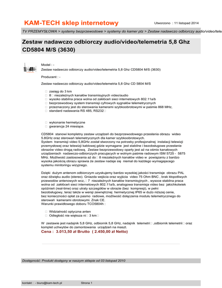 KAM-TECH sklep internetowy Utworzono : 11 listopad 2014 TV PRZEMYSŁOWA > systemy bezprzewodowe > systemy do kamer ptz > Zestaw nadawczo odbiorczy audio/video/telem Zestaw nadawczo odbiorczy audio/video/telemetria 5,8 Ghz CD5804 M/S (3630) Model : Zestaw nadawczo odbiorczy audio/video/telemetria 5,8 Ghz CD5804 M/S (3630) Producent : Zestaw nadawczo odbiorczy audio/video/telemetria 5,8 Ghz CD 5804 M/S � zasięg do 3 km � 8�niezależnych kanałów transmisyjnych video/audio � wysoko stabilna praca wolna od zakłóceń sieci internetowych 802.11a/b � bezprzewodowy system transmisji cyfrowych sygnałów telemetrycznych � przeznaczony jest do sterowania kamerami szybkoobrotowymi w paśmie 868 MHz, � standard nadawania RS 485, RS232� � wykonanie hermetyczne � gwarancja 24 miesiące. CD5804 stanowi kompletny zestaw urządzeń do bezprzewodowego przesłania obrazu wideo 5.8GHz oraz sterowań telemetrycznych dla kamer szybkoobrotowych. System transmisji video 5,8GHz został stworzony na potrzeby profesjonalnej instalacji telewizji przemysłowej oraz telewizji kablowej gdzie wymagane jest stabilne i bezobsługowe przesłanie obrazów video drogą radiową. Zestaw bezprzewodowy oparty jest aż na ośmio kanałowych urządzeniach nadawczo-odbiorczych pracujacych w wolnym paśmie radiowym ISM 5725 - 5875 MHz. Możliwość zastosowania aż do�8 niezależnych kanałów video w powiązaniu z bardzo wysoka jakością obrazu sprawia że zestaw nadaje się niemal do każdego wymagajacego systemu minitoringu wizyjnego. Dzięki dużym antenom odbiorczym uzyskujemy bardzo wysokiej jakości transmisje obrazu PAL oraz dźwięku audio (stereo). Gniazda wejścia oraz wyjścia video 75 Ohm BNC , brak kłopotliwych przewodów antenowych wcz,�7 niezależnych kanałów transmisyjnych , wysoce stabilna praca wolna od zakłóceń sieci internetowych 802.11a/b, analogowa transmisja video bez jakichkolwiek opóźnień (real-time) oraz utraty szczegółów w obrazie (bez kompresji), w pełni bezobsługowy, teraz także w wersji zewnętrznej hermetycznej IP65 w dużo niższej cenie, bez konieczności opłat za pasmo radiowe, możliwość dołączenia modułu telemetrycznego do sterowań kamerami obrotowymi. Znak CE. Warunki prawidłowego doboru TCO5804h : � Widzialność optyczna anten � Odległość nie większa ni�3 km� W zestawie jest nadajnik 5,8 GHz, odbiornik 5,8 GHz, nadajnik telemetri�,odbiornik telemetrii�oraz komplet uchwytów do zamontowania urządzeń na maszt. Cena : 3.013,50 zł Brutto ( 2.450,00 zł Netto) Dostępność: Produkt dostępny w naszym sklepie od 03 listopad 2010 kontakt : - [email protected] Strona 1