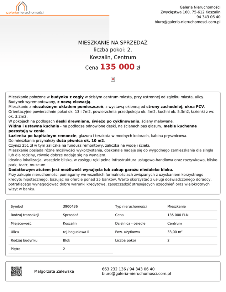 Galeria Nieruchomości Zwycięstwa 160, 75-612 Koszalin 94 343 06 40 [email protected] MIESZKANIE NA SPRZEDAŻ liczba pokoi: 2, Koszalin, Centrum Cena 135 000 zł Mieszkanie położone w budynku z cegły w ścisłym centrum miasta, przy ustronnej od zgiełku miasta, ulicy. Budynek wyremontowany, z nową elewacją. Mieszkanie z niezależnym układem pomieszczeń, z wystawą okienną od strony zachodniej, okna PCV. Orientacyjne powierzchnie pokoi ok. 13 i 7m2, powierzchnia przedpokoju ok. 4m2, kuchni ok. 5.3m2, łazienki z wc ok. 3.2m2. W pokojach na podłogach deski drewniane, świeżo po cyklinowaniu, ściany malowane. Widna i ustawna kuchnia - na podłodze odnowione deski, na ścianach pas glazury, meble kuchenne pozostają w cenie. Łazienka po kapitalnym remoncie, glazura i terakota w modnych kolorach, kabina prysznicowa. Do mieszkania przynależy duża piwnica ok. 10 m2. Czynsz 251 zł w tym zaliczka na fundusz remontowy, zaliczka na wodę i ścieki. Mieszkanie posiada różne możliwości wykorzystania, doskonale nadaje się do wygodnego zamieszkania dla singla lub dla rodziny, równie dobrze nadaje się na wynajem. Idealna lokalizacja, wszędzie blisko, w zasięgu ręki pełna infrastruktura usługowo-handlowa oraz rozrywkowa, blisko park, teatr, muzeum. Dodatkowym atutem jest możliwość wynajęcia lub zakup garażu niedaleko bloku. Przy zakupie nieruchomości pomagamy we wszelkich formalnościach związanych z uzyskaniem korzystnego kredytu hipotecznego, bazując na ofercie ponad 25 banków. Warto skorzystać z usługi doświadczonego doradcy, potrafiącego wynegocjować dobre warunki kredytowe, zaoszczędzić stresujących uzgodnień oraz wielokrotnych wizyt w banku. Symbol 3900436 Typ nieruchomości Mieszkanie Rodzaj transakcji Sprzedaż Cena 135 000 PLN Miejscowość Koszalin Dzielnica - osiedle Centrum Ulica rej.bogusława Ii Pow. użytkowa 33,00 m2 Rodzaj budynku Blok Liczba pokoi 2 Piętro 2 Małgorzata Zalewska 663 232 136 / 94 343 06 40 [email protected] Galeria Nieruchomości Zwycięstwa 160, 75-612 Koszalin 94 343 06 40 [email protected] Więcej ofert na stronie www.galeria-nieruchomosci.com.pl
