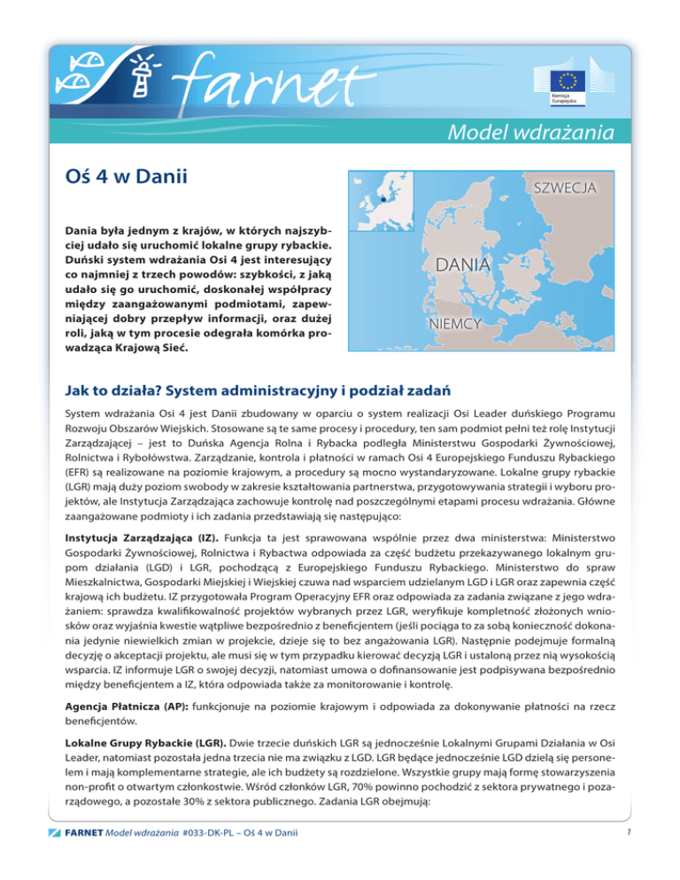 Model wdrażania Oś 4 w Danii Dania była jednym z krajów, w których najszybciej udało się uruchomić lokalne grupy rybackie. Duński system wdrażania Osi 4 jest interesujący co najmniej z trzech powodów: szybkości, z jaką udało się go uruchomić, doskonałej współpracy między zaangażowanymi podmiotami, zapewniającej dobry przepływ informacji, oraz dużej roli, jaką w tym procesie odegrała komórka prowadząca Krajową Sieć. Szwecja Dania Niemcy Jak to działa? System administracyjny i podział zadań System wdrażania Osi 4 jest Danii zbudowany w oparciu o system realizacji Osi Leader duńskiego Programu Rozwoju Obszarów Wiejskich. Stosowane są te same procesy i procedury, ten sam podmiot pełni też rolę Instytucji Zarządzającej – jest to Duńska Agencja Rolna i Rybacka podległa Ministerstwu Gospodarki Żywnościowej, Rolnictwa i Rybołówstwa. Zarządzanie, kontrola i płatności w ramach Osi 4 Europejskiego Funduszu Rybackiego (EFR) są realizowane na poziomie krajowym, a procedury są mocno wystandaryzowane. Lokalne grupy rybackie (LGR) mają duży poziom swobody w zakresie kształtowania partnerstwa, przygotowywania strategii i wyboru projektów, ale Instytucja Zarządzająca zachowuje kontrolę nad poszczególnymi etapami procesu wdrażania. Główne zaangażowane podmioty i ich zadania przedstawiają się następująco: Instytucja Zarządzająca (IZ). Funkcja ta jest sprawowana wspólnie przez dwa ministerstwa: Ministerstwo Gospodarki Żywnościowej, Rolnictwa i Rybactwa odpowiada za część budżetu przekazywanego lokalnym grupom działania (LGD) i LGR, pochodzącą z Europejskiego Funduszu Rybackiego. Ministerstwo do spraw Mieszkalnictwa, Gospodarki Miejskiej i Wiejskiej czuwa nad wsparciem udzielanym LGD i LGR oraz zapewnia część krajową ich budżetu. IZ przygotowała Program Operacyjny EFR oraz odpowiada za zadania związane z jego wdrażaniem: sprawdza kwalifikowalność projektów wybranych przez LGR, weryfikuje kompletność złożonych wniosków oraz wyjaśnia kwestie wątpliwe bezpośrednio z beneficjentem (jeśli pociąga to za sobą konieczność dokonania jedynie niewielkich zmian w projekcie, dzieje się to bez angażowania LGR). Następnie podejmuje formalną decyzję o akceptacji projektu, ale musi się w tym przypadku kierować decyzją LGR i ustaloną przez nią wysokością wsparcia. IZ informuje LGR o swojej decyzji, natomiast umowa o dofinansowanie jest podpisywana bezpośrednio między beneficjentem a IZ, która odpowiada także za monitorowanie i kontrolę. Agencja Płatnicza (AP): funkcjonuje na poziomie krajowym i odpowiada za dokonywanie płatności na rzecz beneficjentów. Lokalne Grupy Rybackie (LGR). Dwie trzecie duńskich LGR są jednocześnie Lokalnymi Grupami Działania w Osi Leader, natomiast pozostała jedna trzecia nie ma związku z LGD. LGR będące jednocześnie LGD dzielą się personelem i mają komplementarne strategie, ale ich budżety są rozdzielone. Wszystkie grupy mają formę stowarzyszenia non-profit o otwartym członkostwie. Wśród członków LGR, 70% powinno pochodzić z sektora prywatnego i pozarządowego, a pozostałe 30% z sektora publicznego. Zadania LGR obejmują: FARNET Model wdrażania #033-DK-PL – Oś 4 w Danii 1 >> przygotowanie lokalnej strategii rozwoju dla swojego obszaru >> animowanie społeczności >> przyjmowanie wniosków (w trybie ciągłym przez cały okres trwania programu) >> ocena wniosków i wybór projektów spełniających kryteria zgodności ze strategią i kryteria wyboru, a także ustalanie wysokości przyznanego wsparcia (zarząd LGR spotyka się mniej więcej 4 razy w roku, aby wykonać te czynności) >> przedstawianie IZ sprawozdania z procesu wyboru projektów. Krajowa jednostka wspomagająca Sieć: zlokalizowana w Ministerstwie ds Mieszkalnictwa, Gospodarki Miejskiej i Wiejskiej, Krajowa Sieć odgrywa ważną rolę we wdrażaniu Osi 4. Pełni ona funkcję punktu kontaktowego dla wszystkich podmiotów zaangażowanych w Oś 4 i dla potencjalnych beneficjentów, opracowuje narzędzia informacyjne i przygotowuje wytyczne, a także zajmuje się szkoleniami dla LGR (a także LGD). Współdziała ściśle z IZ i zapewnia dobrą współpracę wszystkich interesariuszy. System wdrażania Osi 4 w Danii Instytucja Zarządzająca Jednostka wspomagająca Krajową Sieć Zapewnia wsparcie i ułatwia komunikację między wszystkimi zaangażowanym podmiotami (poziom krajowy) • Sprawdza kwalifikowalność i kompletność wniosków • Dokonuje formalnej akceptacji projektów • Komunikuje się bezpośrednio z beneficjentami Wysyła raport o wyborze projektów do IZ LGR • Podpisuje umowy o dofinansowanie z beneficjentami (przyjmuje wnioski na bieżąco ale ocenia je przeciętnie 4 razy w roku) - Agencja Płatnicza dokonuje płatności po zakończeniu realizacji projektów -‐ Przedstawiają pomysły na projekty -‐ Składają wnioski PROJECT PROJECT PROJECT PROJECT WNIOSKODAWCY PROMOTERS PROMOTERS PROMOTERS PROMOTERS -‐ Animowanie społeczności -‐ Wybór projektów i ustalenie wysokości wsparcia Proces składania, oceny i akceptacji wniosków trwa zwykle nie dłużej niż 3 miesiące, chociaż ze względu na niedawno przeprowadzoną reorganizację instytucji zarządzających oraz na opinie audytorów, w ostatnim czasie uległ wydłużeniu. Dokonanie płatności przez Agencję Płatniczą po zakończeniu projektu również zajmuje około 3 miesięcy. FARNET Model wdrażania #033-DK-PL – Oś 4 w Danii 2 Co działa dobrze? Opisany tu system wdrażania jest względnie prosty i angażuje niewielką liczbę podmiotów. Dzięki dobremu przepływowi informacji oraz wsparciu jednostki sieciującej, podmioty te zwykle wiedzą dokładnie, jakie są ich zadania, toteż system zdaje się funkcjonować bez większych problemów. Centralizacja funkcji administracyjnych spowodowała zmniejszenie (a nie zwiększenie!) biurokracji, jednocześnie odbyło się to z poszanowaniem podejści
