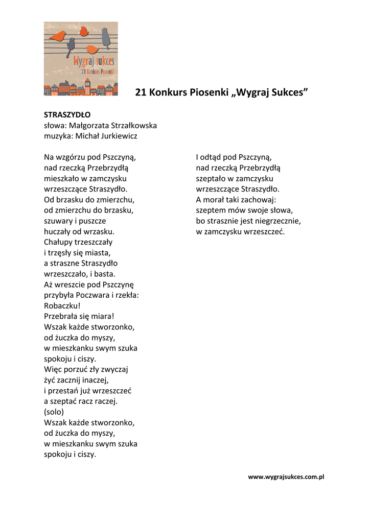 21 Konkurs Piosenki „Wygraj Sukces” STRASZYDŁO słowa: Małgorzata Strzałkowska muzyka: Michał Jurkiewicz Na wzgórzu pod Pszczyną, nad rzeczką Przebrzydłą mieszkało w zamczysku wrzeszczące Straszydło. Od brzasku do zmierzchu, od zmierzchu do brzasku, szuwary i puszcze huczały od wrzasku. Chałupy trzeszczały i trzęsły się miasta, a straszne Straszydło wrzeszczało, i basta. Aż wreszcie pod Pszczynę przybyła Poczwara i rzekła: Robaczku! Przebrała się miara! Wszak każde stworzonko, od żuczka do myszy, w mieszkanku swym szuka spokoju i ciszy. Więc porzuć zły zwyczaj żyć zacznij inaczej, i przestań już wrzeszczeć a szeptać racz raczej. (solo) Wszak każde stworzonko, od żuczka do myszy, w mieszkanku swym szuka spokoju i ciszy. I odtąd pod Pszczyną, nad rzeczką Przebrzydłą szeptało w zamczysku wrzeszczące Straszydło. A morał taki zachowaj: szeptem mów swoje słowa, bo strasznie jest niegrzecznie, w zamczysku wrzeszczeć. www.wygrajsukces.com.pl
