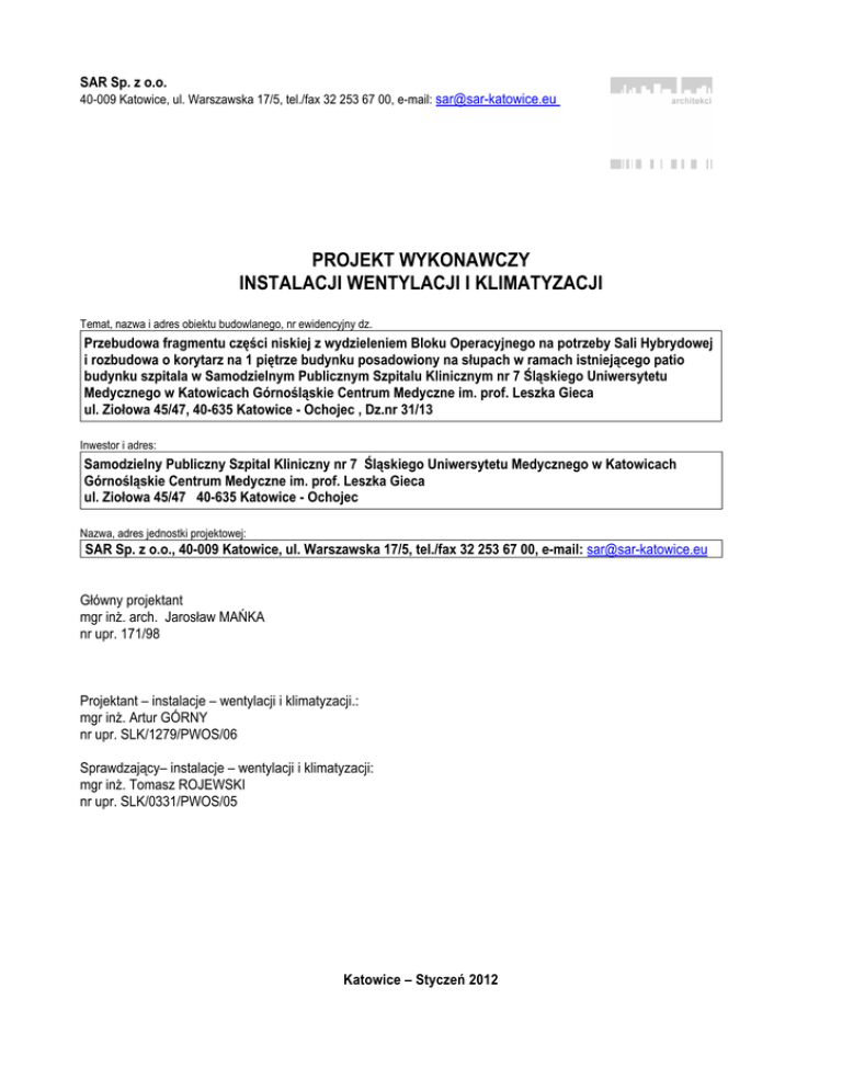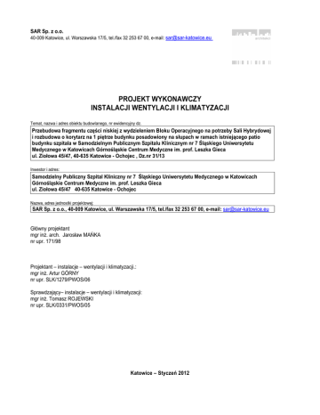 SAR Sp. z o.o. 40-009 Katowice, ul. Warszawska 17/5, tel./fax 32 253 67 00, e-mail: [email protected] PROJEKT WYKONAWCZY INSTALACJI WENTYLACJI I KLIMATYZACJI Temat, nazwa i adres obiektu budowlanego, nr ewidencyjny dz. Przebudowa fragmentu części niskiej z wydzieleniem Bloku Operacyjnego na potrzeby Sali Hybrydowej i rozbudowa o korytarz na 1 piętrze budynku posadowiony na słupach w ramach istniejącego patio budynku szpitala w Samodzielnym Publicznym Szpitalu Klinicznym nr 7 Śląskiego Uniwersytetu Medycznego w Katowicach Górnośląskie Centrum Medyczne im. prof. Leszka Gieca ul. Ziołowa 45/47, 40-635 Katowice - Ochojec , Dz.nr 31/13 Inwestor i adres: Samodzielny Publiczny Szpital Kliniczny nr 7 Śląskiego Uniwersytetu Medycznego w Katowicach Górnośląskie Centrum Medyczne im. prof. Leszka Gieca ul. Ziołowa 45/47 40-635 Katowice - Ochojec Nazwa, adres jednostki projektowej: SAR Sp. z o.o., 40-009 Katowice, ul. Warszawska 17/5, tel./fax 32 253 67 00, e-mail: [email protected] Główny projektant mgr inŜ. arch. Jarosław MAŃKA nr upr. 171/98 Projektant – instalacje – wentylacji i klimatyzacji.: mgr inŜ. Artur GÓRNY nr upr. SLK/1279/PWOS/06 Sprawdzający– instalacje – wentylacji i klimatyzacji: mgr inŜ. Tomasz ROJEWSKI nr upr. SLK/0331/PWOS/05 Katowice – Styczeń 2012 Przebudowa fragmentu części niskiej istniejącego budynku szpitala z wydzieleniem Bloku Operacyjnego na potrzeby Sali Hybrydowej w Samodzielnym Publicznym Szpitalu Klinicznym nr 7 Śląskiego Uniwersytetu Medycznego w Katowicach Górnośląskie Centrum Medyczne im. prof. Leszka Gieca ul. Ziołowa 45/47 40-635 Katowice - Ochojec , Dz.nr 31/13 SPIS TREŚCI 1. PRZEDMIOT I ZAKRES OPRACOWANIA ................................................................................... 4 2. ZAŁOśENIA DO PROJEKTU ....................................................................................................... 5 3. OPIS PROJEKTOWANYCH ROZWIĄZAŃ ................................................................................... 6 3.1. INSTALACJA NAWIEWNO-WYWIEWNA UKŁAD N2W2 .................................................................................. 7 3.2. WYWIEWNA UKŁAD W4 .......................................................................................................................... 8 3.3. INSTALACJA WYWIEWNA UKŁAD W5 ........................................................................................................ 8 4. WYKONANIE INSTALACJI .......................................................................................................... 9 4.1. PRZEWODY I KSZTAŁTKI ......................................................................................................................... 9 4.2. CZERPNIE I WYRZUTNIE POWIETRZA...................................................................................................... 10 5. GOSPODAROWANIE ENERGIĄ ................................................................................................ 10 6. TŁUMIENIE HAŁASU ................................................................................................................. 10 7. MONTAś, ROZRUCH I REGULACJA INSTALACJI .................................................................. 11 8. WYTYCZNE BRANśOWE........................................................................................................... 11 9. BEZPIECZEŃSTWO POśAROWE ............................................................................................. 12 10. UWAGI KOŃCOWE ................................................................................................................ 13 11. WYKAZ NORM I AKTÓW PRAWNYCH ................................................................................. 14 12. SPIS LITERATURY ................................................................................................................. 15 2 Przebudowa fragmentu części niskiej istniejącego budynku szpitala z wydzieleniem Bloku Operacyjnego na potrzeby Sali Hybrydowej w Samodzielnym Publicznym Szpitalu Klinicznym nr 7 Śląskiego Uniwersytetu Medycznego w Katowicach Górnośląskie Centrum Medyczne im. prof. Leszka Gieca ul. Ziołowa 45/47 40-635 Katowice - Ochojec , Dz.nr 31/13 ZAŁĄCZNIKI: 1. Zaświadczenie projektanta Artura Górnego o przynaleŜności do ŚOIB nr ewid. SLK/IS/4399/06 z dnia 14.09.2011r 2. Decyzja Okręgowej Komisja Kwalifikacyjnej odnośnie uprawnień budowlanych projektanta Artura Górnego nr SLK/OKK/7132/1278/05 z dnia 14.06.2006r 3. Zaświadczenie projektanta Tomasza Rojewskiego o przynaleŜności do ŚIOB nr ewid. SLK/IS/3632/05 z dnia 17.10.2011r 4. Decyzja Okręgowej Komisja Kwalifikacyjnej odnośnie uprawnień budowlanych projektanta Tomasza Rojewskiego nr SLK/OKK/7131.7132/0331/03 z dnia 16.06.2005r 5. Zestawienie materiałów SPIS RYSUNKÓW: Rys. W-01 Rzut piętra. Instalacja wentylacji - nawiew Rys. W-02 Rzut piętra. Instalacja wentylacji - wywiew Rys. W-03 Rzut poddasza. Instalacja wentylacji 3 Przebudowa fragmentu części niskiej istniejącego budynku szpitala z wydzieleniem Bloku Operacyjnego na potrzeby Sali Hybrydowej w Samodzielnym Publicznym Szpitalu Klinicznym nr 7 Śląskiego Uniwersytetu Medycznego w Katowicach Górnośląskie Centrum Medyczne im. prof. Leszka Gieca ul. Ziołowa 45/47 40-635 Katowice - Ochojec , Dz.nr 31/13 1. Przedmiot i zakres opracowania Przedmiotem opracowania jest projekt wykonawczy instalacji wentylacji mechanicznej dla Zakładu Kardiologii Inwazyjnej w Samodzielnym Publicznym Szpitalu Klinicznym nr 7 Śląskiego Uniwersytetu Medycznego w Katowicach Górnośląskiego Centrum Medycznego im. prof. Leszka Gieca w Katowicach przy ul. Ziołowej 45/47. Zakres SZPITAL. Inwestor: Samodzielny Publiczny Szpital Kliniczny nr 7 Śląskiego Uniwersytetu Medycznego w Katowicach Górnośląskie Centrum Medyczne im. prof. Leszka Gieca ul. Ziołowa 45/47 40-635 Katowice - Ochojec Podstawa opracowania: • Zlecenie i umowa, • P