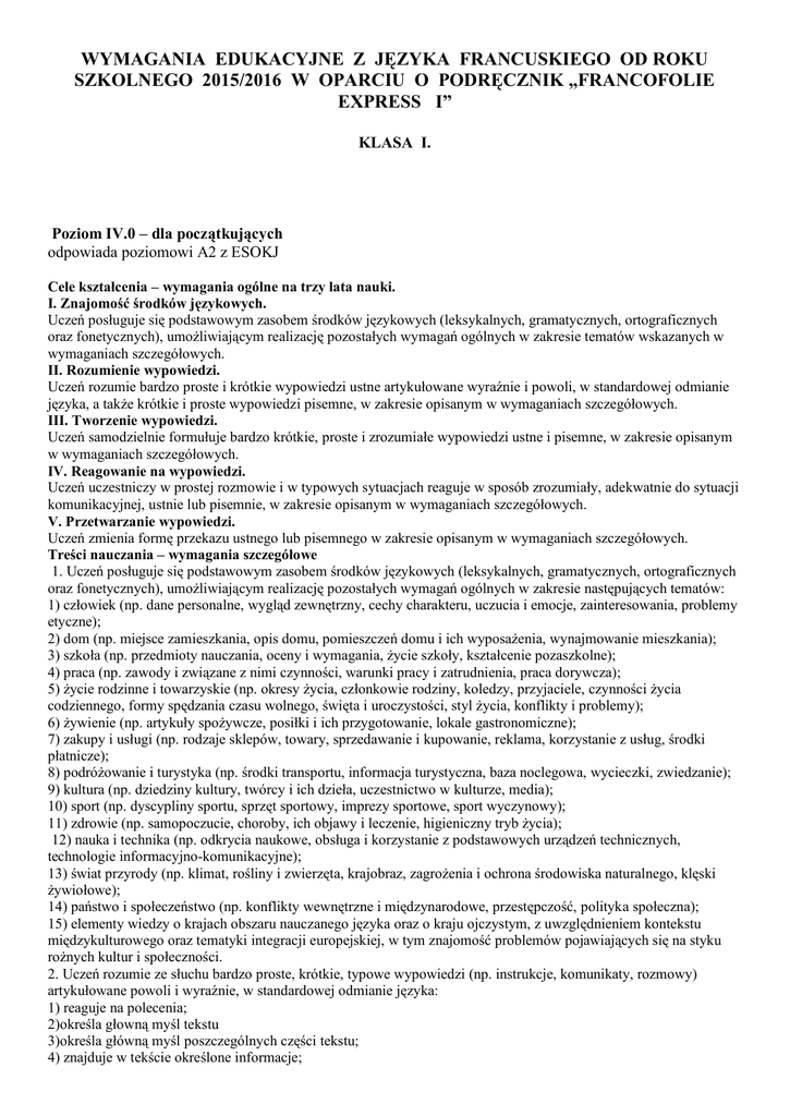 WYMAGANIA EDUKACYJNE Z JĘZYKA FRANCUSKIEGO OD ROKU SZKOLNEGO 2015/2016 W OPARCIU O PODRĘCZNIK „FRANCOFOLIE EXPRESS I” KLASA I. Poziom IV.0 – dla początkujących odpowiada poziomowi A2 z ESOKJ Cele kształcenia – wymagania ogólne na trzy lata nauki. I. Znajomość środków językowych. Uczeń posługuje się podstawowym zasobem środków językowych (leksykalnych, gramatycznych, ortograficznych oraz fonetycznych), umożliwiającym realizację pozostałych wymagań ogólnych w zakresie tematów wskazanych w wymaganiach szczegółowych. II. Rozumienie wypowiedzi. Uczeń rozumie bardzo proste i krótkie wypowiedzi ustne artykułowane wyraźnie i powoli, w standardowej odmianie języka, a także krótkie i proste wypowiedzi pisemne, w zakresie opisanym w wymaganiach szczegółowych. III. Tworzenie wypowiedzi. Uczeń samodzielnie formułuje bardzo krótkie, proste i zrozumiałe wypowiedzi ustne i pisemne, w zakresie opisanym w wymaganiach szczegółowych. IV. Reagowanie na wypowiedzi. Uczeń uczestniczy w prostej rozmowie i w typowych sytuacjach reaguje w sposób zrozumiały, adekwatnie do sytuacji komunikacyjnej, ustnie lub pisemnie, w zakresie opisanym w wymaganiach szczegółowych. V. Przetwarzanie wypowiedzi. Uczeń zmienia formę przekazu ustnego lub pisemnego w zakresie opisanym w wymaganiach szczegółowych. Treści nauczania – wymagania szczegółowe 1. Uczeń posługuje się podstawowym zasobem środków językowych (leksykalnych, gramatycznych, ortograficznych oraz fonetycznych), umożliwiającym realizację pozostałych wymagań ogólnych w zakresie następujących tematów: 1) człowiek (np. dane personalne, wygląd zewnętrzny, cechy charakteru, uczucia i emocje, zainteresowania, problemy etyczne); 2) dom (np. miejsce zamieszkania, opis domu, pomieszczeń domu i ich wyposażenia, wynajmowanie mieszkania); 3) szkoła (np. przedmioty nauczania, oceny i wymagania, życie szkoły, kształcenie pozaszkolne); 4) praca (np. zawody i związane z nimi czynności, warunki pracy i zatrudnienia, praca dorywcza); 5) życie rodzinne i towarzyskie (np. okresy życia, członkowie rodziny, koledzy, przyjaciele, czynności życia codziennego, formy spędzania czasu wolnego, święta i uroczystości, styl życia, konflikty i problemy); 6) żywienie (np. artykuły spożywcze, posiłki i ich przygotowanie, lokale gastronomiczne); 7) zakupy i usługi (np. rodzaje sklepów, towary, sprzedawanie i kupowanie, reklama, korzystanie z usług, środki płatnicze); 8) podróżowanie i turystyka (np. środki transportu, informacja turystyczna, baza noclegowa, wycieczki, zwiedzanie); 9) kultura (np. dziedziny kultury, twórcy i ich dzieła, uczestnictwo w kulturze, media); 10) sport (np. dyscypliny sportu, sprzęt sportowy, imprezy sportowe, sport wyczynowy); 11) zdrowie (np. samopoczucie, choroby, ich objawy i leczenie, higieniczny tryb życia); 12) nauka i technika (np. odkrycia naukowe, obsługa i korzystanie z podstawowych urządzeń technicznych, technologie informacyjno-komunikacyjne); 13) świat przyrody (np. klimat, rośliny i zwierzęta, krajobraz, zagrożenia i ochrona środowiska naturalnego, klęski żywiołowe); 14) państwo i społeczeństwo (np. konflikty wewnętrzne i międzynarodowe, przestępczość, polityka społeczna); 15) elementy wiedzy o krajach obszaru nauczanego języka oraz o kraju ojczystym, z uwzględnieniem kontekstu międzykulturowego oraz tematyki integracji europejskiej, w tym znajomość problemów pojawiających się na styku rożnych kultur i społeczności. 2. Uczeń rozumie ze słuchu bardzo proste, krótkie, typowe wypowiedzi (np. instrukcje, komunikaty, rozmowy) artykułowane powoli i wyraźnie, w standardowej odmianie języka: 1) reaguje na polecenia; 2)określa głowną myśl tekstu 3)określa główną myśl poszczególnych części tekstu; 4) znajduje w tekście określone informacje; 5) określa intencje nadawcy/autora tekstu; 6) określa kontekst wypowiedzi (np. czas, miejsce, sytuację, uczestników); 7) rozróżnia formalny i nieformalny styl wypowiedzi. 3. Uczeń rozumie krótkie, proste wypowiedzi pisemne (np. napisy informacyjne, listy, ulotki reklamowe, jadłospisy, ogłoszenia, rozkłady jazdy, proste teksty narracyjne): 1) określa główną myśl tekstu; 2) określa główną myśl poszczególnych części tekstu; 3) znajduje w tekście określone informacje; 4) określa intencje nadawcy/autora tekstu; 5) określa kontekst wypowiedzi (np. nadawcę, odbiorcę, formę tekstu); 6) rozróżnia formalny i nieformalny styl wypowiedzi. 4. Uczeń tworzy bardzo krótkie, proste i zrozumiałe wypowiedzi ustne: 1) opisuje ludzi, przedmioty, miejsca i czynności; 2) opowiada o wydarzeniach życia codziennego i komentuje je; 3) przedstawia fakty z przeszłości i teraźniejszości; 4) opisuje swoje upodobania i uczucia; 5) przedstawia opinie swoje i innych osób; 6) przedstawia intencje i plany na przyszłość. 5. Uczeń tworzy bardzo krótkie, proste i zrozumiałe wypowie dzi pisemne w formie prostych wyrażeń i zdań (np. wiadomość, e -mail, krotki opis, notatka, ogłoszenie, zaproszenie, ankieta, pocztówką, prosty list prywatny): 1) opisuje ludzi, przedmioty, miejsca i czynności; 2) opisuje wydarzenia życia codziennego i komentuje je; 3) przedstawia fakty z przeszłości i teraźniejszości; 4) opisuje swoje upodobania i uczucia; 5) przedstawia opinie swoje i innych osób; 6) opisuje intencje i plany na przyszłość. 6. Uczeń reaguje ustnie w prosty i zrozumiały sposób, w typowych sytuacjach: 1) nawiązuje kontakty towarzyskie (np. przedstawia siebie i inne osoby 2) rozpoczyna, prowadzi i kończy rozmowę; 3) stosuje formy grzecznościowe; 4) uzyskuje i przekazuje proste informacje i wyjaśnienia; 5) proponuje, przyjmuje i odrzuca propozycje i sugestie; 6) prosi o pozwolenie, udziela i odmawia pozwolenia; 7) wyraża swoje opinie i życzenia, pyta o opinie i życzenia innych; 8) wyraża swoje emocje (np. radość, niezadowolenie, zdziwienie);