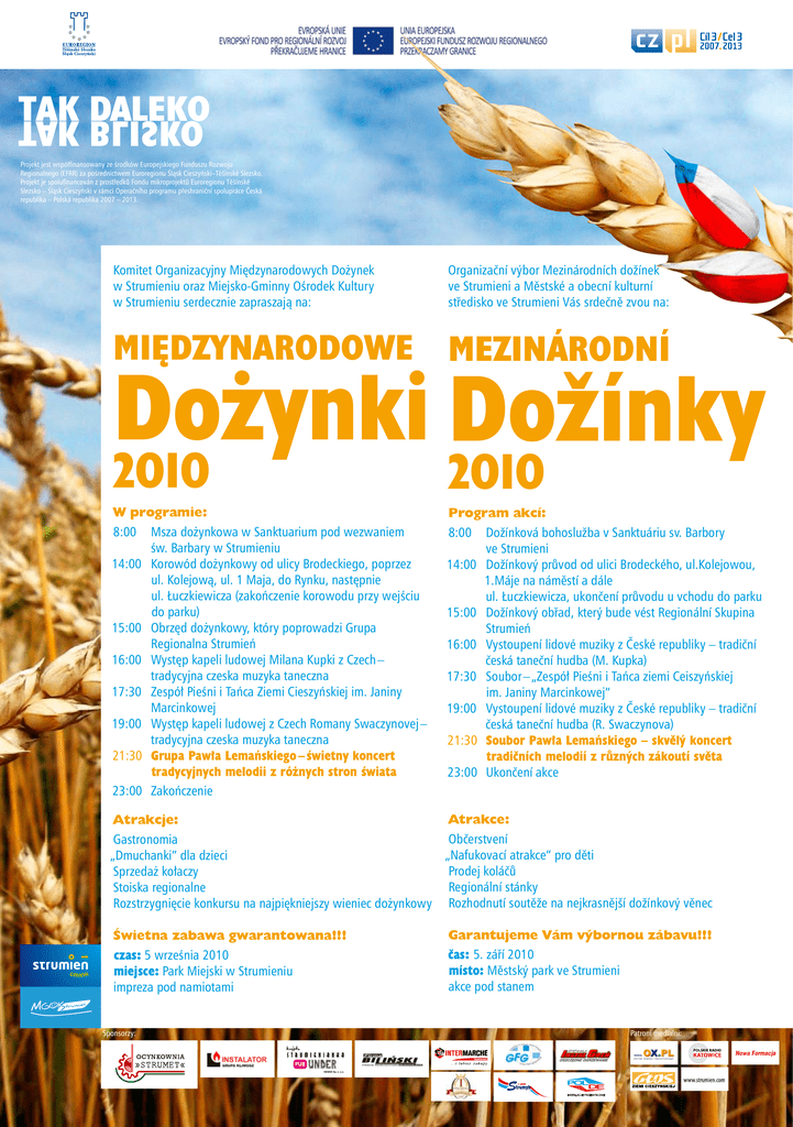 DALEKO TAK BLISKO Projekt jest współfinansowany ze środków Europejskiego Funduszu Rozwoju Regionalnego (EFRR) za pośrednictwem Euroregionu Śląsk Cieszyński–Těšínské Slezsko. Projekt je spolufinancován z prostředků Fondu mikroprojektů Euroregionu Těšínské Slezsko – Śląsk Cieszyński v rámci Operačního programu přeshraniční spolupráce Česká republika – Polská republika 2007 – 2013. Komitet Organizacyjny Międzynarodowych Dożynek w Strumieniu oraz Miejsko-Gminny Ośrodek Kultury w Strumieniu serdecznie zapraszają na: Organizační výbor Mezinárodních dožínek ve Strumieni a Městské a obecní kulturní středisko ve Strumieni Vás srdečně zvou na: Międzynarodowe Mezinárodní Dożynki Dožínky 2010 W programie: 8:00 Msza dożynkowa w Sanktuarium pod wezwaniem św. Barbary w Strumieniu 14:00 Korowód dożynkowy od ulicy Brodeckiego, poprzez ul. Kolejową, ul. 1 Maja, do Rynku, następnie ul. Łuczkiewicza (zakończenie korowodu przy wejściu do parku) 15:00 Obrzęd dożynkowy, który poprowadzi Grupa Regionalna Strumień 16:00 Występ kapeli ludowej Milana Kupki z Czech – tradycyjna czeska muzyka taneczna 17:30 Zespół Pieśni i Tańca Ziemi Cieszyńskiej im. Janiny Marcinkowej 19:00 Występ kapeli ludowej z Czech Romany Swaczynovej – tradycyjna czeska muzyka taneczna 21:30 Grupa Pawła Lemańskiego – świetny koncert tradycyjnych melodii z różnych stron świata 23:00 Zakończenie 2010 Program akcí: 8:00 Dožínková bohoslužba v Sanktuáriu sv. Barbory ve Strumieni 14:00 Dožínkový průvod od ulici Brodeckého, ul.Kolejowou, 1.Máje na náměstí a dále ul. Łuczkiewicza, ukončení průvodu u vchodu do parku 15:00 Dožínkový obřad, který bude vést Regionální Skupina Strumień 16:00 Vystoupení lidové muziky z České republiky – tradiční česká taneční hudba (M. Kupka) 17:30 Soubor – „Zespół Pieśni i Tańca ziemi Ceiszyńskiej im. Janiny Marcinkowej“ 19:00 Vystoupení lidové muziky z České republiky – tradiční česká taneční hudba (R. Swaczynova) 21:30 Soubor Pawła Lemańskiego – skvělý koncert tradičních melodií z různých zákoutí světa 23:00 Ukončení akce Atrakce: Atrakcje: Občerstvení Gastronomia „Nafukovací atrakce“ pro děti „Dmuchanki” dla dzieci Prodej koláčů Sprzedaż kołaczy Regionální stánky Stoiska regionalne Rozstrzygnięcie konkursu na najpiękniejszy wieniec dożynkowy Rozhodnutí soutěže na nejkrasnější dožínkový věnec Świetna zabawa gwarantowana!!! czas: 5 września 2010 miejsce: Park Miejski w Strumieniu impreza pod namiotami Sponsorzy: Garantujeme Vám výbornou zábavu!!! čas: 5. září 2010 místo: Městský park ve Strumieni akce pod stanem Patroni medialni: Nowa Formacja HEWEX Sp. z .o.o.