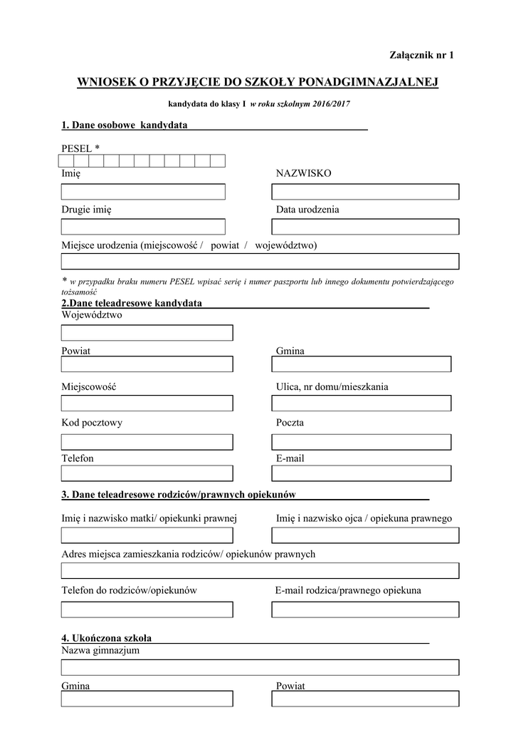 WNIOSEK O PRZYJĘCIE DO SZKOŁY PONADGIMNAZJALNEJ