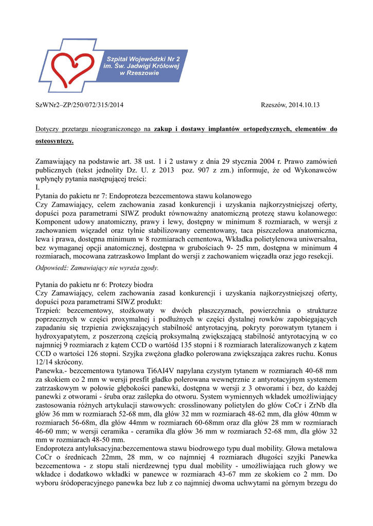 SzWNr2–ZP/250/072/315/2014 Rzeszów, 2014.10.13 Dotyczy przetargu nieograniczonego na zakup i dostawy implantów ortopedycznych, elementów do osteosyntezy. Zamawiający na podstawie art. 38 ust. 1 i 2 ustawy z dnia 29 stycznia 2004 r. Prawo zamówień publicznych (tekst jednolity Dz. U. z 2013 poz. 907 z zm.) informuje, że od Wykonawców wpłynęły pytania następującej treści: I. Pytania do pakietu nr 7: Endoproteza bezcementowa stawu kolanowego Czy Zamawiający, celem zachowania zasad konkurencji i uzyskania najkorzystniejszej oferty, dopuści poza parametrami SIWZ produkt równoważny anatomiczną protezę stawu kolanowego: Komponent udowy anatomiczny, prawy i lewy, dostępny w minimum 8 rozmiarach, w wersji z zachowaniem więzadeł oraz tylnie stabilizowany cementowany, taca piszczelowa anatomiczna, lewa i prawa, dostępna minimum w 8 rozmiarach cementowa, Wkładka polietylenowa uniwersalna, bez wymaganej opcji anatomicznej, dostępna w grubościach 9- 25 mm, dostępna w minimum 4 rozmiarach, mocowana zatrzaskowo Implant do wersji z zachowaniem więzadła oraz jego resekcji. Odpowiedź: Zamawiający nie wyraża zgody. Pytania do pakietu nr 6: Protezy biodra Czy Zamawiający, celem zachowania zasad konkurencji i uzyskania najkorzystniejszej oferty, dopuści poza parametrami SIWZ produkt: Trzpień: bezcementowy, stożkowaty w dwóch płaszczyznach, powierzchnia o strukturze poprzecznych w części proxymalnej i podłużnych w części dystalnej rowków zapobiegających zapadaniu się trzpienia zwiększających stabilność antyrotacyjną, pokryty porowatym tytanem i hydroxyapatytem, z poszerzoną częścią proksymalną zwiększającą stabilność antyrotacyjną w co najmniej 9 rozmiarach z kątem CCD o wartóśd 135 stopni i 8 rozmiarach lateralizowanych z kątem CCD o wartości 126 stopni. Szyjka zwężona gładko polerowana zwiększająca zakres ruchu. Konus 12/14 skrócony. Panewka.- bezcementowa tytanowa Ti6AI4V napylana czystym tytanem w rozmiarach 40-68 mm za skokiem co 2 mm w wersji presfit gładko polerowana wewnętrznie z antyrotacyjnym systemem zatrzaskowym w połowie głębokości panewki, dostępna w wersji z 3 otworami i bez, do każdej panewki z otworami - śruba oraz zaślepka do otworu. System wymiennych wkładek umożliwiający zastosowania różnych artykulacji stawowych: crosslinowany polietylen do głów CoCr i ZrNb dla głów 36 mm w rozmiarach 52-68 mm, dla głów 32 mm w rozmiarach 48-62 mm, dla głów 40mm w rozmiarach 56-68m, dla głów 44mm w rozmiarach 60-68mm oraz dla głów 28 mm w rozmiarach 46-60 mm; w wersji ceramika - ceramika dla głów 36 mm w rozmiarach 52-68 mm, dla głów 32 mm w rozmiarach 48-50 mm. Endoproteza antyluksacyjna:bezcementowa stawu biodrowego typu dual mobility. Głowa metalowa CoCr o średnicach 22mm, 28 mm, w co najmniej 4 rozmiarach długości szyjki Panewka bezcementowa - z stopu stali nierdzewnej typu dual mobility - umożliwiająca ruch głowy we wkładce i dodatkowo wkładki w panewce w rozmiarach 43-67 mm ze skokiem co 2 mm. Do wyboru śródoperacyjnego panewka bez lub z co najmniej dwoma uchwytami na górnym brzegu do zamocowania śrub stabilizujących oraz co najmniej dwa otwory na dodatkowe kołki mocujące. Zewnętrzna powłoka panewki pokryta hydroksyapatytem z specjalnym ożebrowaniem poprawiającym press-fit oraz działającym antyrotacyjnie. Brzeg gładko polerowany. Odpowiedź: Zamawiający nie wyraża zgody. II. 1. Czy Zamawiający wyrazi zgodę na złożenie oferty na; pakiet.1 gwoździe i płyty do osteosyntezy: - w pozycji 1 - gwóźdź do złamań przezkrętarzowych, kaniulowany, sterylny. Długość gwoździa 215 mm i 300-480 mm ze skokiem co 20 mm. Średnica części bliższej gwoździa 15.5 mm. Kąt szyjkowo-trzonowy 1200,1250 i 1300. Wygięcie gwoździa w części bliższej o wartości 4° na valgus. Promień wygięcia trzonu długich gwoździ w zależności od długości gwoździa- 1275 mm dla gwoździ długości 300-340 mm; 1400 mm dla gwoździ długości 360-400 mm; 1525 mm dla gwoździ długości 420-480mm. Pin antyrotacyjny ø 3,2 mm. Śruba b1okująca tytanowa sterylna, średnica 5.0 mm, długość 20-100 mm. Zaślepka w długościach 0, 5, 10 i 15 mm. Odpowiedź: Zamawiający nie wyraża zgody. - w pozycji 2- oferty osobno na sterylne tytanowe gwoździe udowe wprowadzane od dołu i osobno wprowadzane od góry, prawe i lewe? Gwoździe wprowadzane od góry: średnica 9.3 mm w długościach 240-440mm; średnice 10-14 w długościach 240-480mm. Gwoździe wprowadzane od dołu w średnicach 10 mm; 11.5 mm; 13 mm i długościach 160-240 mm oraz 280-440 mm. Zaślepki kaniulowane w długościach O-15 mm. śruby blokujące dystalne z pełnym gwintem w długościach 20-100 mm. Możliwość zastosowania kompresji. Otwór w części dalszej gwoździa: dla gwoździ antegrade 2-12 mm, dla gwoździ retrograde 9-15 mm. śruba blokująca tytanowa sterylna średnica 5.0 w długościach 20-100 mm. Zaślepka tytanowa sterylna w długościach 0-15 mm. Odpowiedź: Zamawiający nie wyraża zgody. -w pozycji 3-. gwóźdź tytanowy piszczelowy, umożliwiający zaopatrzenie złamań bliższej i dalszej piszczeli, z możliwością wielopłaszczyznowego blokowania proksymalnego i dystalnego za pomocą wkrętów o średnicy zależnej od średnicy gwoździa; proksymalnie dla wszystkich średnic wkręty 5.0 mm, dystalnie dla gwoździ o średnicy 8.3 śruby o średnicy 4.0 mm i śruby o średnicy 5,0 mm dla reszty średnic gwoździ, wszystkie wkręty w długościach 20-100 mm; możliwość kompresji odłamów za pomocą śruby z niepełnym gwintem, zaślepki kaniulowane w długościach 015 mm; średnice gwoździa 8.3 mm; 9,3 mm oraz 10-14 mm, wszystkie średnice w długościach 240440 mm. śruby blokujące dystalnie o średnicy 4.0 i 5.0 w długościach 20-100 mm. Możliwość zastosowania kompresji. Wygięcie gwoździa w części bliższej o wartości 10 0 w części dalszej o wartości 20, Otwory w części dalszej w odleg