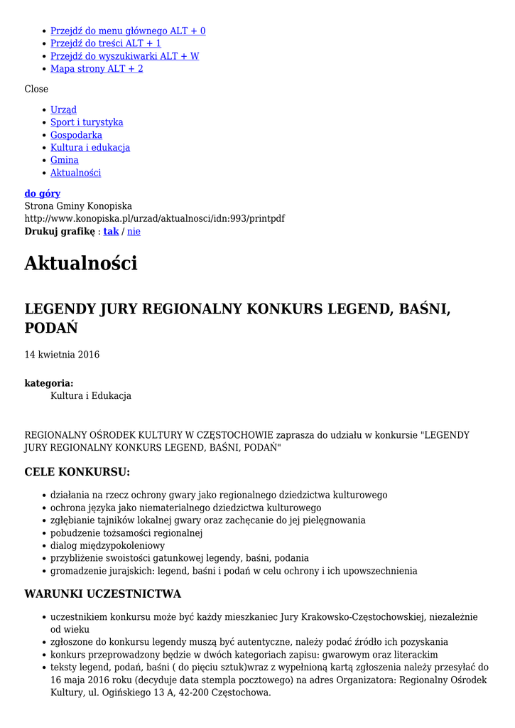 Przejdź do menu głównego ALT + 0 Przejdź do treści ALT + 1 Przejdź do wyszukiwarki ALT + W Mapa strony ALT + 2 Close Urząd Sport i turystyka Gospodarka Kultura i edukacja Gmina Aktualności do góry Strona Gminy Konopiska http://www.konopiska.pl/urzad/aktualnosci/idn:993/printpdf Drukuj grafikę : tak / nie Aktualności LEGENDY JURY REGIONALNY KONKURS LEGEND, BAŚNI, PODAŃ 14 kwietnia 2016 kategoria: Kultura i Edukacja REGIONALNY OŚRODEK KULTURY W CZĘSTOCHOWIE zaprasza do udziału w konkursie "LEGENDY JURY REGIONALNY KONKURS LEGEND, BAŚNI, PODAŃ" CELE KONKURSU: działania na rzecz ochrony gwary jako regionalnego dziedzictwa kulturowego ochrona języka jako niematerialnego dziedzictwa kulturowego zgłębianie tajników lokalnej gwary oraz zachęcanie do jej pielęgnowania pobudzenie tożsamości regionalnej dialog międzypokoleniowy przybliżenie swoistości gatunkowej legendy, baśni, podania gromadzenie jurajskich: legend, baśni i podań w celu ochrony i ich upowszechnienia WARUNKI UCZESTNICTWA uczestnikiem konkursu może być każdy mieszkaniec Jury Krakowsko-Częstochowskiej, niezależnie od wieku zgłoszone do konkursu legendy muszą być autentyczne, należy podać źródło ich pozyskania konkurs przeprowadzony będzie w dwóch kategoriach zapisu: gwarowym oraz literackim teksty legend, podań, baśni ( do pięciu sztuk)wraz z wypełnioną kartą zgłoszenia należy przesyłać do 16 maja 2016 roku (decyduje data stempla pocztowego) na adres Organizatora: Regionalny Ośrodek Kultury, ul. Ogińskiego 13 A, 42-200 Częstochowa. uczestnicy konkursu zaprezentują nadesłane przez siebie teksty osobiście, podczas imprezy Jura ROK Festiwal lub wykona to osoba trzecia, współpracująca z Organizatorem (sposób prezentacji prosimy zaznaczyć w karcie zgłoszenia). nadesłane legendy przechodzą na własność Organizatora, który najciekawsze zarchiwizuje a po kilku edycjach konkursu wyda drukiem. oceny zaprezentowanych legend, podań baśni dokona jury składające się z etnografów, folklorystów, znawców regionu i jego dziedzictwa kulturowego. o kolejności występów i programie przesłuchań uczestnicy zostaną poinformowani przez Organizatora finał konkursu odbędzie się 5 czerwca 2016 roku podczas imprezy Jura ROK Festiwal w Niegowie. informacji na temat konkursu udziela: Ewelina Mędrala-Młyńska Instruktor do spraw kultury ludowej 34 366 59 65 [email protected] Organizator zastrzega sobie prawo zmian w harmonogramach z przyczyn od niego niezależnych. O wszystkich zmianach zgłoszeni uczestnicy zostaną poinformowani telefonicznie. kategoria: Powiązane pliki [1] format Nazwa pliku Data publikacji Rozmiar Karta zgłoszenia 16-04-14 09:18 doc powrót do listy aktualności 19.5KB Pobierz pobierz plik: Karta zgłoszenia
