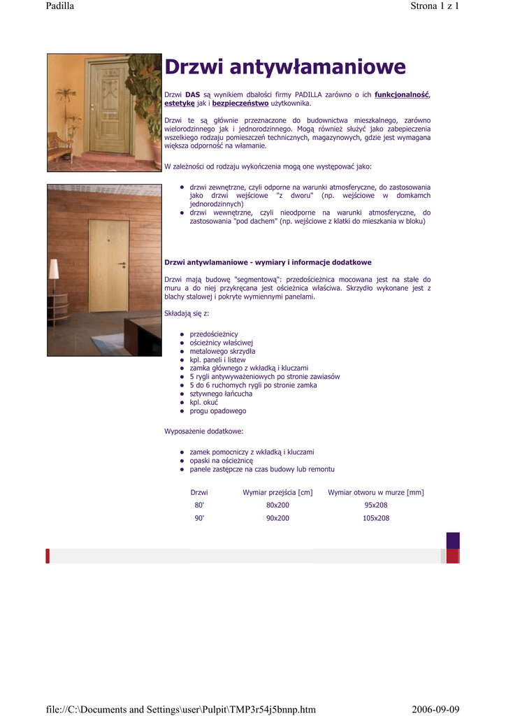 Padilla Strona 1 z 1 Drzwi antywłamaniowe Drzwi DAS są wynikiem dbałości firmy PADILLA zarówno o ich funkcjonalność, estetykę jak i bezpieczeństwo uŜytkownika. Drzwi te są głównie przeznaczone do budownictwa mieszkalnego, zarówno wielorodzinnego jak i jednorodzinnego. Mogą równieŜ słuŜyć jako zabepieczenia wszelkiego rodzaju pomieszczeń technicznych, magazynowych, gdzie jest wymagana większa odporność na włamanie. W zaleŜności od rodzaju wykończenia mogą one występować jako: drzwi zewnętrzne, czyli odporne na warunki atmosferyczne, do zastosowania jako drzwi wejściowe "z dworu" (np. wejściowe w domkamch jednorodzinnych) drzwi wewnętrzne, czyli nieodporne na warunki atmosferyczne, do zastosowania "pod dachem" (np. wejściowe z klatki do mieszkania w bloku) Drzwi antywlamaniowe - wymiary i informacje dodatkowe Drzwi mają budowę "segmentową": przedościeŜnica mocowana jest na stałe do muru a do niej przykręcana jest ościeŜnica właściwa. Skrzydło wykonane jest z blachy stalowej i pokryte wymiennymi panelami. Składają się z: przedościeŜnicy ościeŜnicy właściwej metalowego skrzydła kpl. paneli i listew zamka głównego z wkładką i kluczami 5 rygli antywywaŜeniowych po stronie zawiasów 5 do 6 ruchomych rygli po stronie zamka sztywnego łańcucha kpl. okuć progu opadowego WyposaŜenie dodatkowe: zamek pomocniczy z wkładką i kluczami opaski na ościeŜnicę panele zastępcze na czas budowy lub remontu Drzwi Wymiar przejścia [cm] Wymiar otworu w murze [mm] 80' 80x200 95x208 90' 90x200 105x208 file://C:\Documents and Settings\user\Pulpit\TMP3r54j5bnnp.htm 2006-09-09