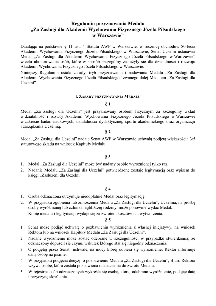 Regulamin przyznawania Medalu „Za Zasługi dla Akademii Wychowania Fizycznego Józefa Piłsudskiego w Warszawie” Działając na podstawie § 11 ust. 4 Statutu AWF w Warszawie, w rocznicę obchodów 80-lecia Akademii Wychowania Fizycznego Józefa Piłsudskiego w Warszawie, Senat Uczelni ustanawia Medal „Za Zasługi dla Akademii Wychowania Fizycznego Józefa Piłsudskiego w Warszawie” w celu uhonorowania osób, które w sposób szczególny zasłużyły się dla działalności i rozwoju Akademii Wychowania Fizycznego Józefa Piłsudskiego w Warszawie. Niniejszy Regulamin ustala zasady, tryb przyznawania i nadawania Medalu „Za Zasługi dla Akademii Wychowania Fizycznego Józefa Piłsudskiego” zwanego dalej Medalem „Za Zasługi dla Uczelni”. I. ZASADY PRZYZNAWANIA MEDALU §1 Medal „Za zasługi dla Uczelni” jest przyznawany osobom fizycznym za szczególny wkład w działalność i rozwój Akademii Wychowania Fizycznego Józefa Piłsudskiego w Warszawie w zakresie badań naukowych, działalności dydaktycznej, sportu akademickiego oraz organizacji i zarządzania Uczelnią. §2 Medal „Za Zasługi dla Uczelni” nadaje Senat AWF w Warszawie uchwałą podjętą większością 3/5 statutowego składu na wniosek Kapituły Medalu. §3 1. 2. Medal „Za Zasługi dla Uczelni” może być nadany osobie wyróżnionej tylko raz. Nadanie Medalu „Za Zasługi dla Uczelni” potwierdzone zostaje legitymacją oraz wpisem do księgi „Zasłużeni dla Uczelni”. §4 1. 2. Osoba odznaczona otrzymuje nieodpłatnie Medal oraz legitymację. W przypadku zgubienia lub zniszczenia Medalu „Za Zasługi dla Uczelni”, Uczelnia, na prośbę osoby wyróżnianej lub członka najbliższej rodziny, może ponownie wydać Medal. Kopię medalu i legitymacji wydaje się za zwrotem kosztów ich wytworzenia. §5 1. Senat może podjąć uchwałę o pozbawieniu wyróżnienia z własnej inicjatywy, na wniosek Rektora lub na wniosek Kapituły Medalu „Za Zasługi dla Uczelni”. Nadane wyróżnienie może zostać odebrane w szczególności w przypadku stwierdzenia, że odznaczony dopuścił się czynu, wskutek którego stał się niegodny odznaczenia. O podjętej przez Senat uchwale, na mocy której odbiera się wyróżnienie, Rektor informuje daną osobę na piśmie. W przypadku podjęcia decyzji o pozbawieniu Medalu „Za Zasługi dla Uczelni”, Biuro Rektora wzywa osobę, która została pozbawiona odznaczenia do zwrotu Medalu. W rejestrze osób odznaczonych wykreśla się osobę, której odebrano wyróżnienie, podając datę i przyczynę skreślenia. 2. 3. 4. 5. II. TRYB WYSTĘPOWANIA Z WNIOSKAMI §6 1. 2. 3. 4. 5. Z wnioskiem o przyznanie Medalu „Za Zasługi dla Uczelni” występuje Rektor z inicjatywy własnej lub na wniosek przedstawiony przez prorektorów, dziekanów, Kanclerza oraz organizacji społecznych działających w Uczelni: Stowarzyszenia Absolwentów AWF w Warszawie, związków zawodowych działających w Uczelni oraz akademickich klubów sportowych AZS AWF Warszawa i AZS AWF Biała Podlaska. Wniosek Dziekana powinien być zaopiniowany przez Radę Wydziału. Wnioski o przyznanie Medalu „Za Zasługi dla Uczelni” składane są w Biurze Rektora w terminie do 31 maja roku akademickiego poprzedzającego inaugurację, na której zostanie przyznany medal lub z dwumiesięcznym wyprzedzeniem innej, ważnej dla Uczelni, uroczystości (np. Święto Uczelni). Wniosek o przyznanie Medalu „Za Zasługi dla Uczelni” musi być uzasadniony na piśmie. Uzasadnienie wniosku powinno zawierać opisy konkretnych działań, wybitnych osiągnięć i zasług osoby przedstawionej do uhonorowania. Do wniosku dołącza się ocenę osiągnięć kandydata do Medalu. Recenzenta dorobku powołuje Rektor. Wniosek o przyznanie Medalu „Za Zasługi dla Uczelni” w formie pisemnej należy kierować do Kapituły Medalu. §7 1. 2. 3. 4. 5. 6. 7. Kapituła Medalu, składa się z 7 osób o uznanym autorytecie, powołanych przez Senat Uczelni, na wniosek Rektora, spośród aktualnie zatrudnionych lub emerytowanych pracowników Uczelni. Co 4 lata Rektor może wystąpić do Senatu z wnioskiem o zmianę 4 członków Kapituły i powołanie nowych osób. Pełnienie funkcji w Kapitule ustaje w przypadku: 1) odwołania przez Senat Uczelni, 2) rezygnacji z udziału w Kapitule, 3) śmierci członka Kapituły. W przypadku wystąpienia sytuacji określonej w ust. 2 Senat Uczelni, na wniosek Rektora, uzupełnia skład Kapituły o nowych członków. Kapituła Medalu na pierwszym posiedzeniu, które otwiera Rektor, wybiera w głosowaniu tajnym przewodniczącego. Podstawą działania Kapituły Medalu jest uchwalony przez nią Regulamin zatwierdzony uchwałą Senatu. Rektor ma prawo sprzeciwu wobec Uchwał Kapituły. Uchwały Kapituły są podejmowane w głosowaniu tajnym zwykłą większością głosów. W przypadku równej liczby głosów decyduje głos przewodniczącego Kapituły. Kapituła rozpatruje wnioski o przyznanie Medali, przygotowuje opinię i projekt Uchwały Senatu w przedmiocie nadania Medalu. Wniosek o przyznanie Medalu „Za Zasługi dla Uczelni” Rektorowi, Prorektorom, Dziekanom, Kanclerzowi, oraz członkom Kapituły może być przedstawiony dopiero po zakończeniu piastowania przez nich tego stanowiska (po wygaśnięciu mandatu). III. TRYB WRĘCZANIA MEDALU §8 1. O fakcie przyznania Medalu „Za Zasługi dla Uczelni” Biuro Rektora zawiadamia wyróżnione osoby, podając jednocześnie datę dekoracji. 2. 3. 4. 5. 6. Osoba, której przyznano Medal „Za Zasługi dla Uczelni”, otrzymuje go wraz z legitymacją. Medal z legitymacją wręcza Rektor (lub osoba przez niego upoważniona) bezpośrednio osobie uhonorowanej lub jej przedstawicielowi w dniu uroczystej inauguracji roku akademickiego lub podczas uroczystości związanych z obchodami Święta Uczelni. W uzasadnionych przypadkach Medal „Za Zasługi dla Uczelni” może być nadany i wręczany podczas innych uroczystości uczelnianych lub na zwyczajnym l